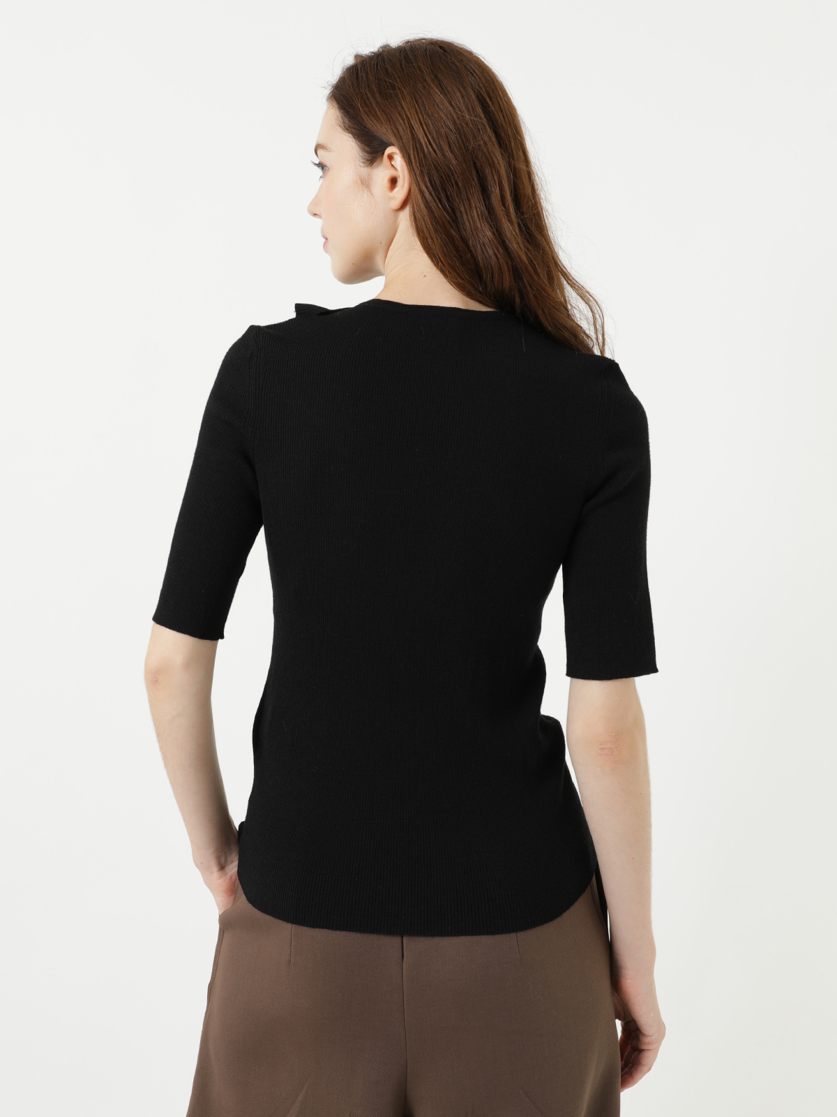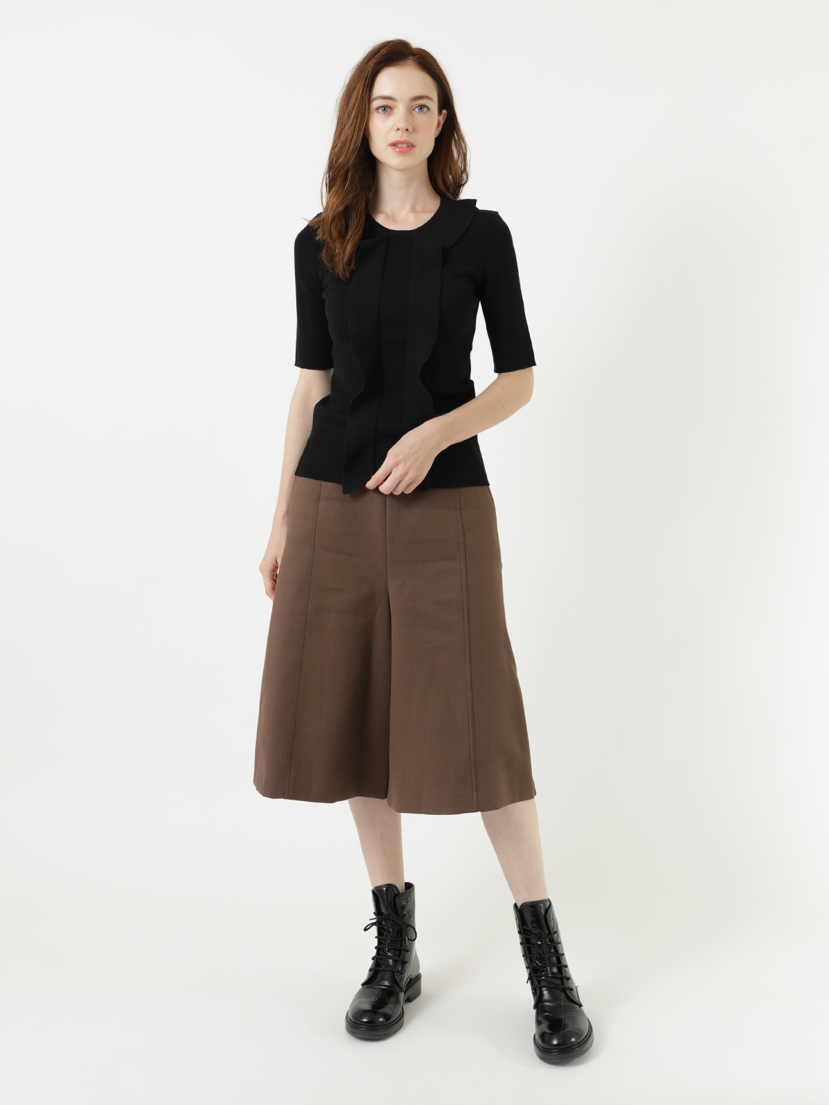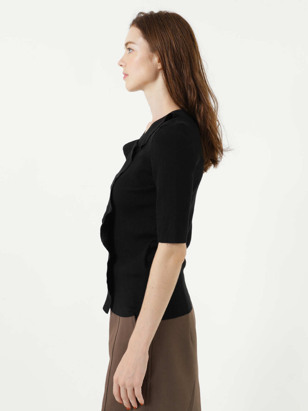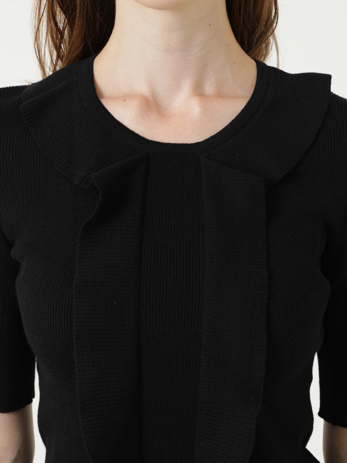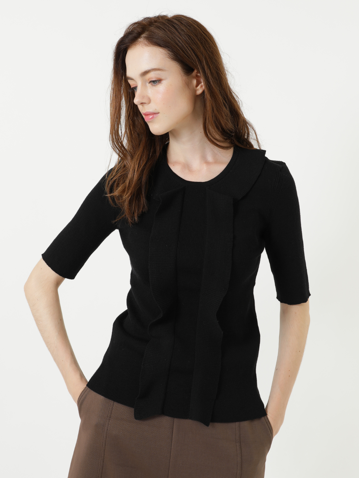 滑らかでソフトフィットな風合いが嬉しいピュア ウール ラッフル ニット。フリルカラーから繋がる縦のラッフルがワントーンブラックに映える大人フェミニンなアクセントです。すっきりとした首元とシャープな五分丈袖でコンパクトなフォルム。トレンドのボリュームボトムとも相性が良く、甘辛MIXなスタイリングにもぴったりのおすすめアイテムです。<ポケット> なし <スタイル>ラウンドネック、五分丈袖