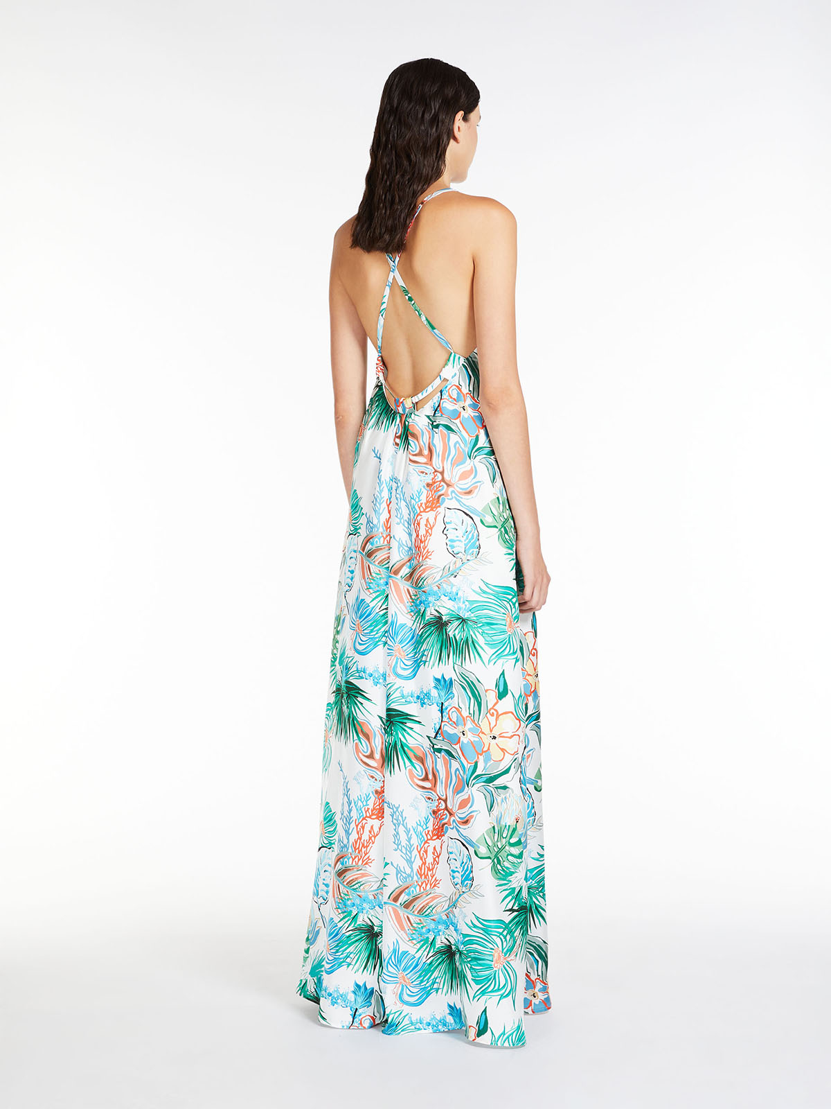 シルエットは、クロスオーバーのショルダーストラップが特徴的なリラックスしたマキシ丈。