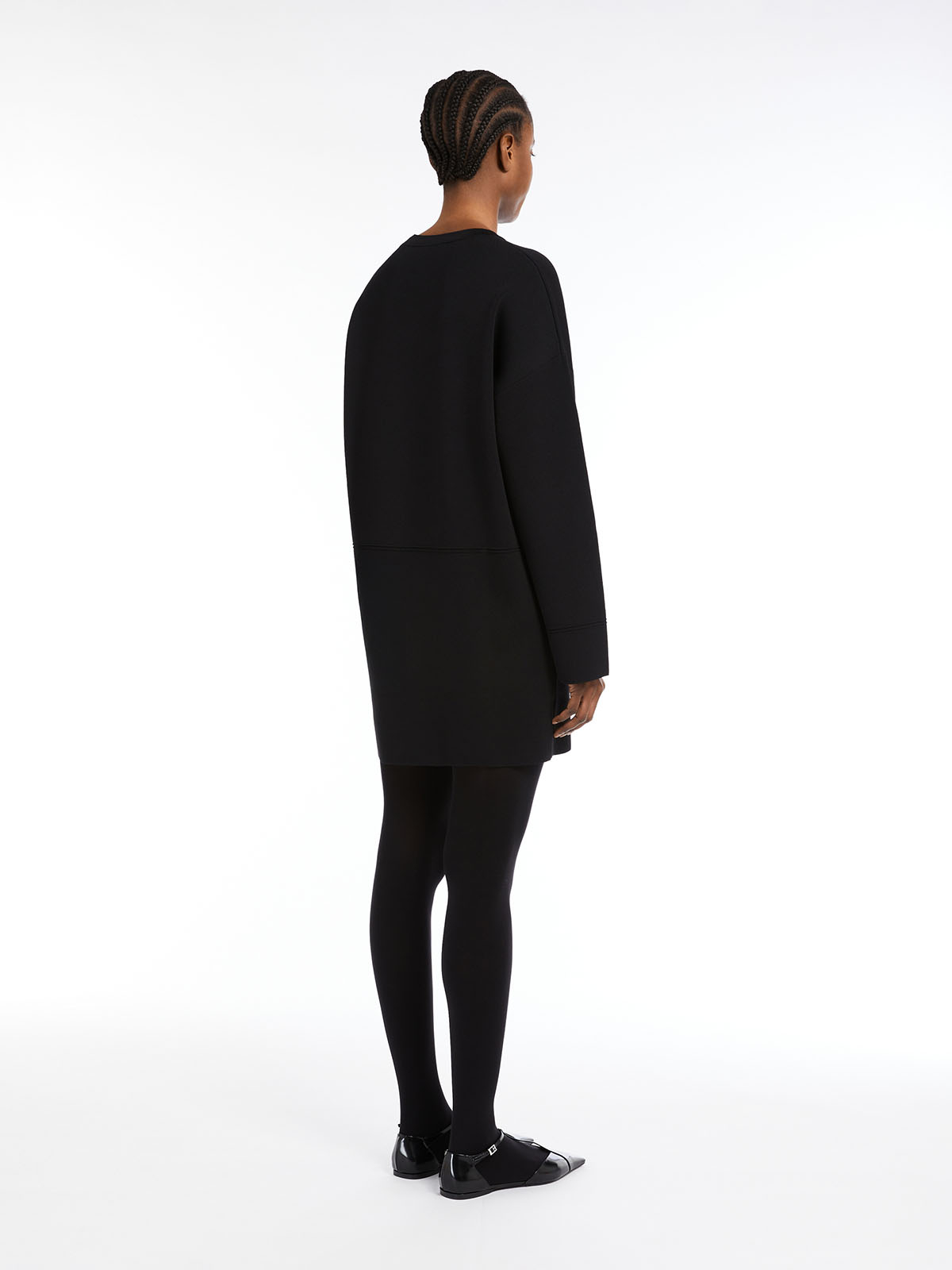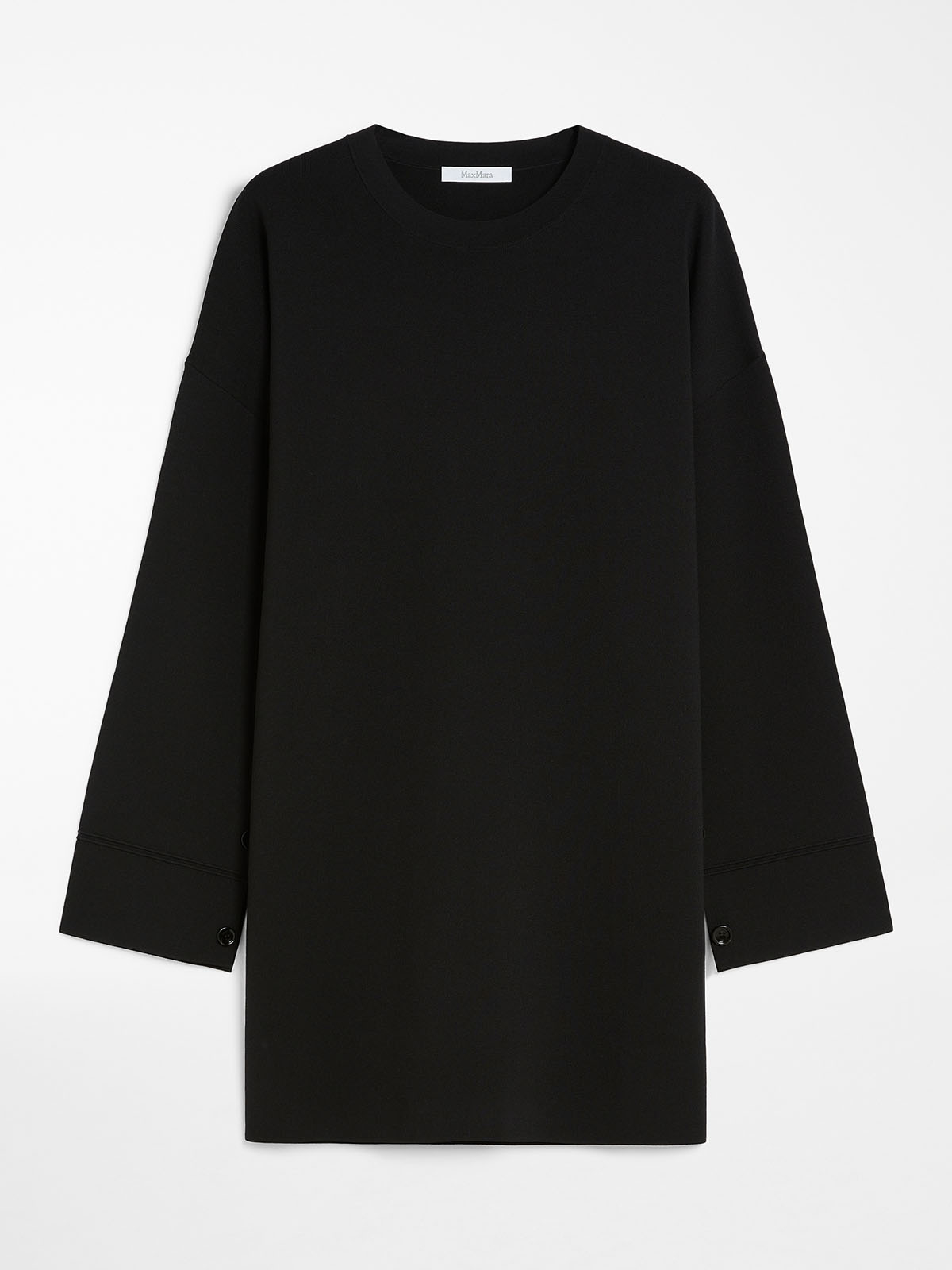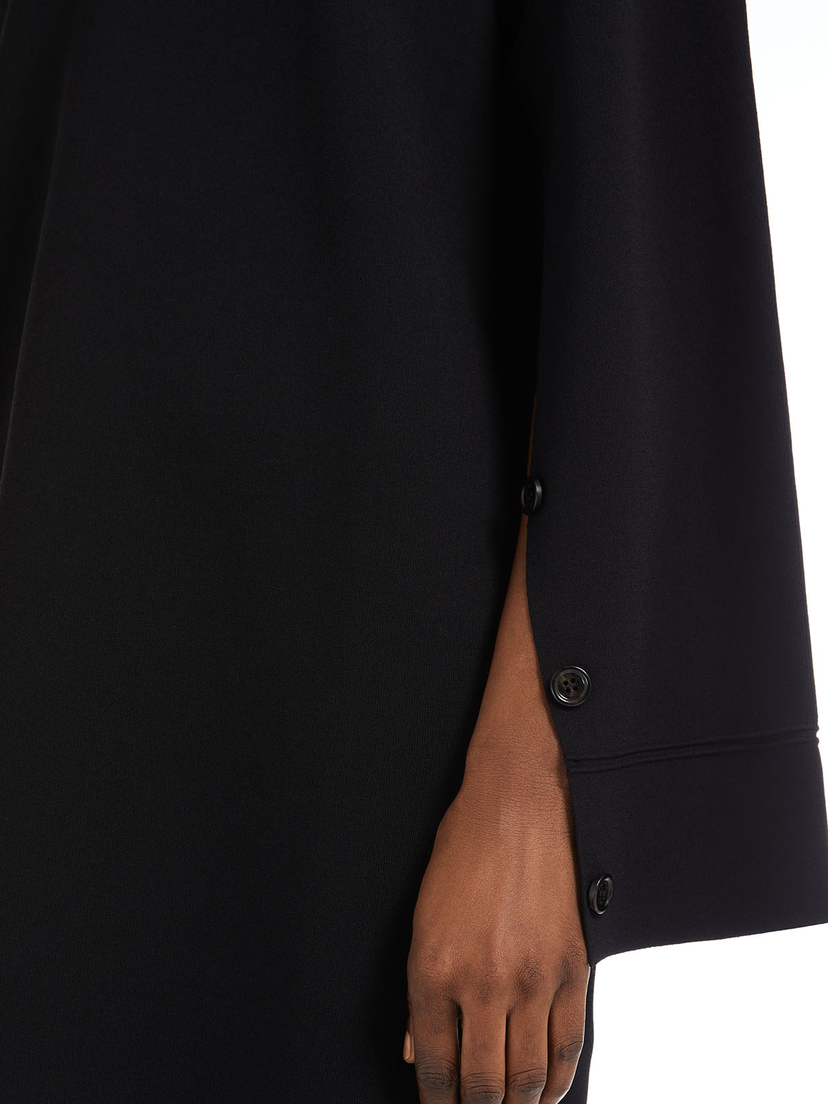 ビスコースクレープのニットミニドレス。18ゲージで編まれたビスコースニットは、ストレッチを効かせ薄手でソフトな肌触りに仕上がっています。シルエットはクルーネックのゆったりとしたフィット感が特徴的。袖の内側にボタンで開閉可能なスリットが入り、ボタンを外して着用するとケープの様に着ていただけます。<ポケット>なし<スタイル>クルーネック