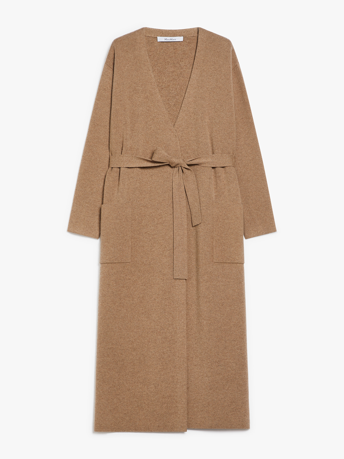 シンプルなデザインにパッチポケットが目を引くロングカーディガン。
