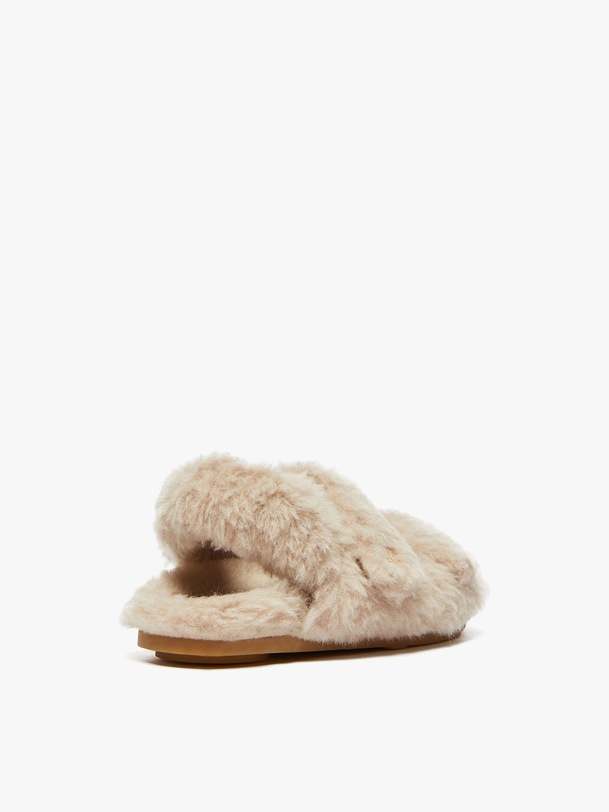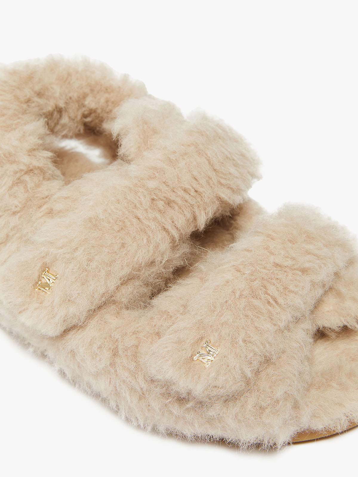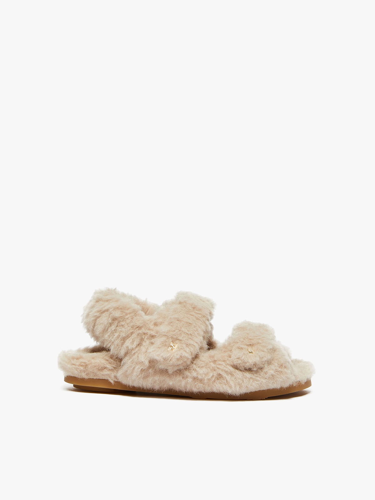 マックスマーラのアイコン、テディベアコートと同じ生地で作られた秋冬ムードのテディ サンダル。