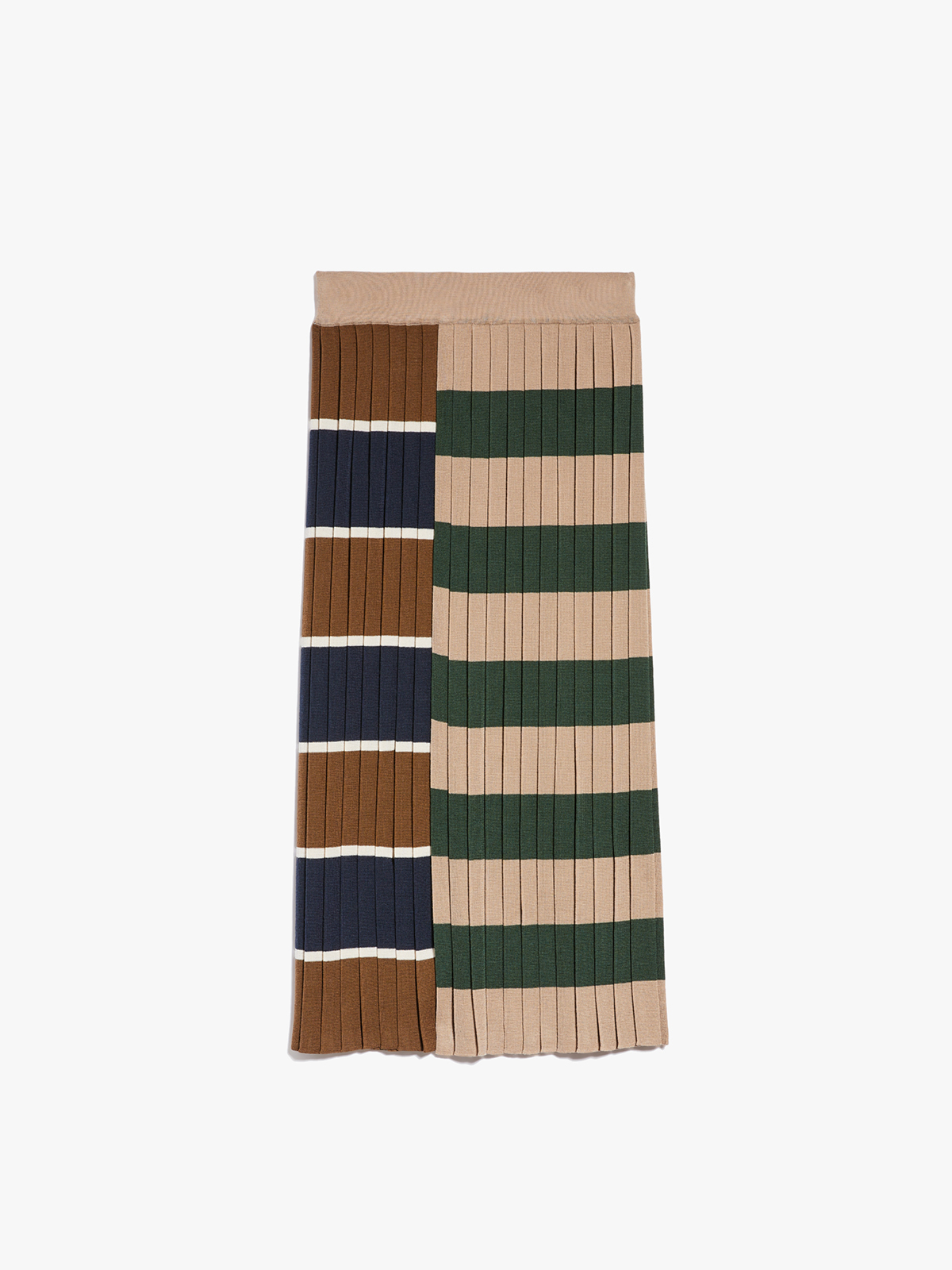 左右で印象の違うボーダーをあしらったデザインと、カラー違いでシンプルな単色もあるウールプリーツスカート。