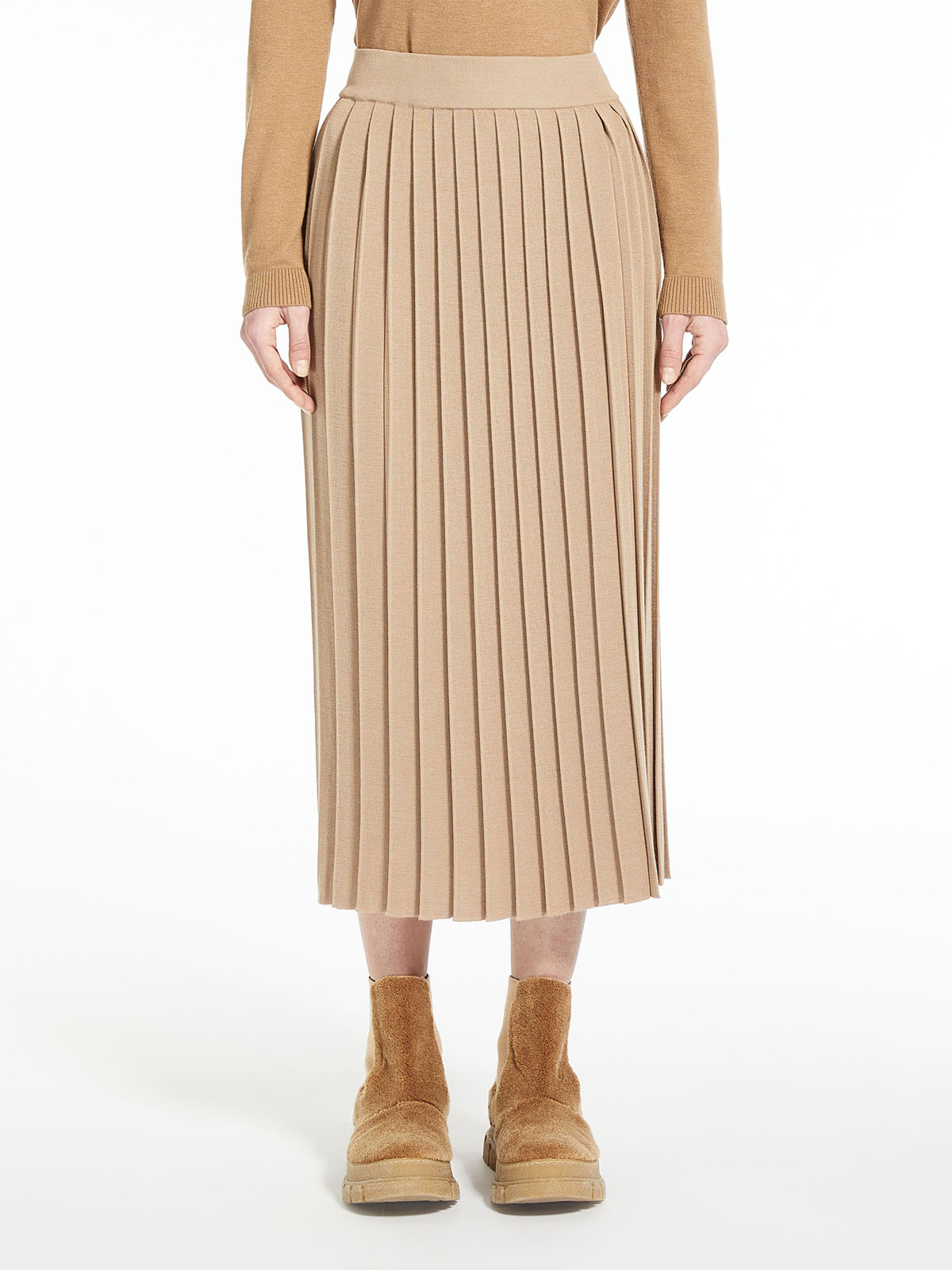 伸縮性のあるウエストバンドに、体の動きに合わせてプリーツが揺れるフェミニンなロングレングス。