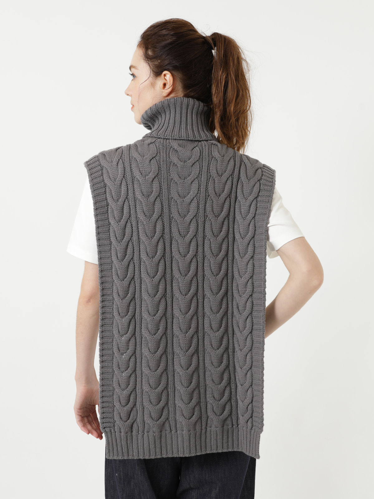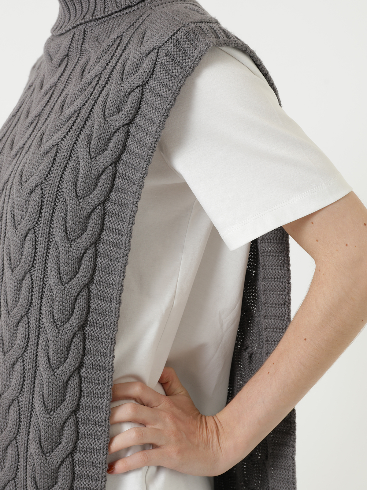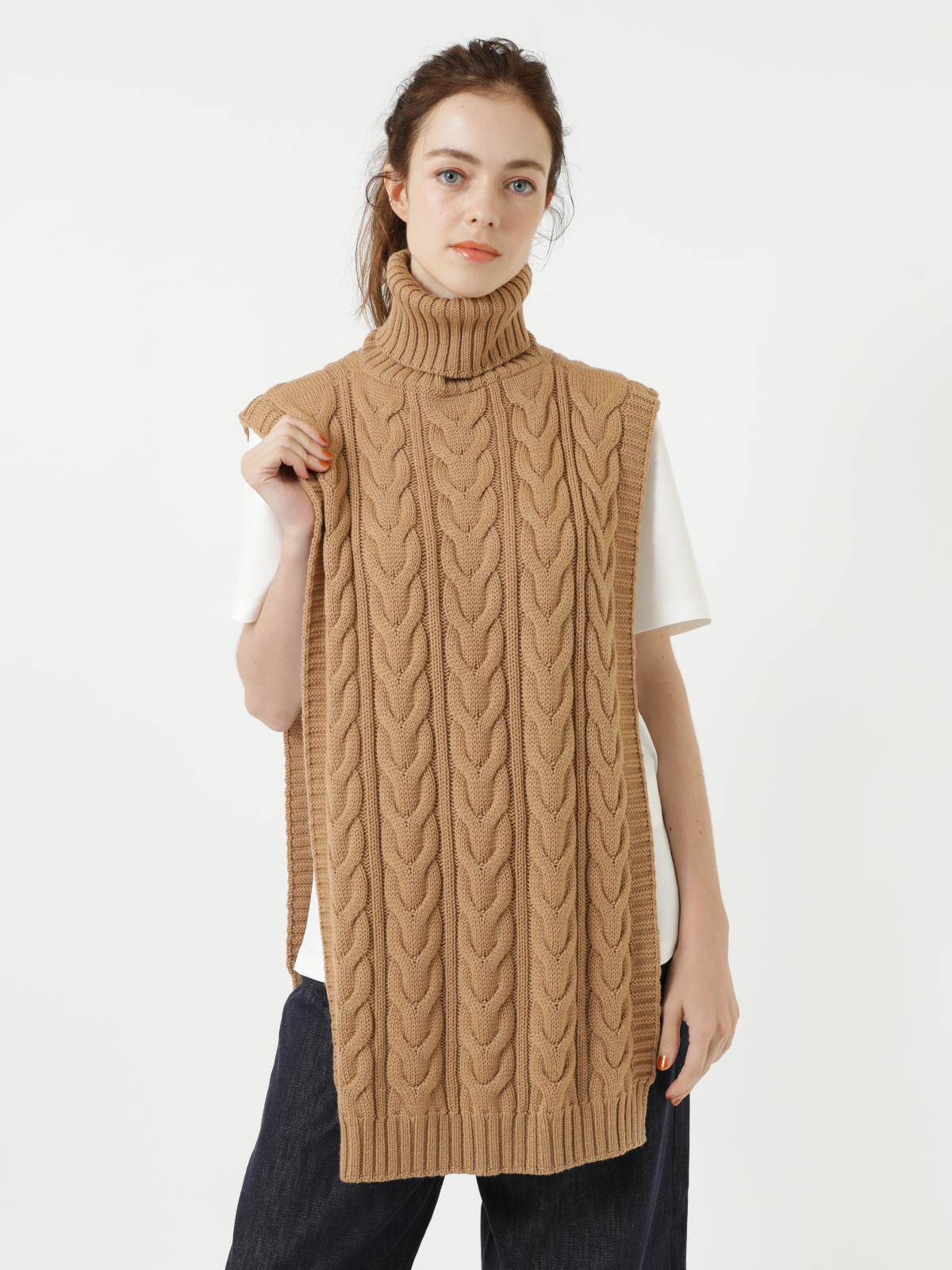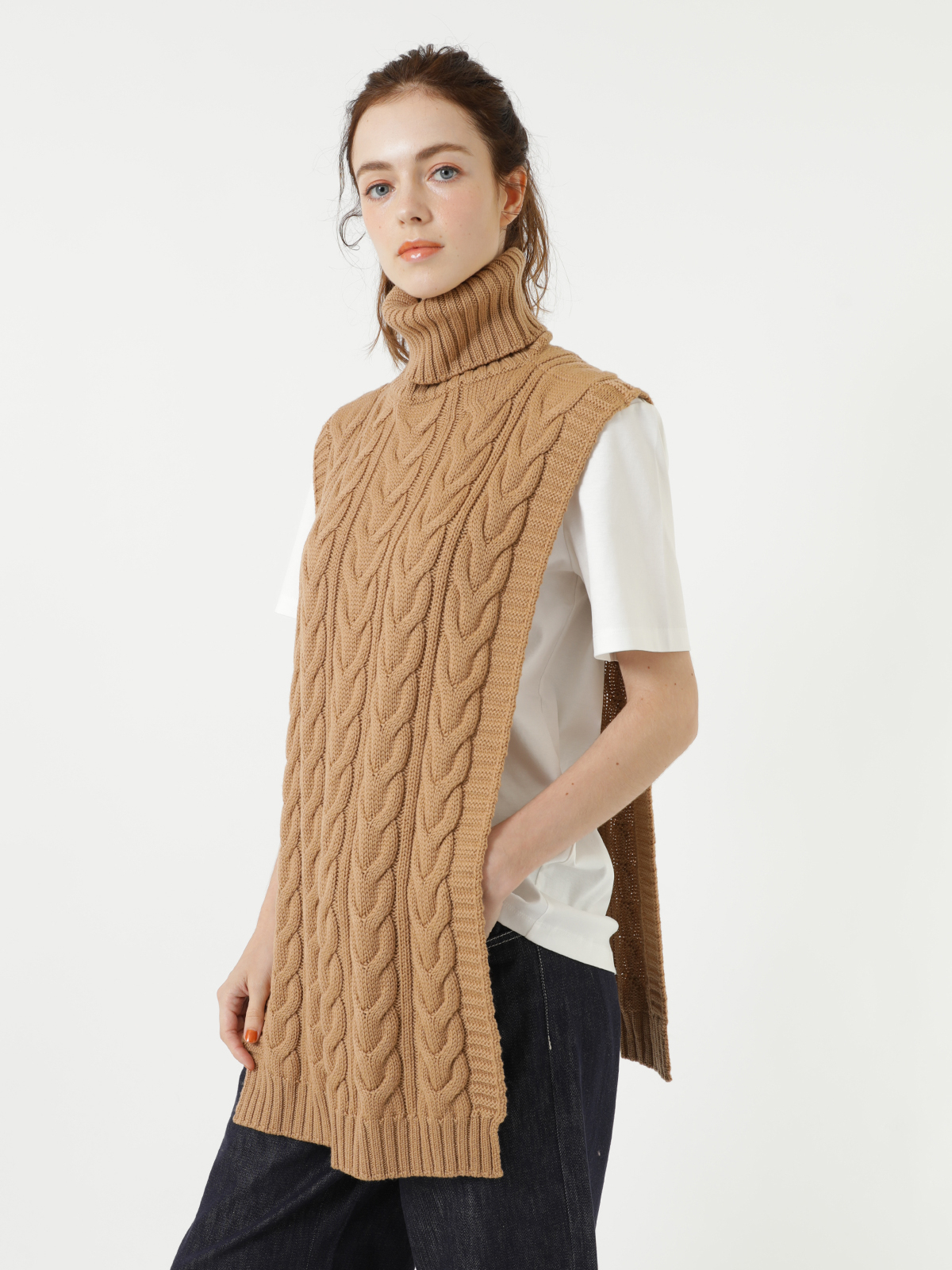 ざっくりとしたケーブル編みが秋冬らしいピュア ウール ポンチョ。暖かみのある風合いの生地は、ウールならではの柔らかな肌触りとふっくらとした皺になりにくい機能性が魅力です。首元はタートルネックになったノースリーブニットのようにお召しいただける一枚。ブラウスやカットソーだけでなく、真冬はダウンコートに組み合わせても。<ポケット>なし<スタイル>身幅:45cm×着丈:70cm