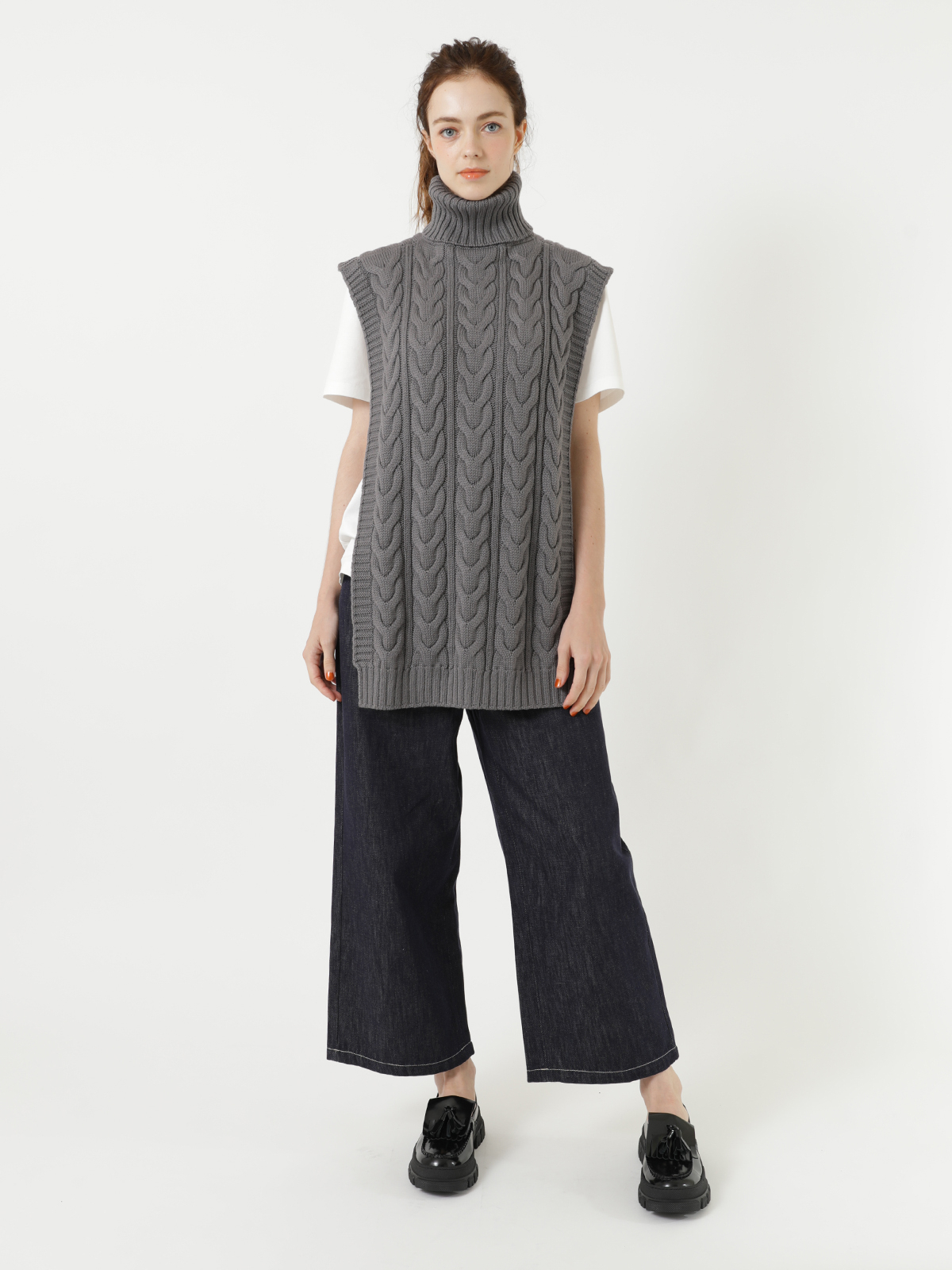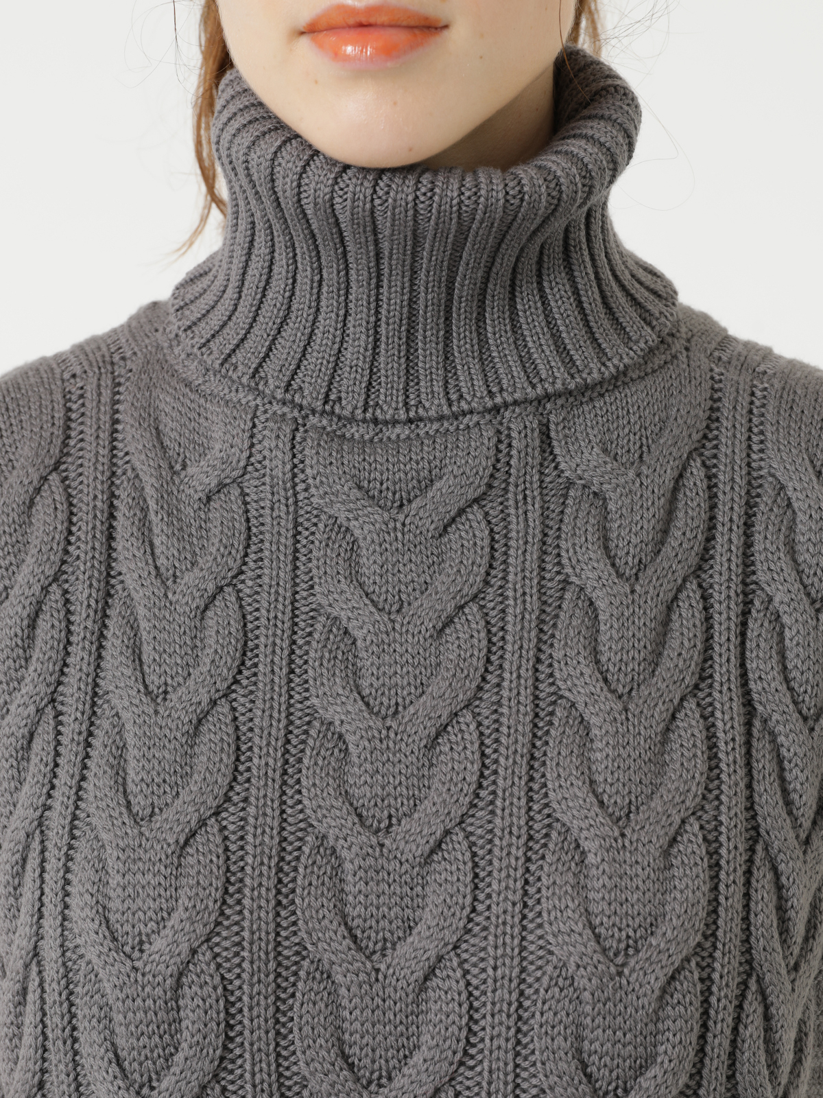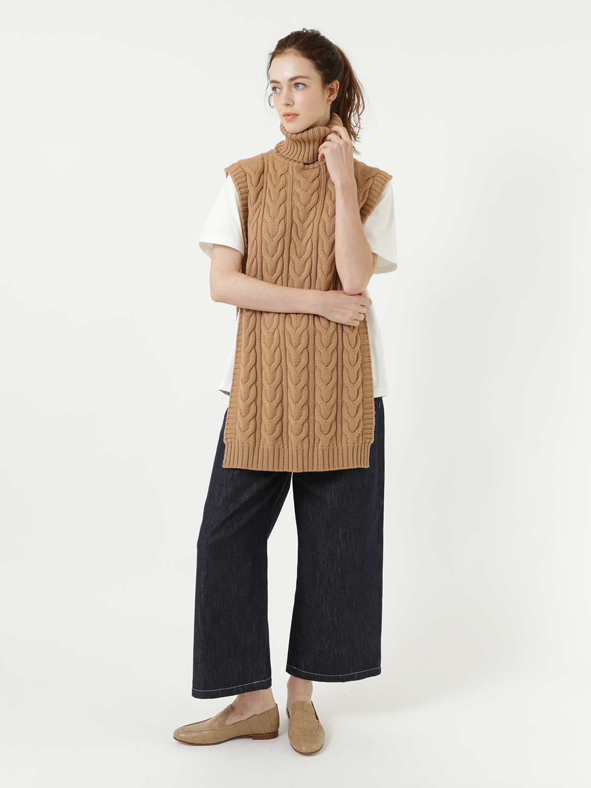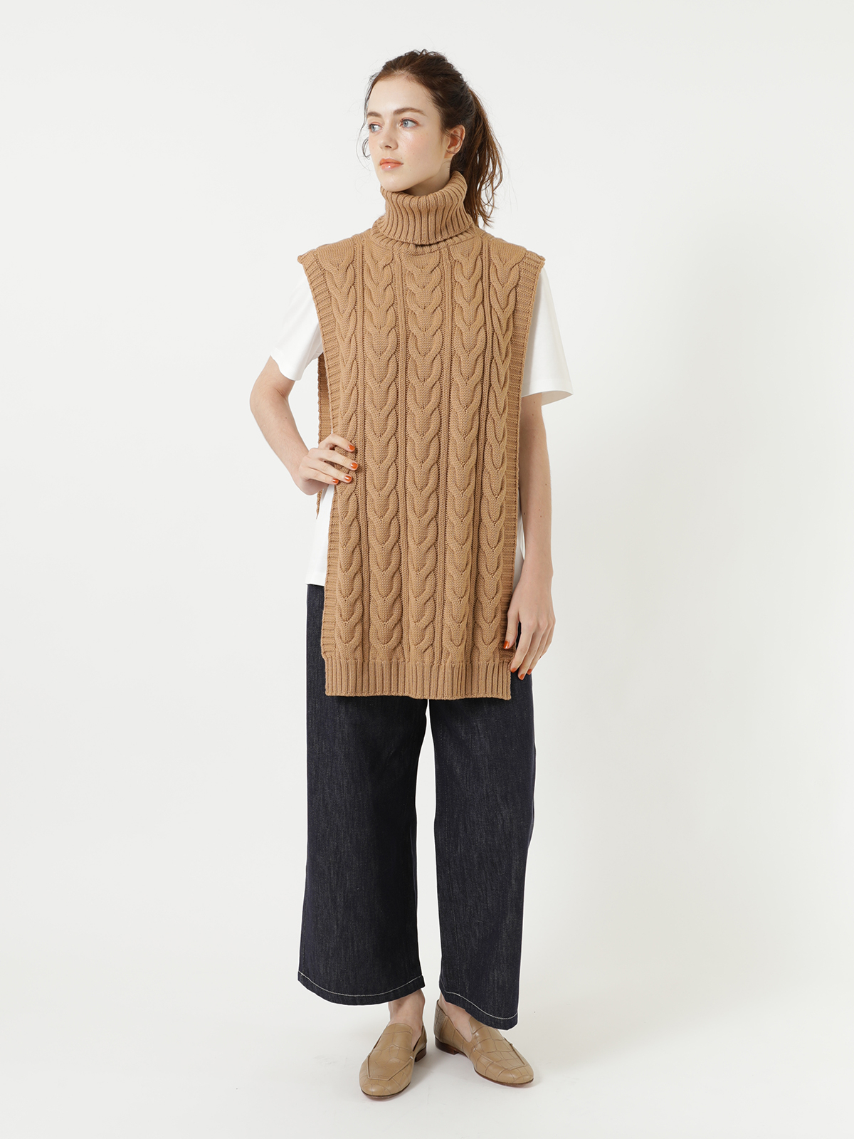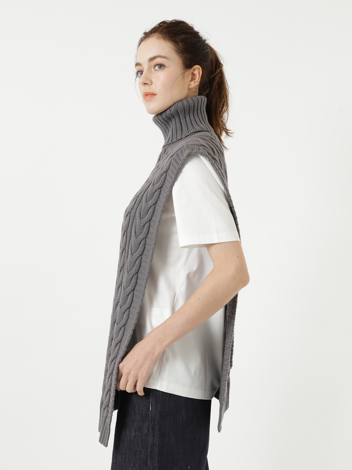 ざっくりとしたケーブル編みが秋冬らしいピュア ウール ポンチョ。暖かみのある風合いの生地は、ウールならではの柔らかな肌触りとふっくらとした皺になりにくい機能性が魅力です。首元はタートルネックになったノースリーブニットのようにお召しいただける一枚。ブラウスやカットソーだけでなく、真冬はダウンコートに組み合わせても。<ポケット>なし<スタイル>身幅:45cm×着丈:70cm