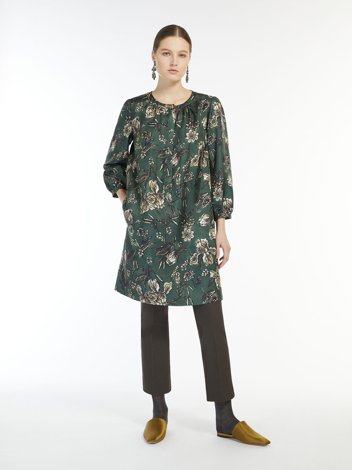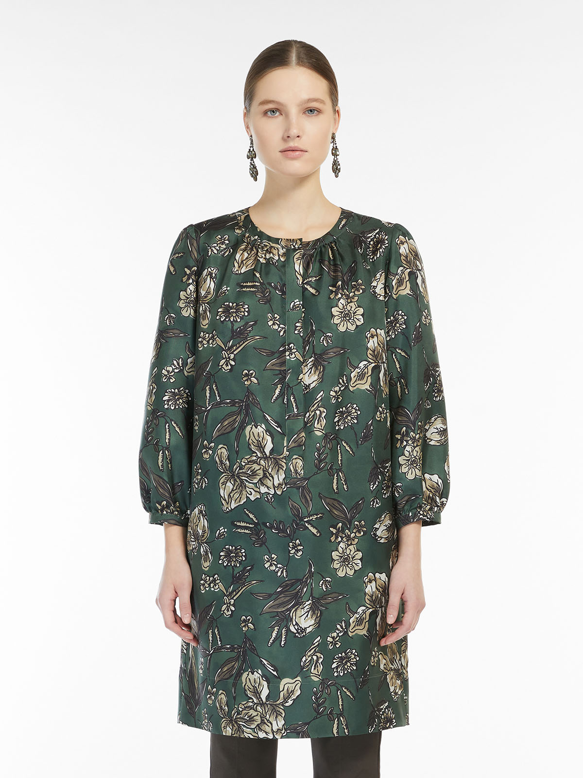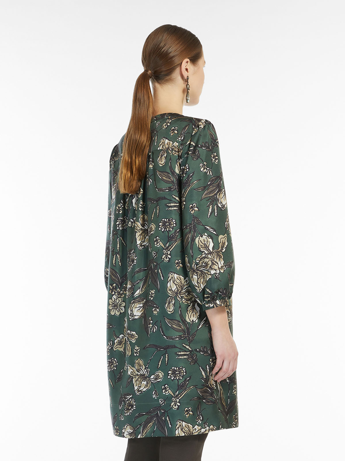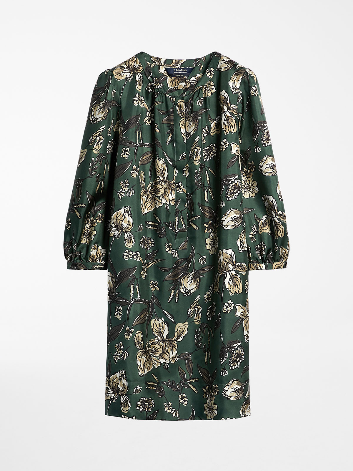 マジカルフラワーとアイリスのプリントをあしらったシルクドレス。