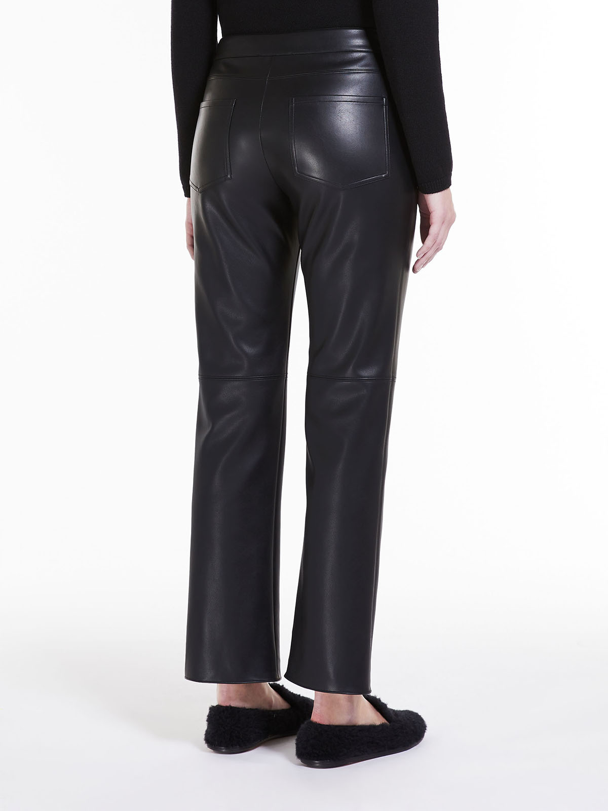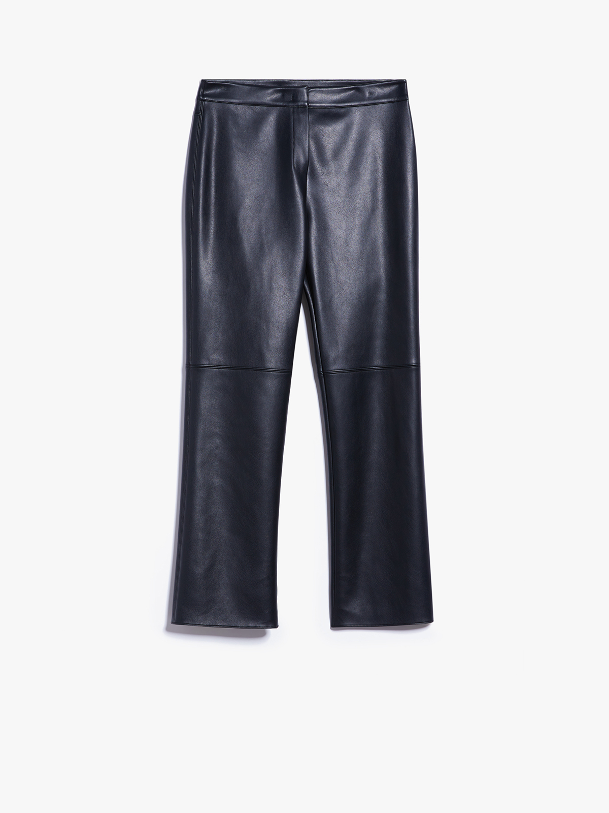 ジャージー素材をレザー調に仕上げたエコレザーパンツ。伸縮性があり、軽く柔らかな質感が特徴的です。シルエットはストレートフィット。膝から切り替えを施しすっきりとしたシルエットに仕上げました。いつものニットやブラウスとのスタイリングにアクセントをプラスしてくれるアイテムです。<ポケット>バックにパッチポケット<スタイル>フロントファスナー仕様