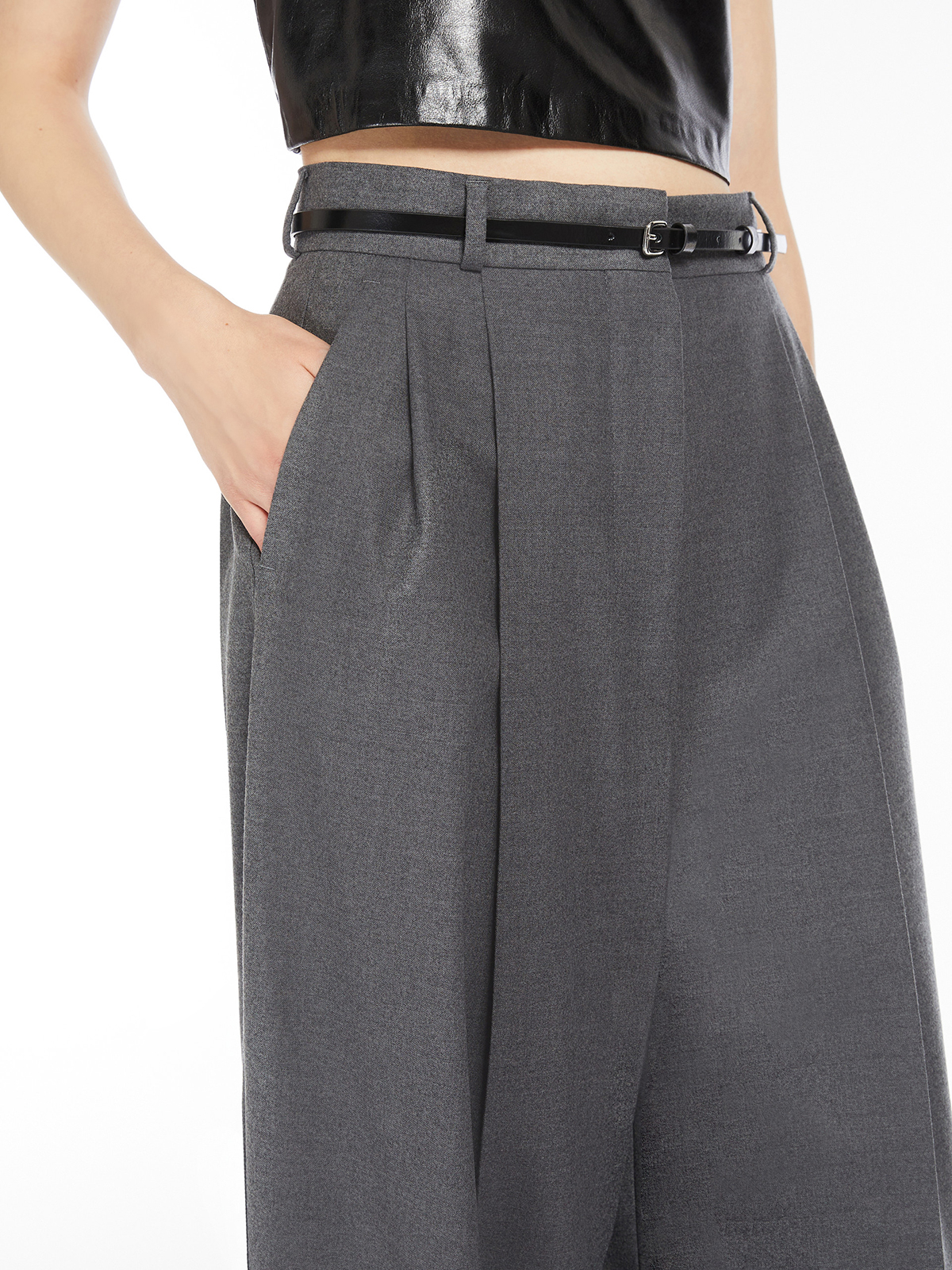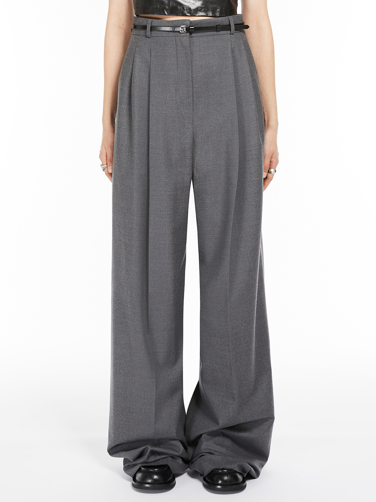 シルエットはオーバーサイズ。脚のボリュームを強調するダブルダーツのディテールが特徴的。