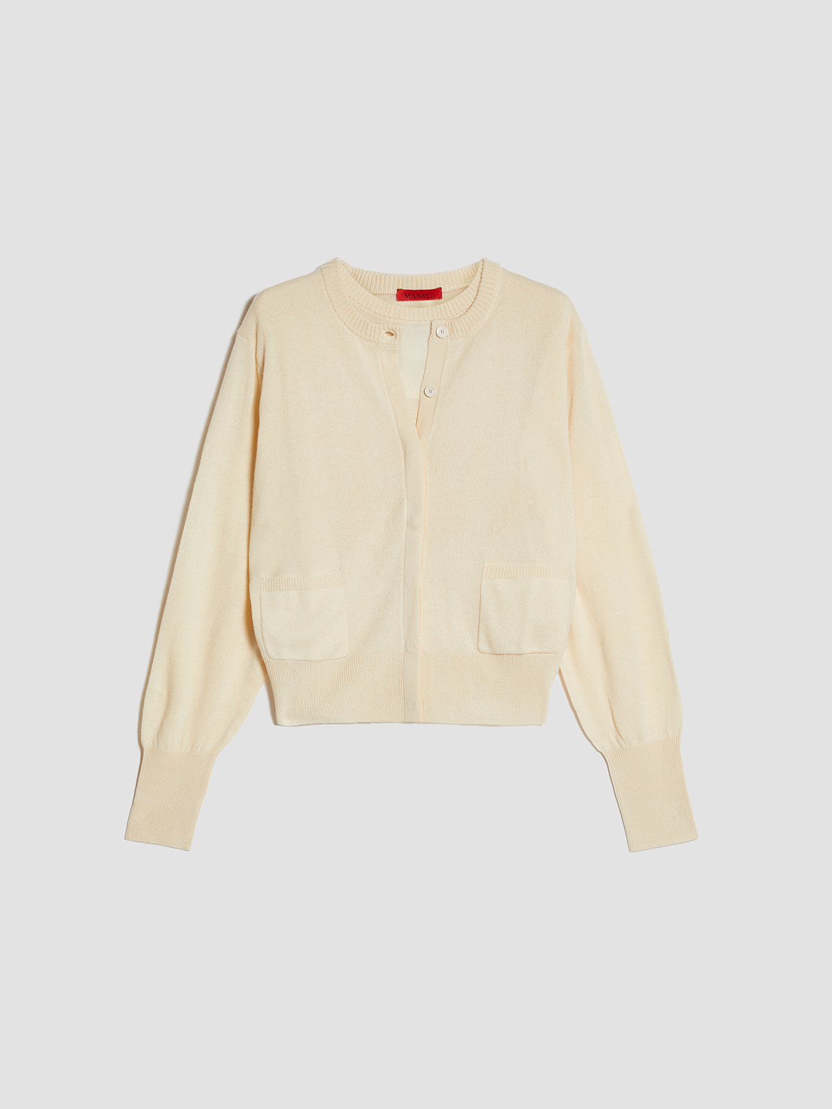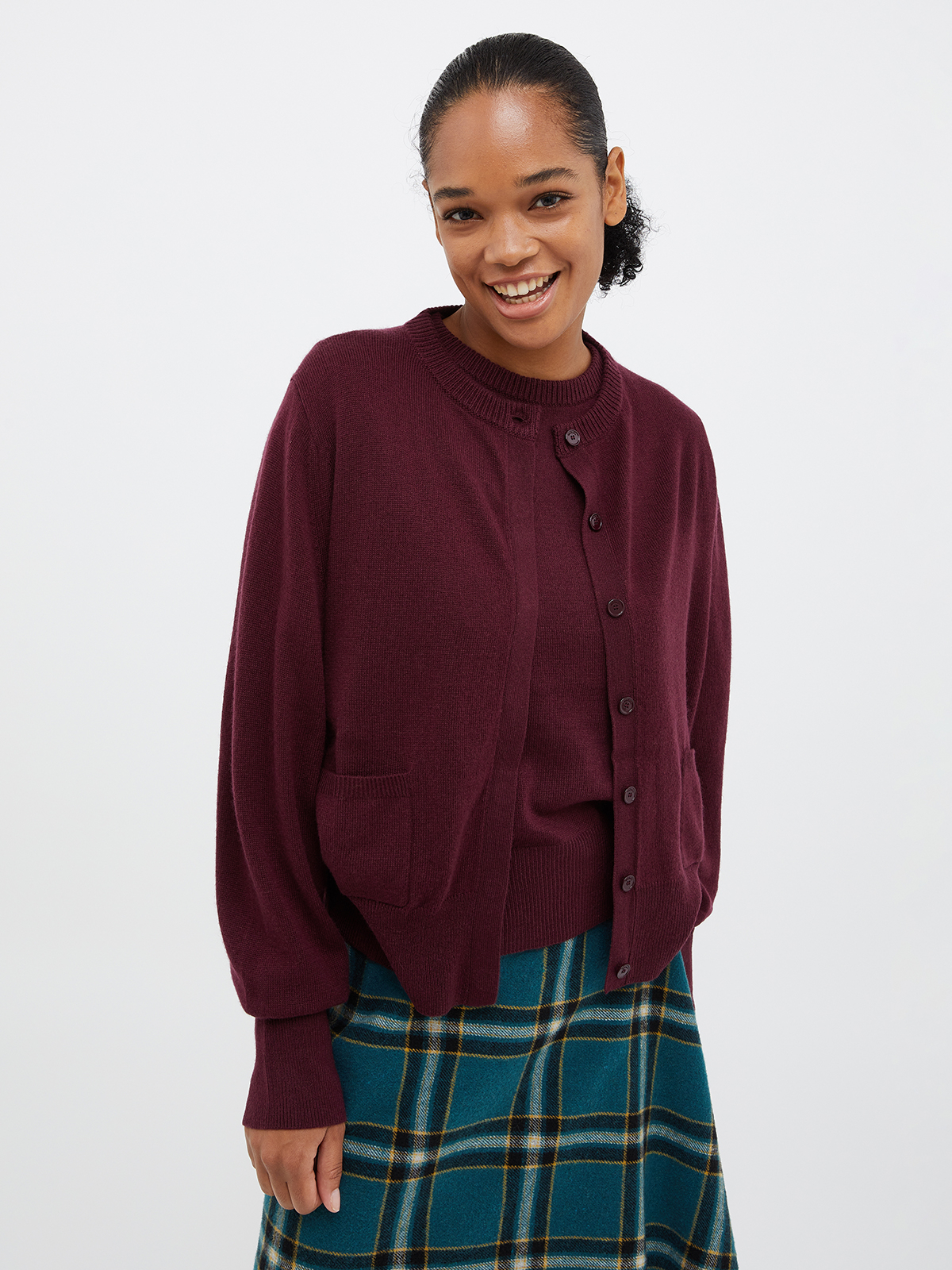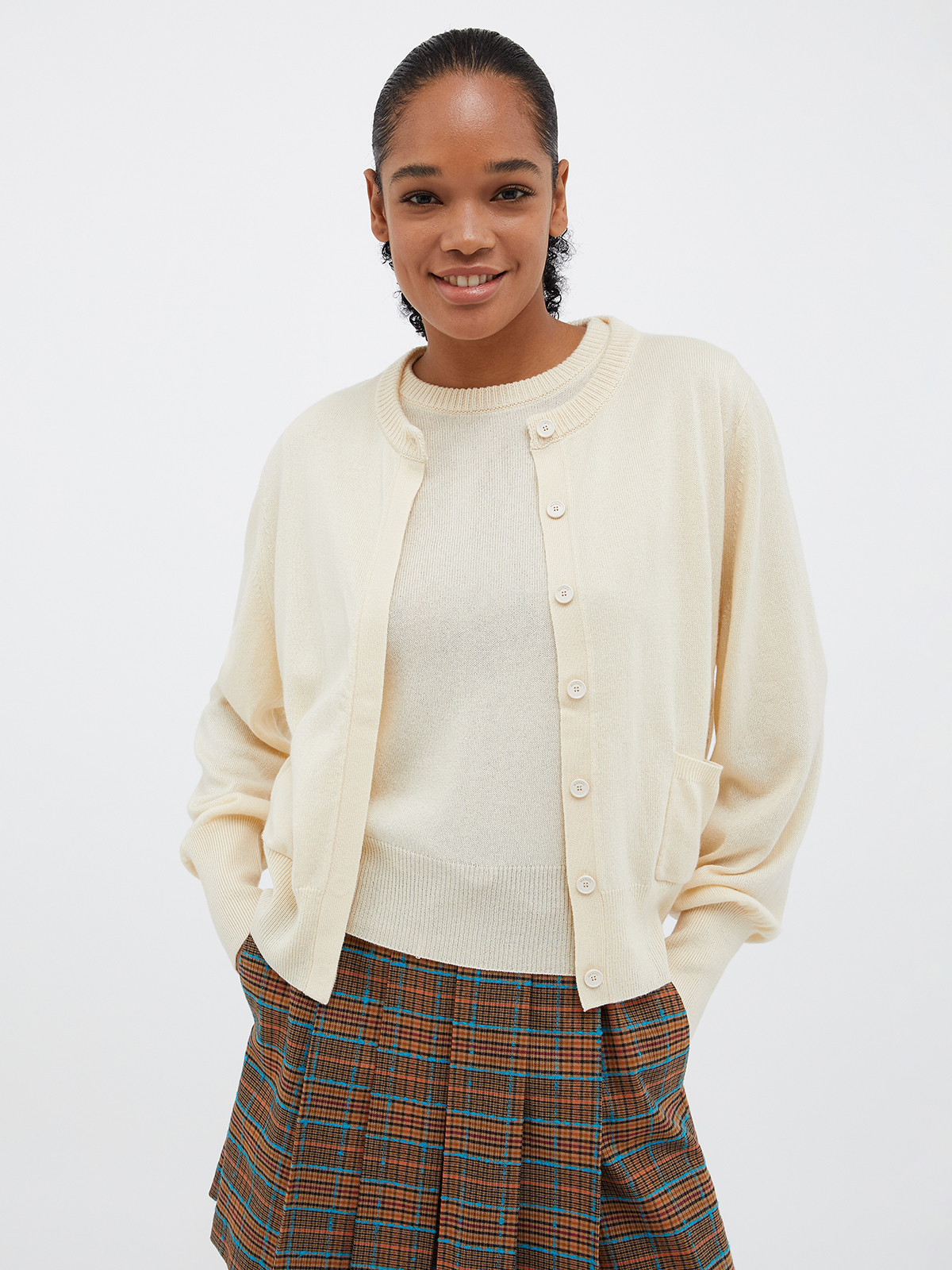 ラウンドネックのカーディガンは、1つ目のボタン以外は比翼仕立てで隠されてシンプルな仕上がり。インナーは使いやすい半袖で、アンサンブルでお召しいただくだけでなく、それぞれ単品でも活躍します。