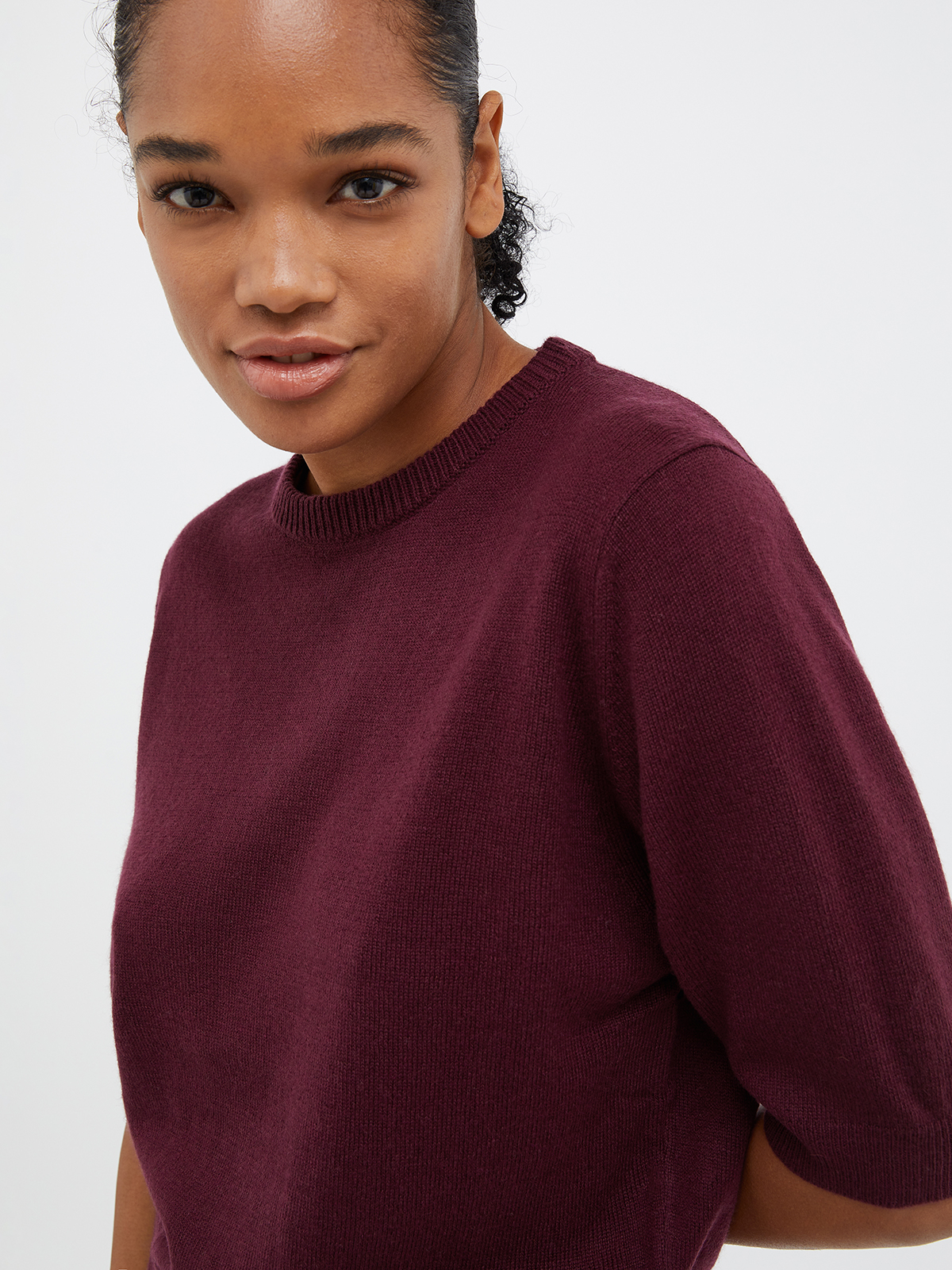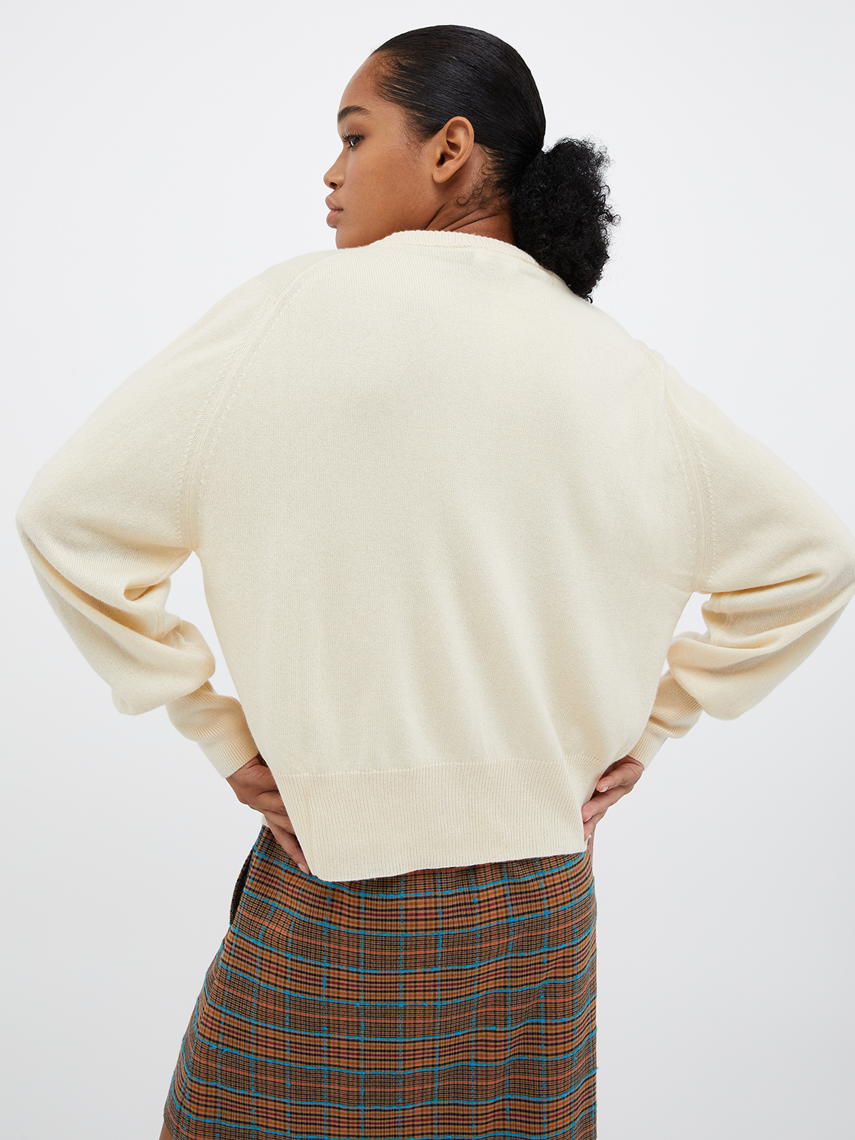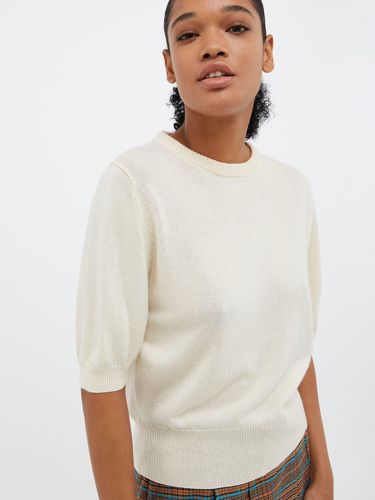 ラウンドネックのカーディガンは、1つ目のボタン以外は比翼仕立てで隠されてシンプルな仕上がり。インナーは使いやすい半袖で、アンサンブルでお召しいただくだけでなく、それぞれ単品でも活躍します。