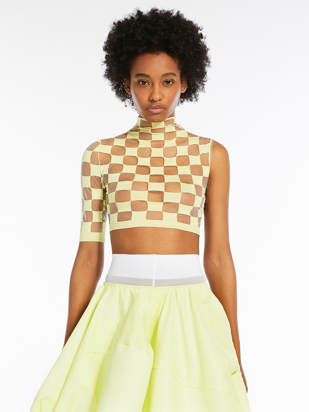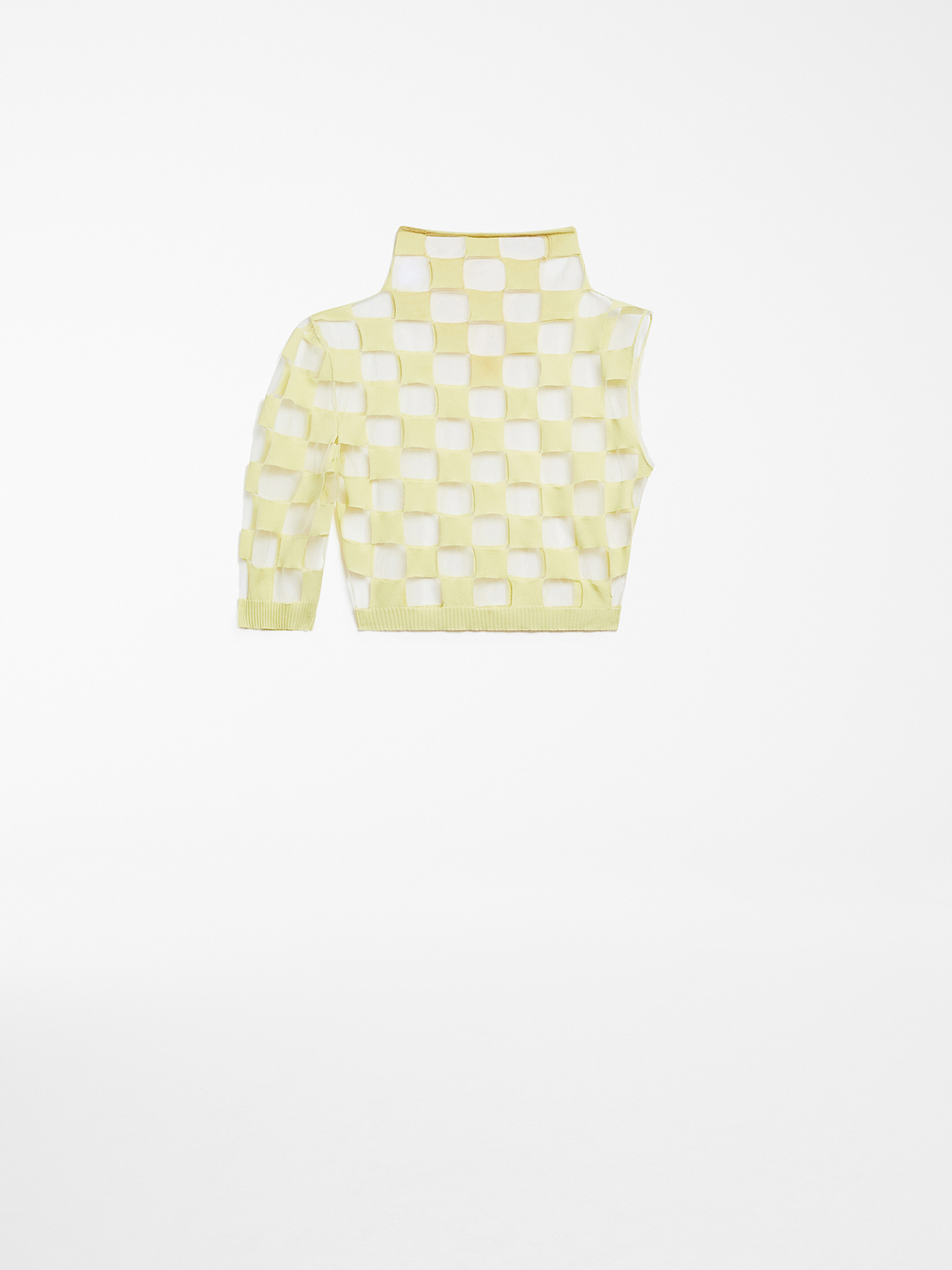チェッカーボード効果を生み出す、透明な糸のインターシャをあしらい、エアリーでコンフォートな着心地に仕上げました。