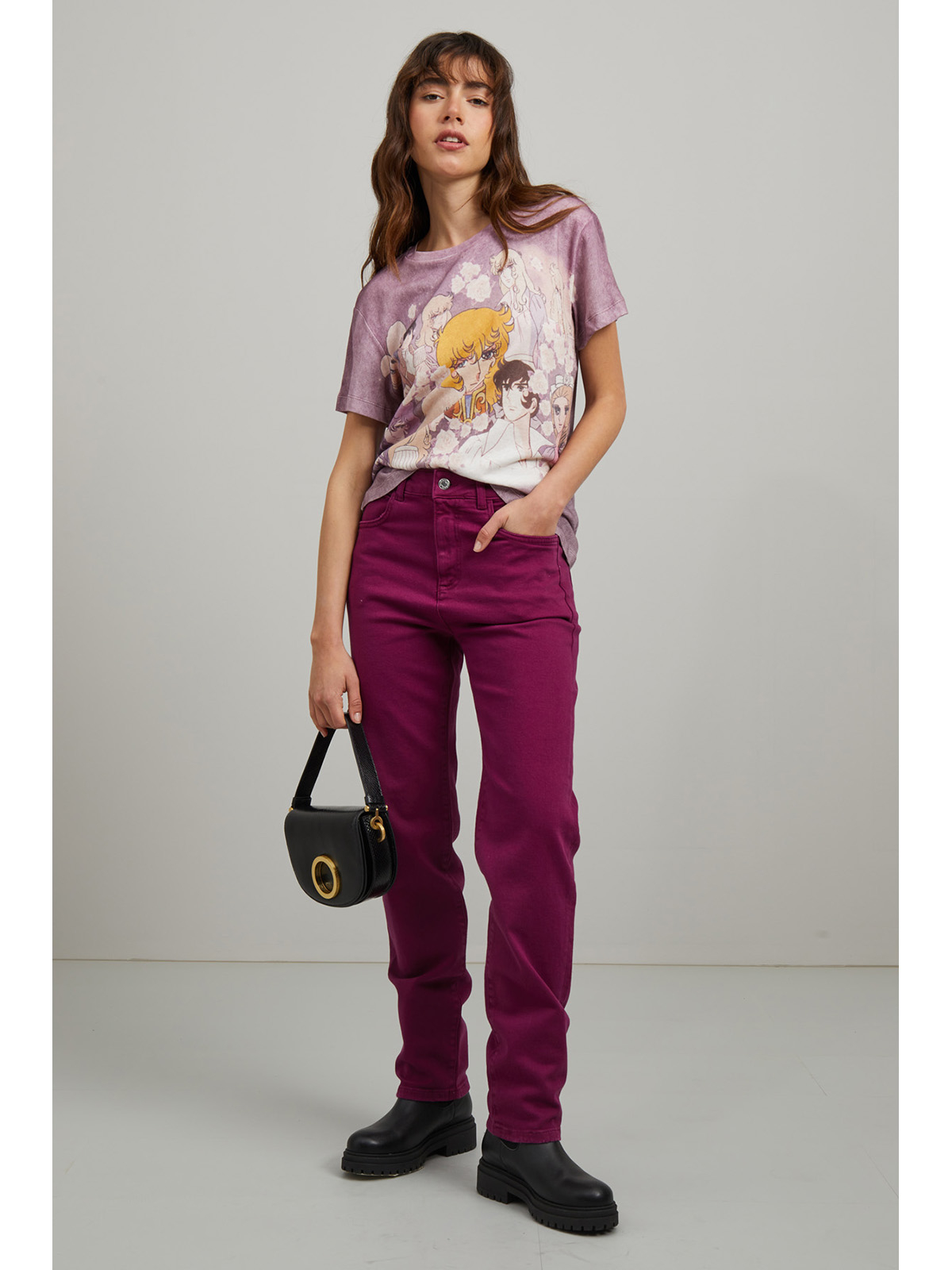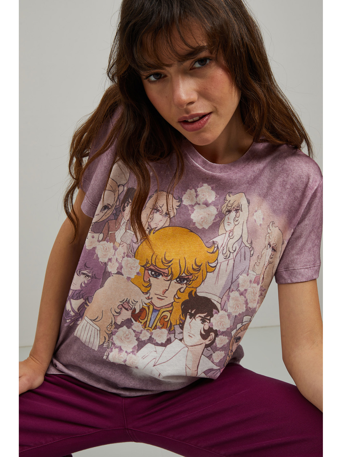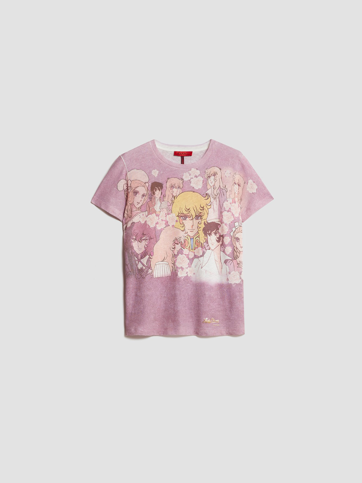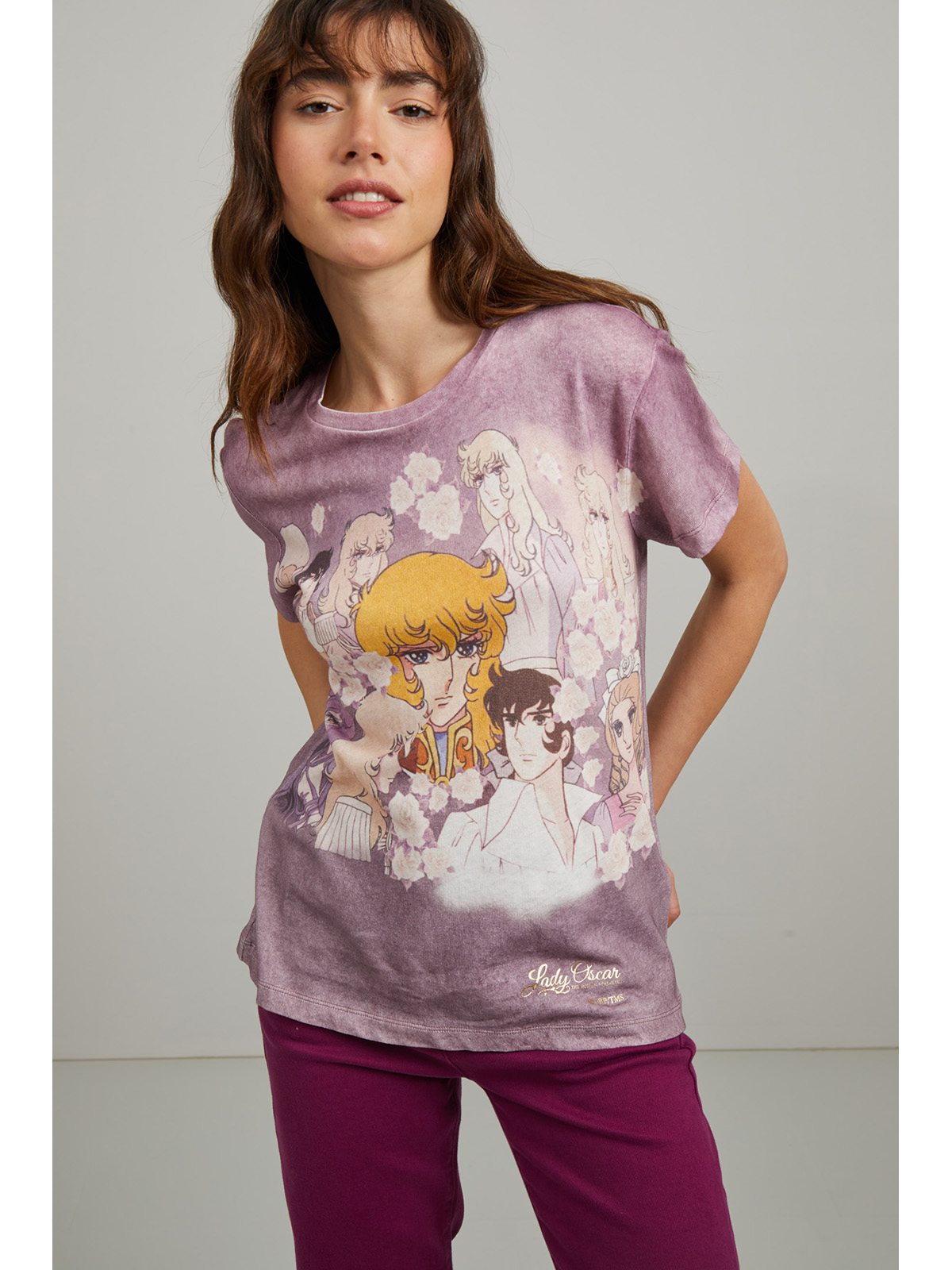 アニメのヒロイン、レディオスカルに捧げるTシャツは、ヴィンテージ感のあるカラーリングに加え、フロント全体にキャラクターをあしらったデザイン。