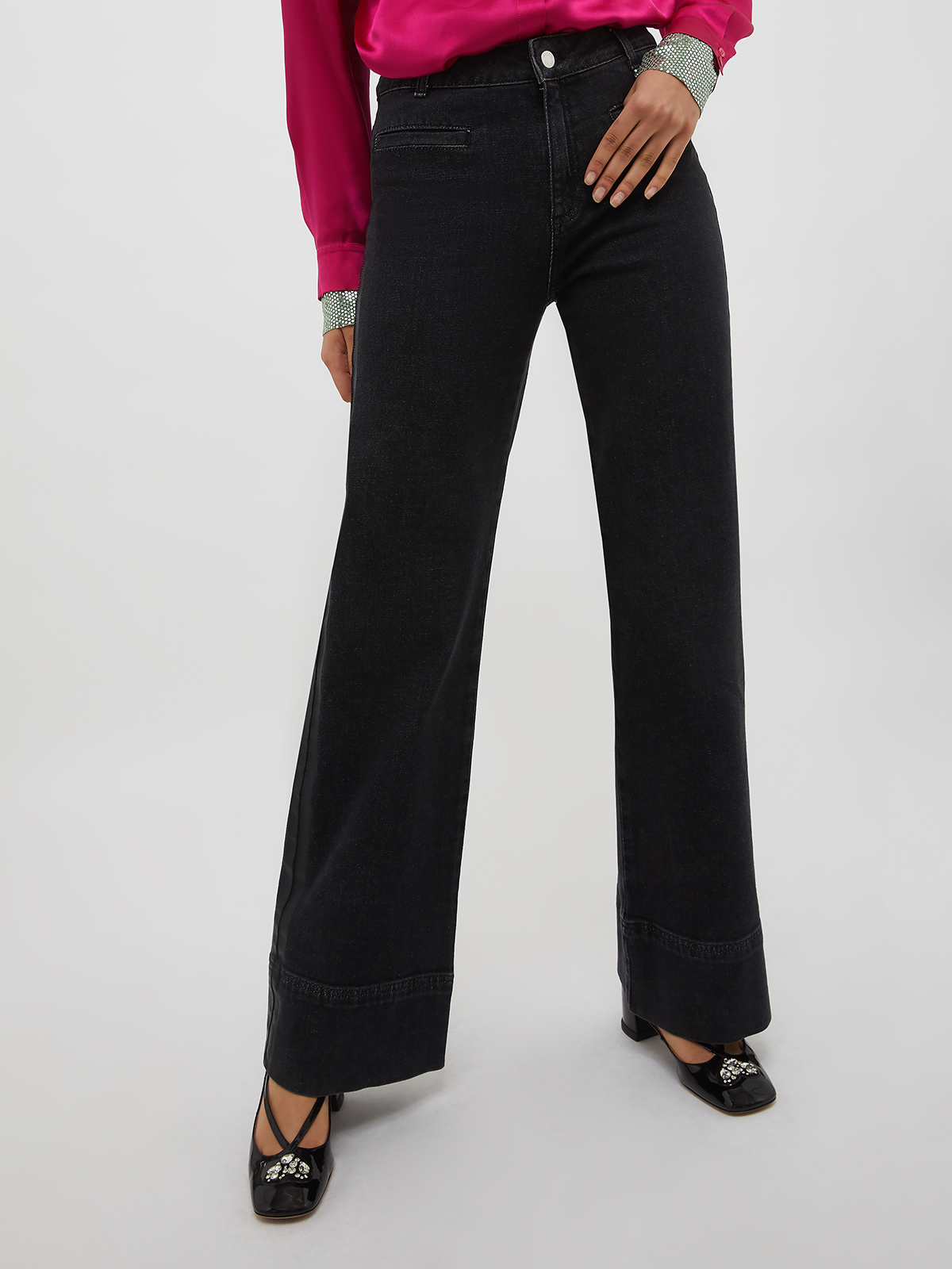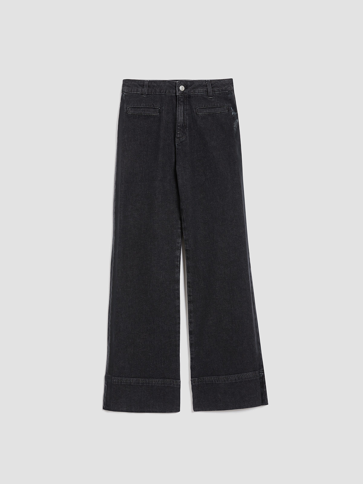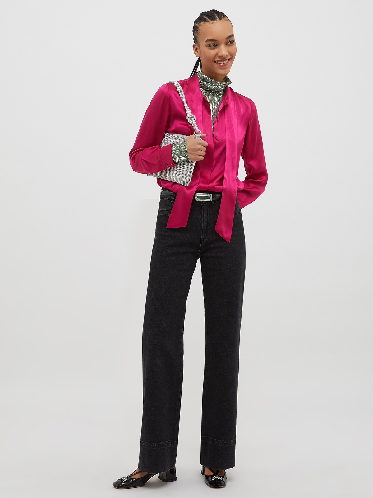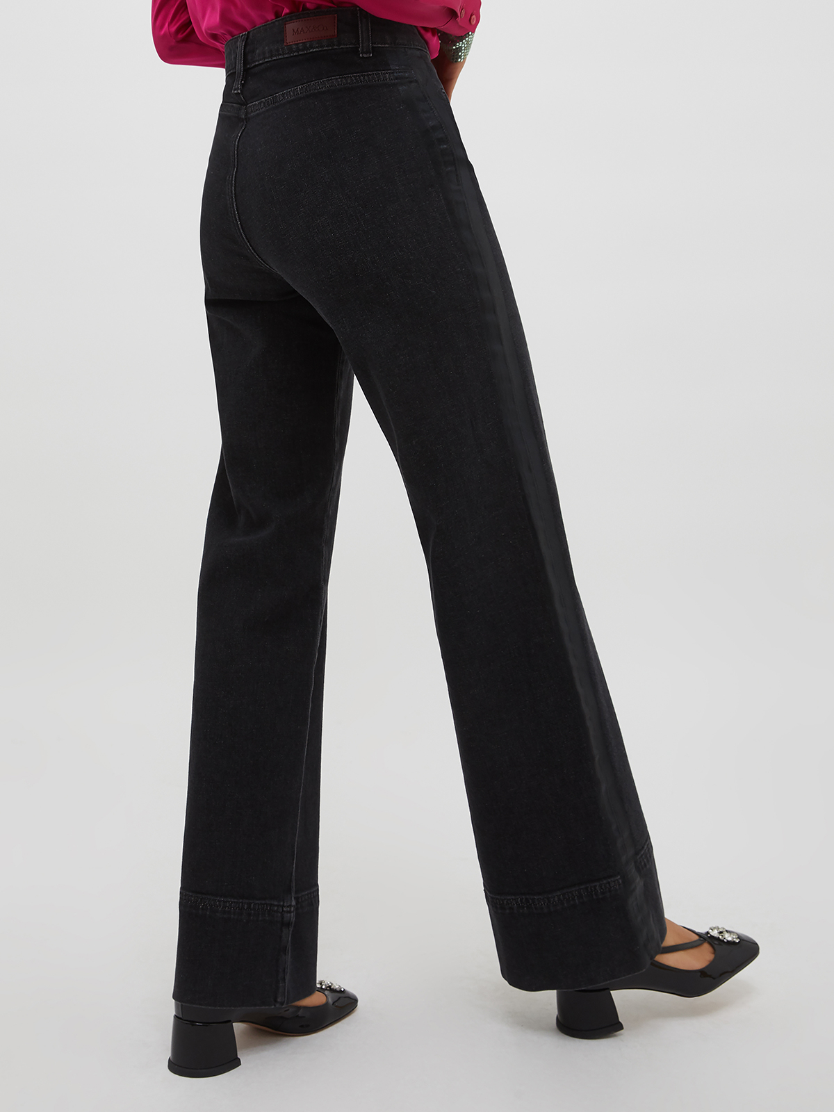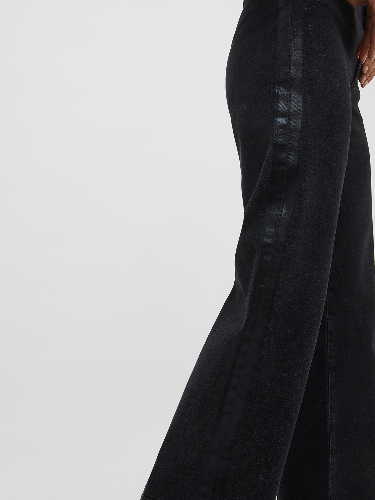 タキシード パンツをイメージしたストレート ジーンズ。ストレッチを効かせたブラック デニムに、光沢感のある同系色のサイドストライプを施し、エレガントなニュアンスをプラスしました。シルエットは、裾に向かってほのかに広がるストレートライン。幅の広いヘムのステッチがアクセントに。