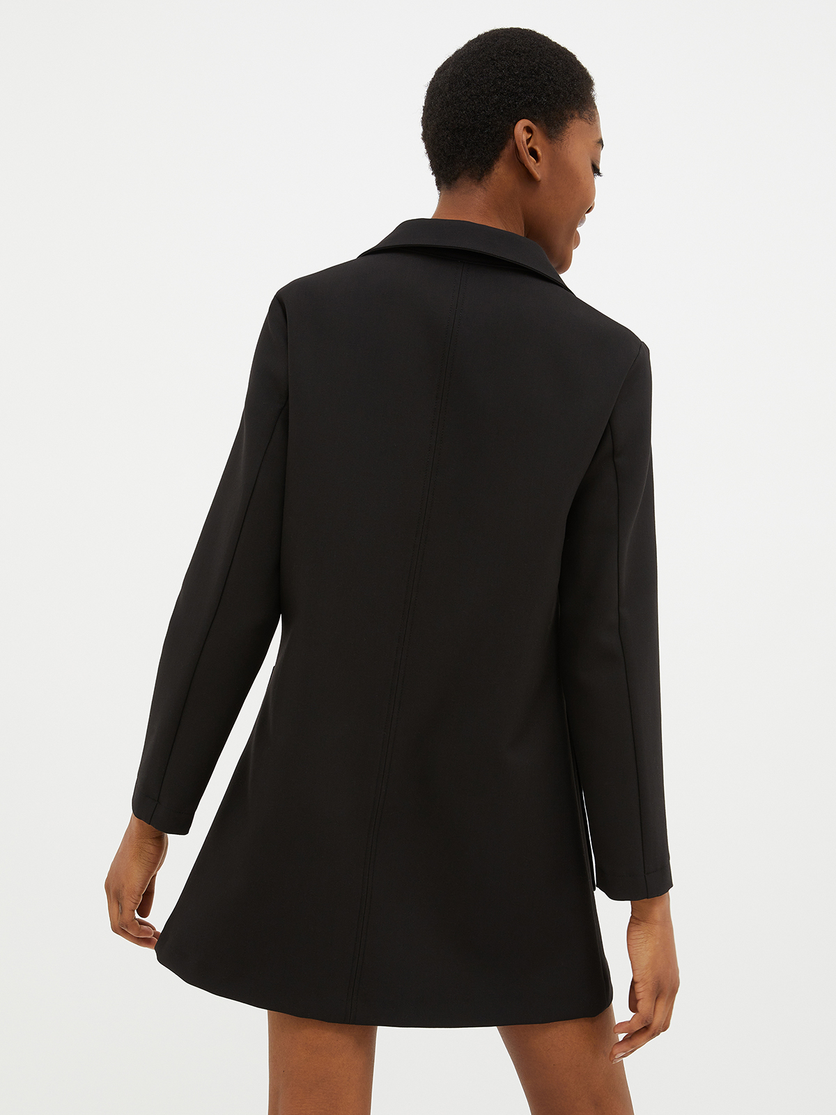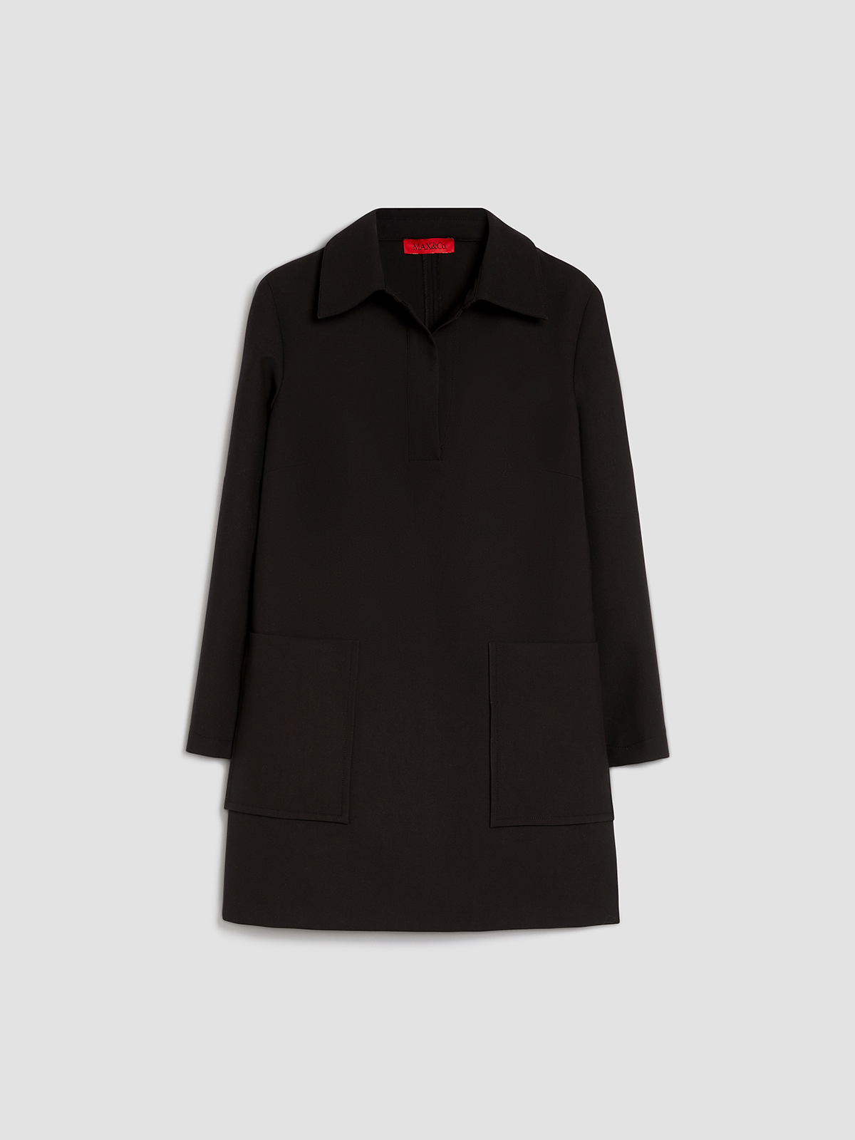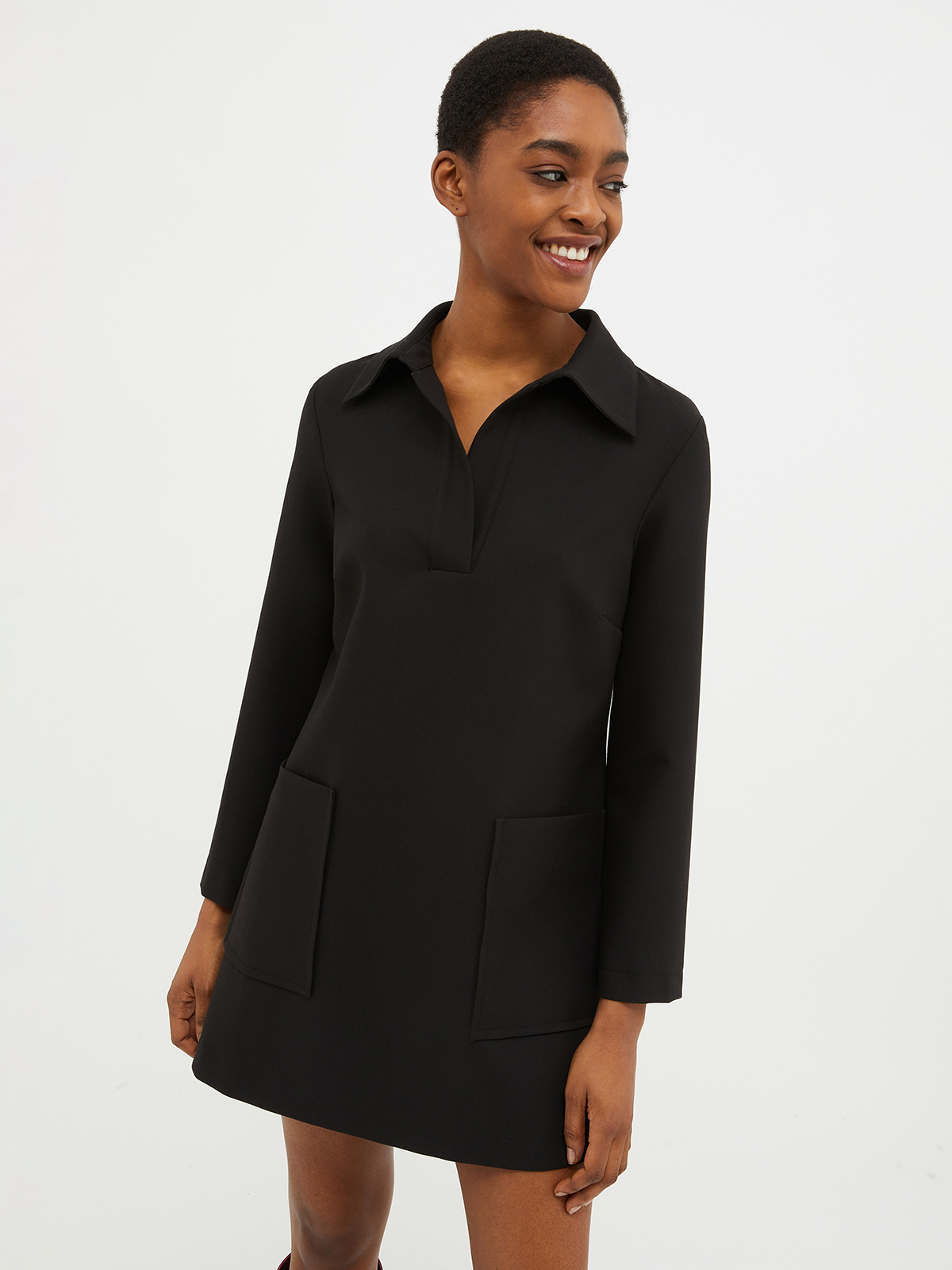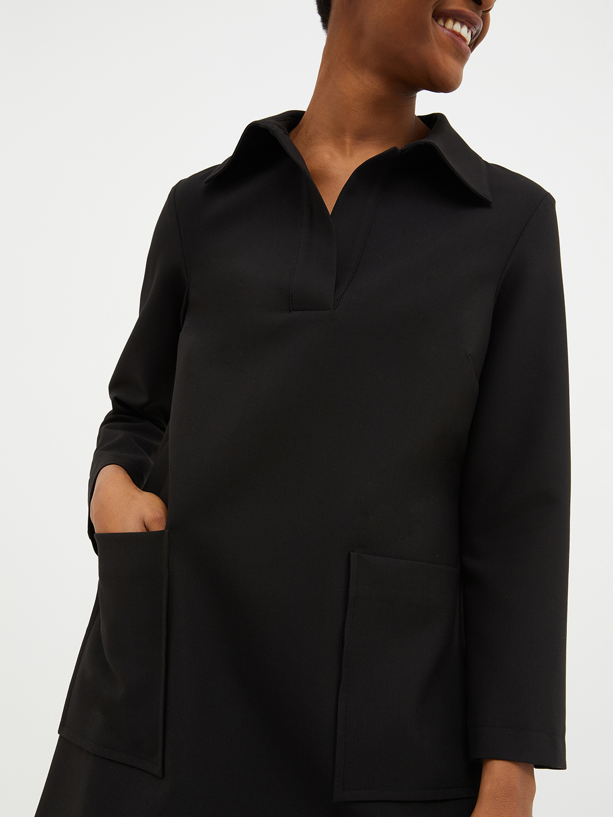 ボタンのないポロスタイルの襟の、リラックスしたストレートカットのミニレングス。
