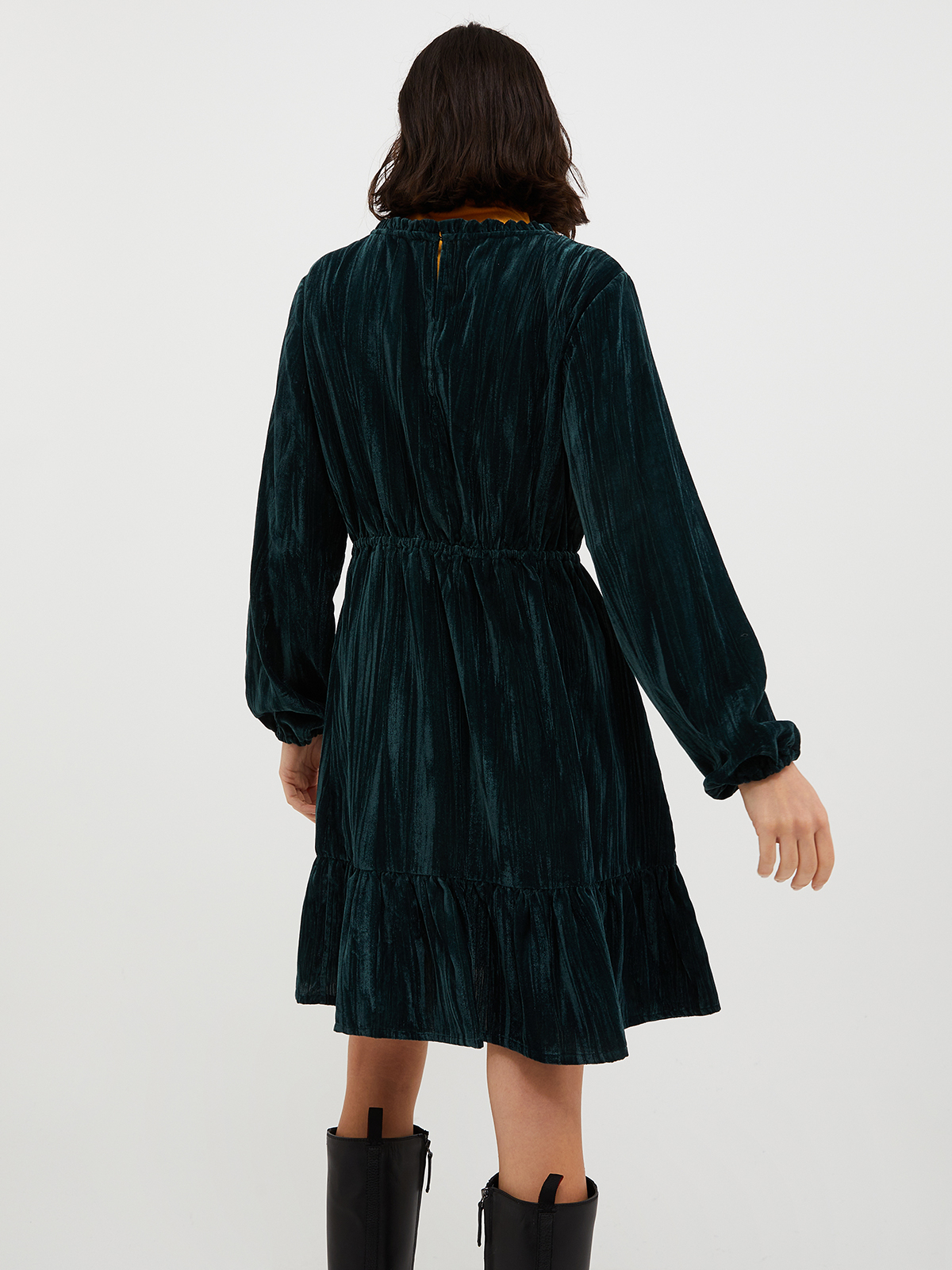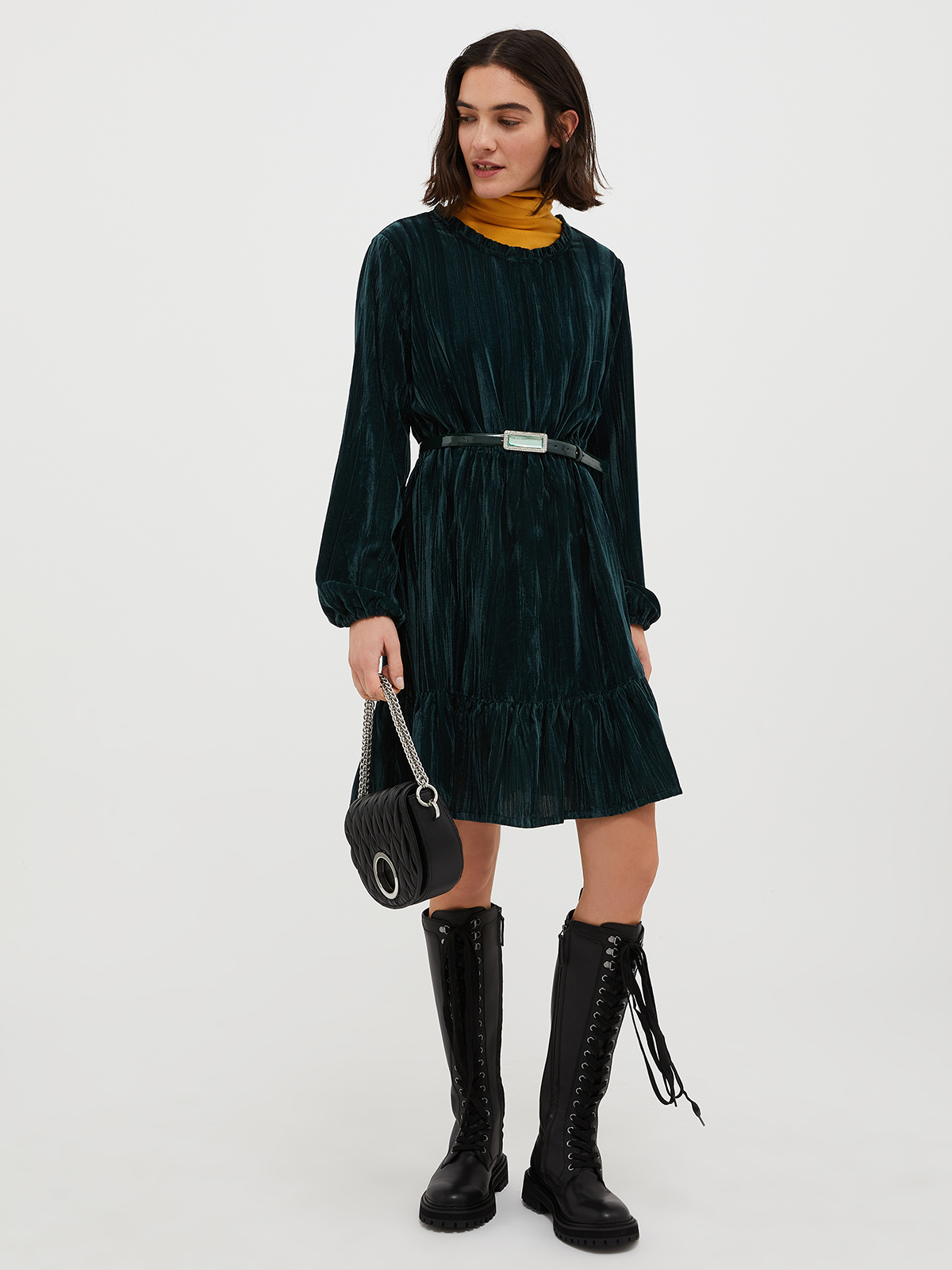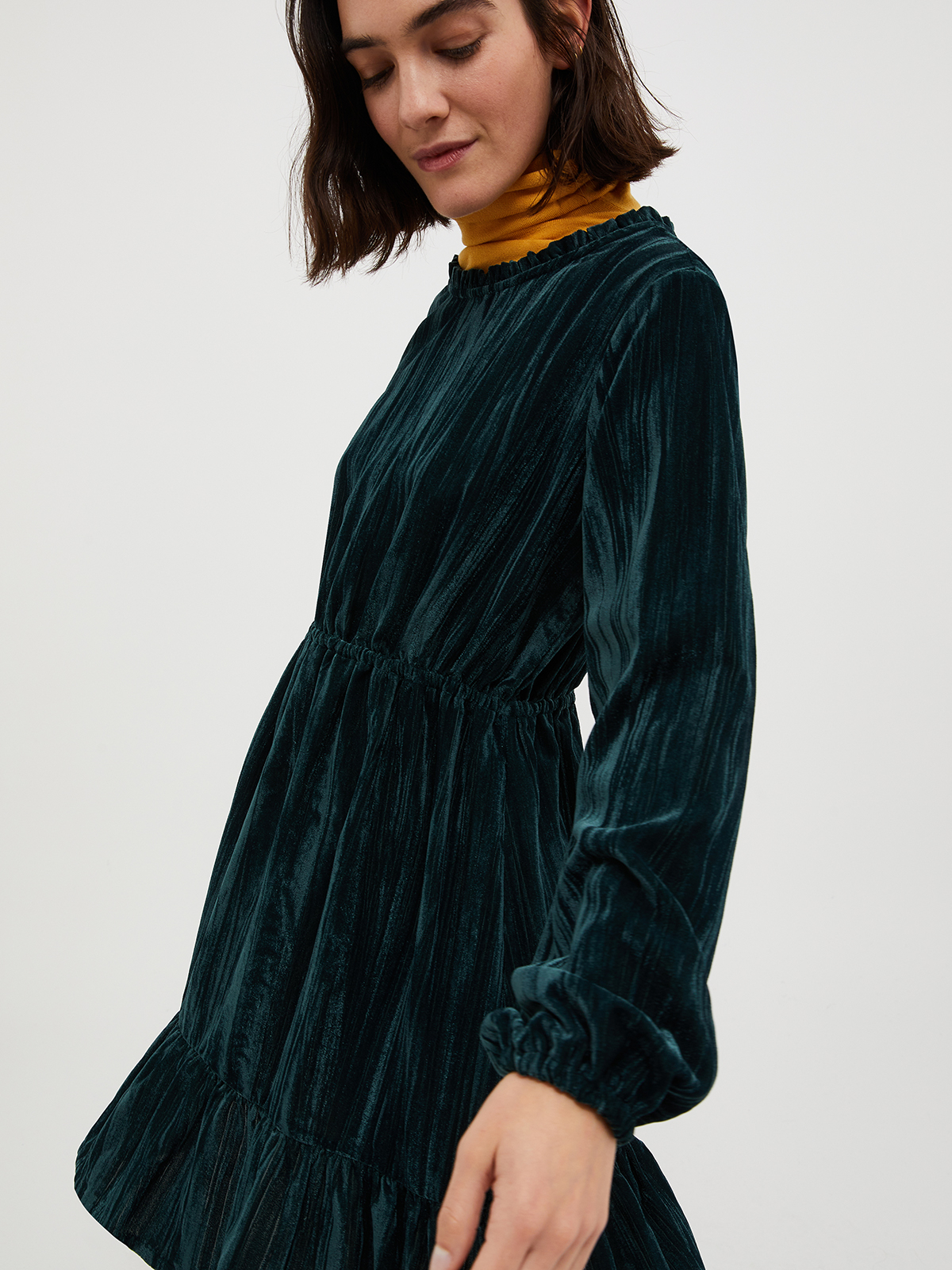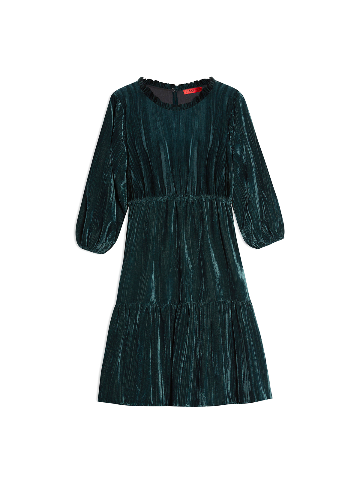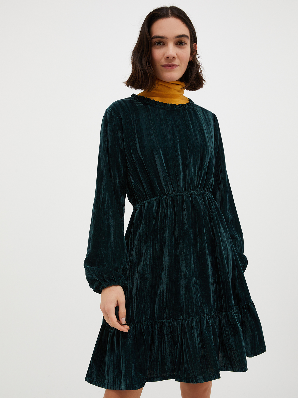 小さなフリルを施したラウンドネックに、裾にかけて広がるフレアラインのミニ丈。ウエストと袖口にゴムを通しギャザーを寄せたボリュームのあるフェミニンなシルエットに仕上げました。