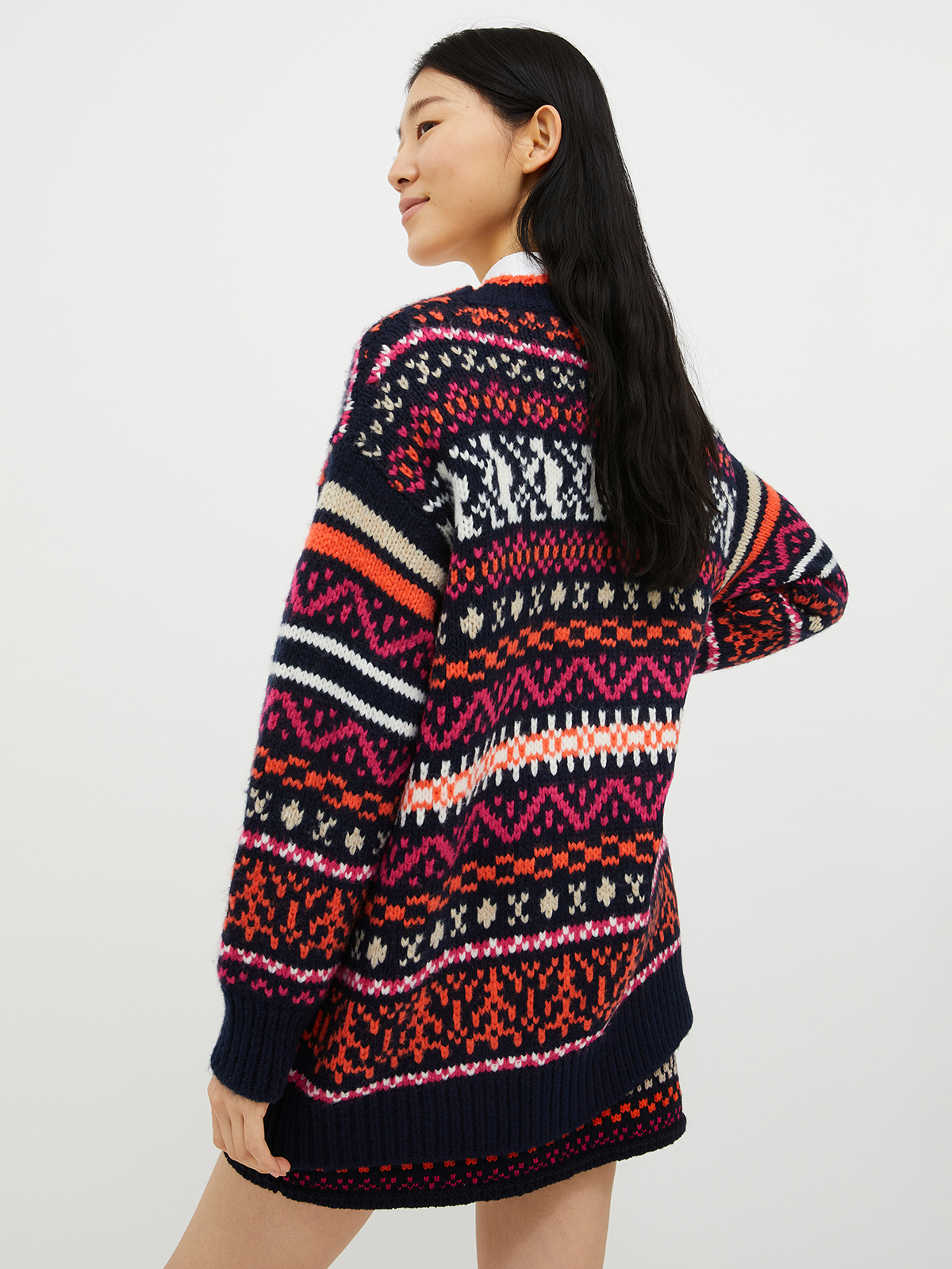 伝統的なトリコットの幾何学模様をあしらった、ジャカードウールブレンドを使用し、暖かみのあるコンフォートな着心地が魅力です。
