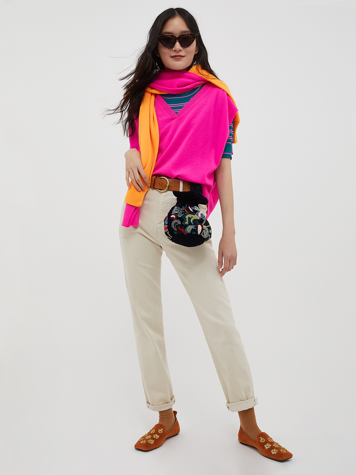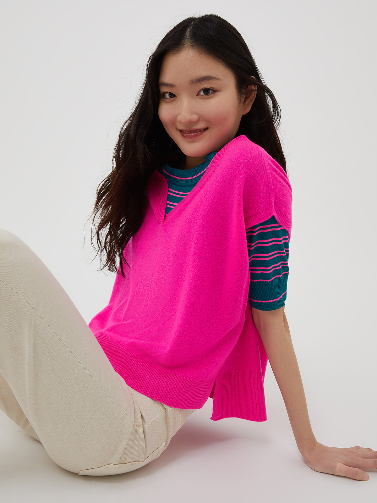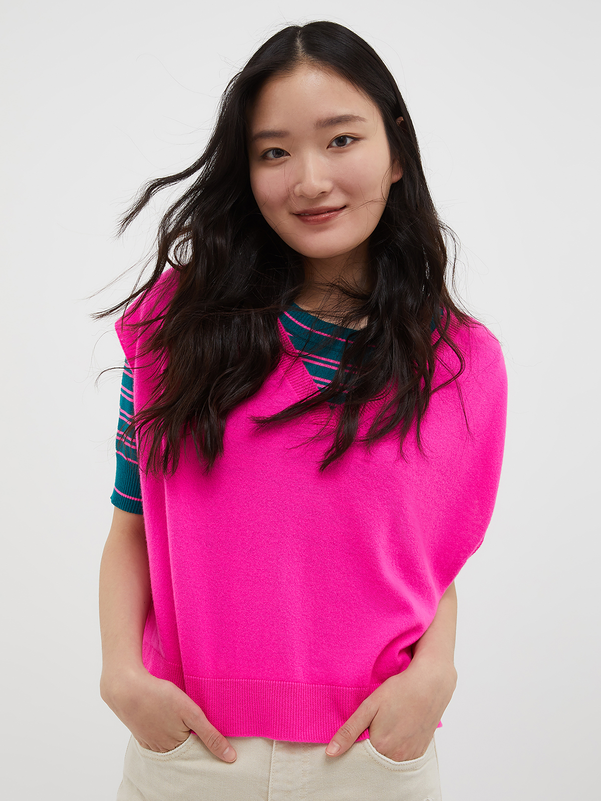 鮮やかなカラーリングのウールカシミヤジレ。カシミヤ混のソフトな風合いで、軽やかな着心地が魅力ですシルエットはVネックに開きの広いアームホール。両サイドにスリットを施したシームレスの幅広なゆったりとしたシルエットがリラックスした雰囲気に。いつものトップスやワンピースに重ねるだけで新鮮なコーディネートをお楽しみいただけます。<ポケット>なし<スタイル>Vネック
