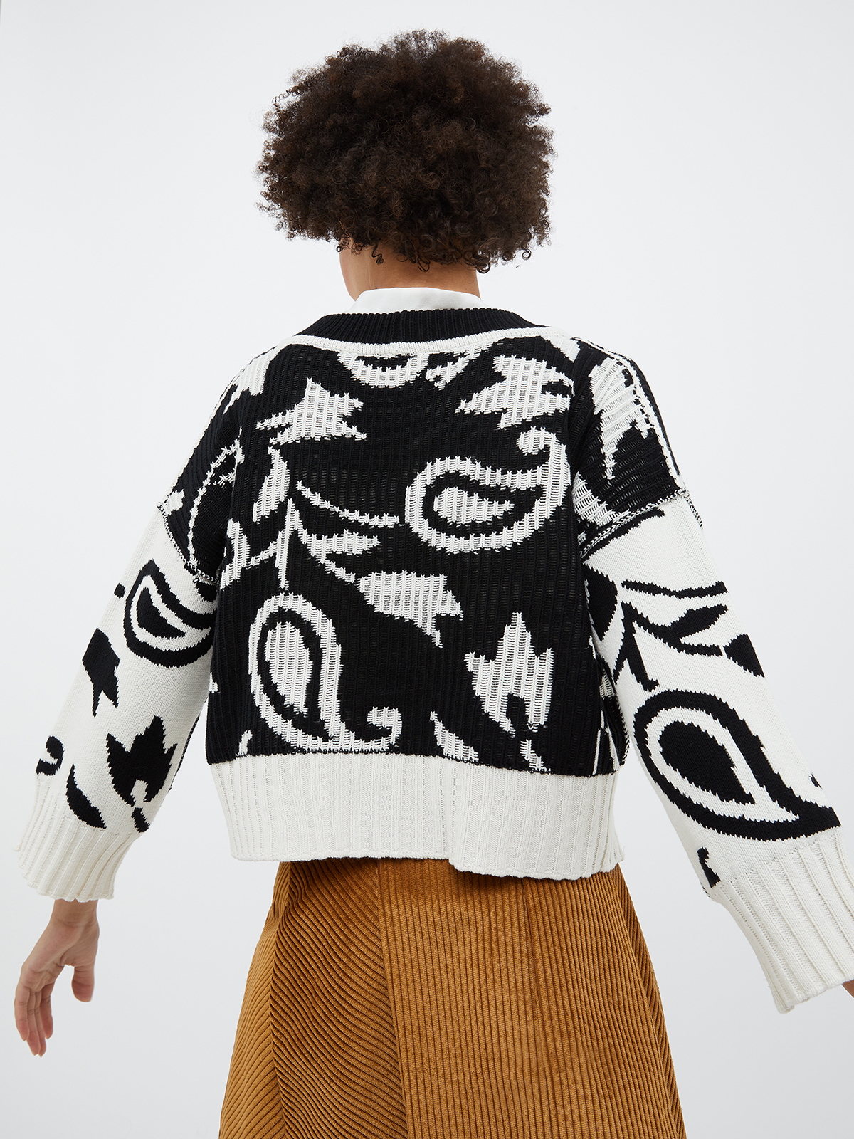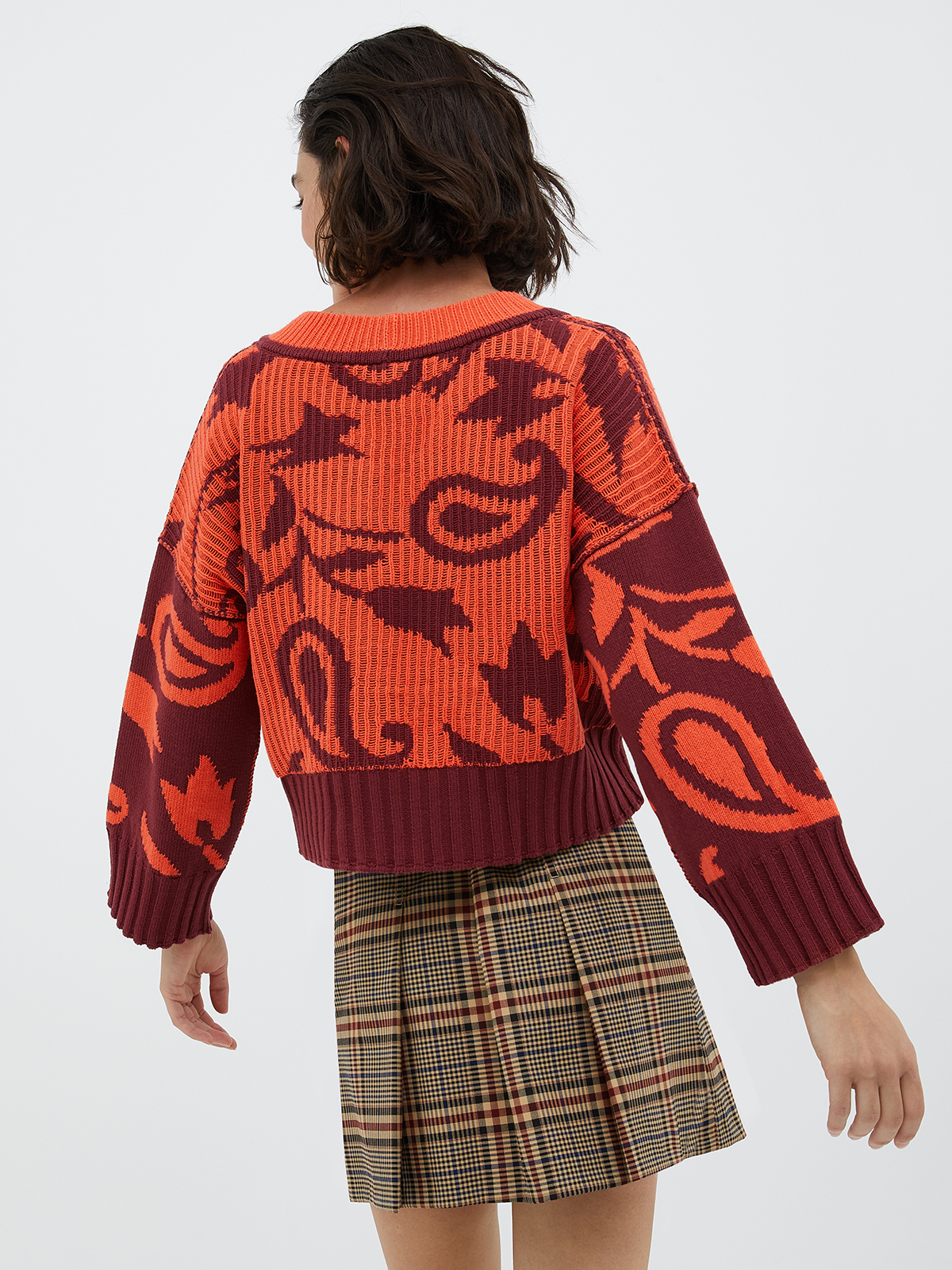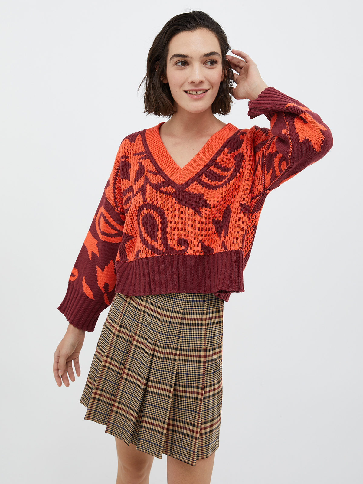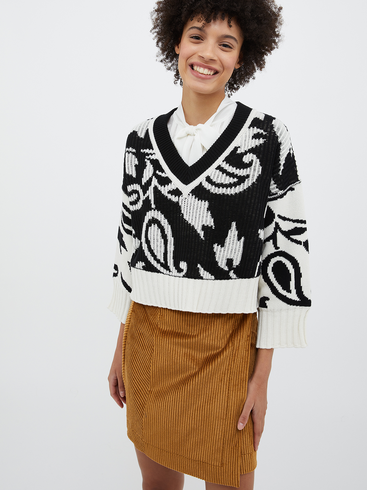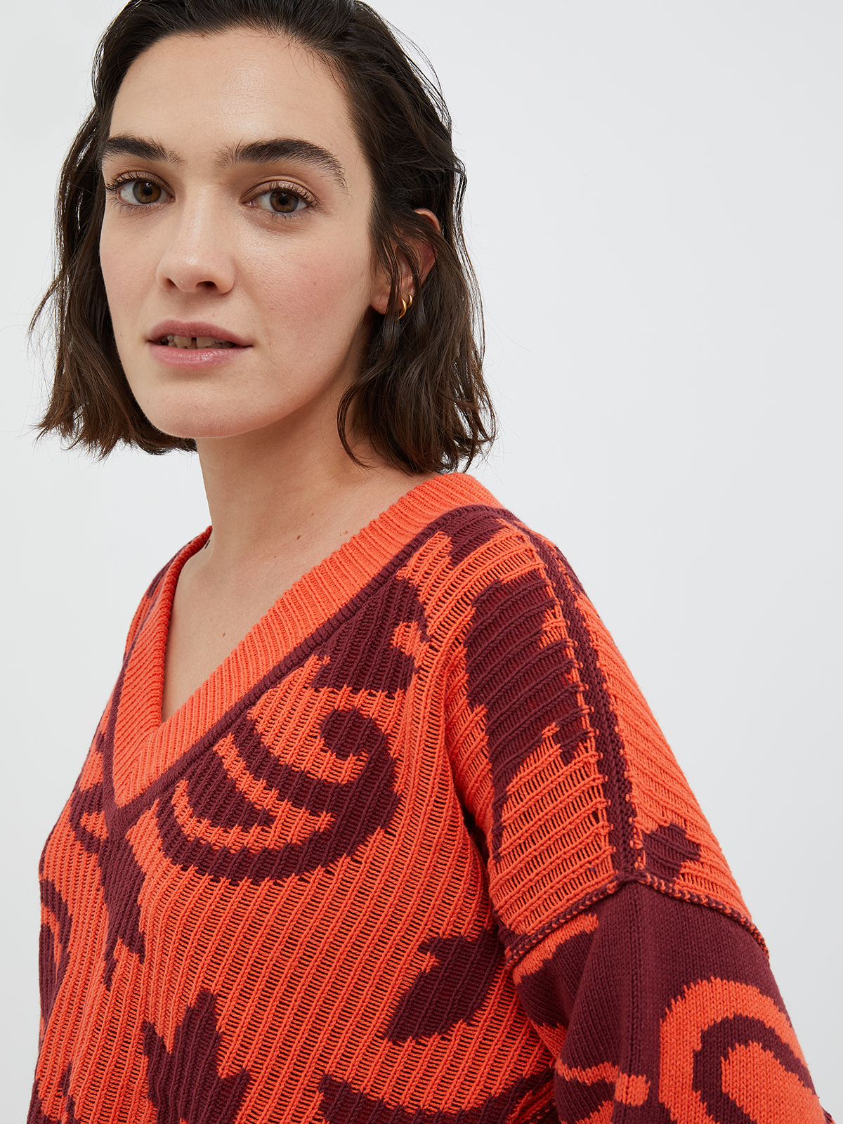 深めのVネックにドロップショルダー、ボクシーなストレートラインのクロップド丈で、1枚で着用してもブラウスをレイヤードしても、バランスよく着こなしていただけます。