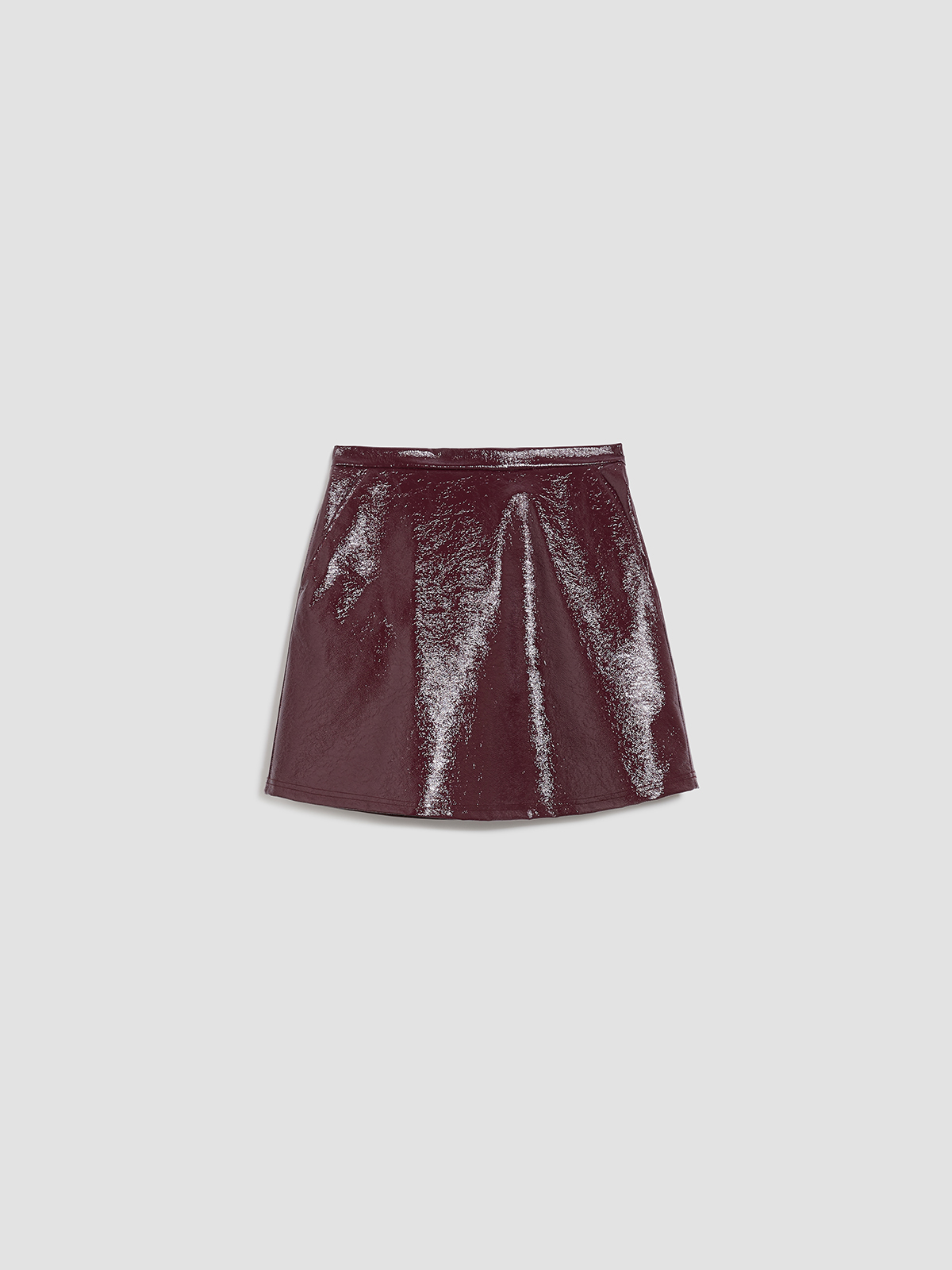 60年代風の雰囲気を醸し出したAラインスカート。肌触りの良いジャージー素材に、光沢のあるパテントレザー効果と、シワ加工を施しアクセントになる質感に仕上げました。少し高めのウエストのAラインのミニレングスですっきりとしたシルエットです。スポーティーなアイテムともエレガントな着こなしでもコーディネートしやすいモデルです。<ポケット>サイドポケット<スタイル>バックファスナー仕様