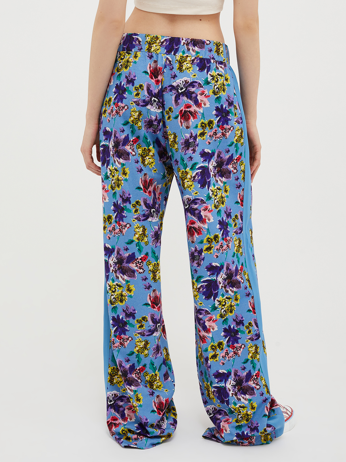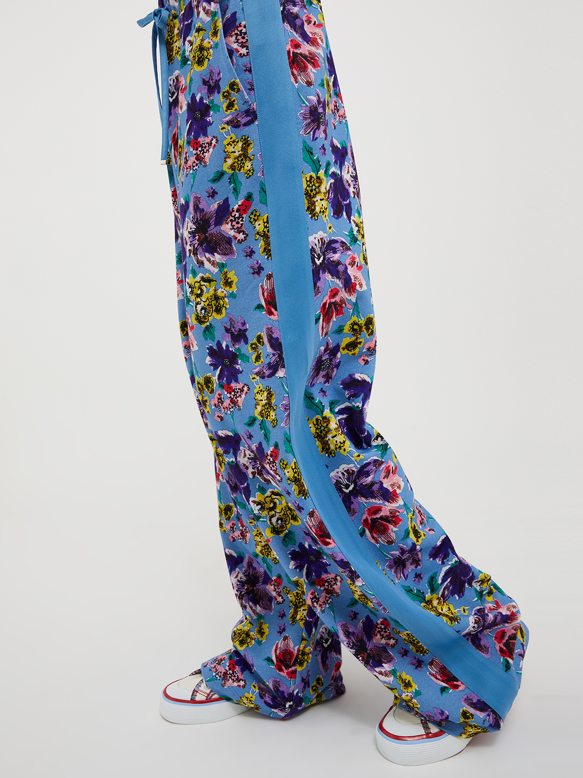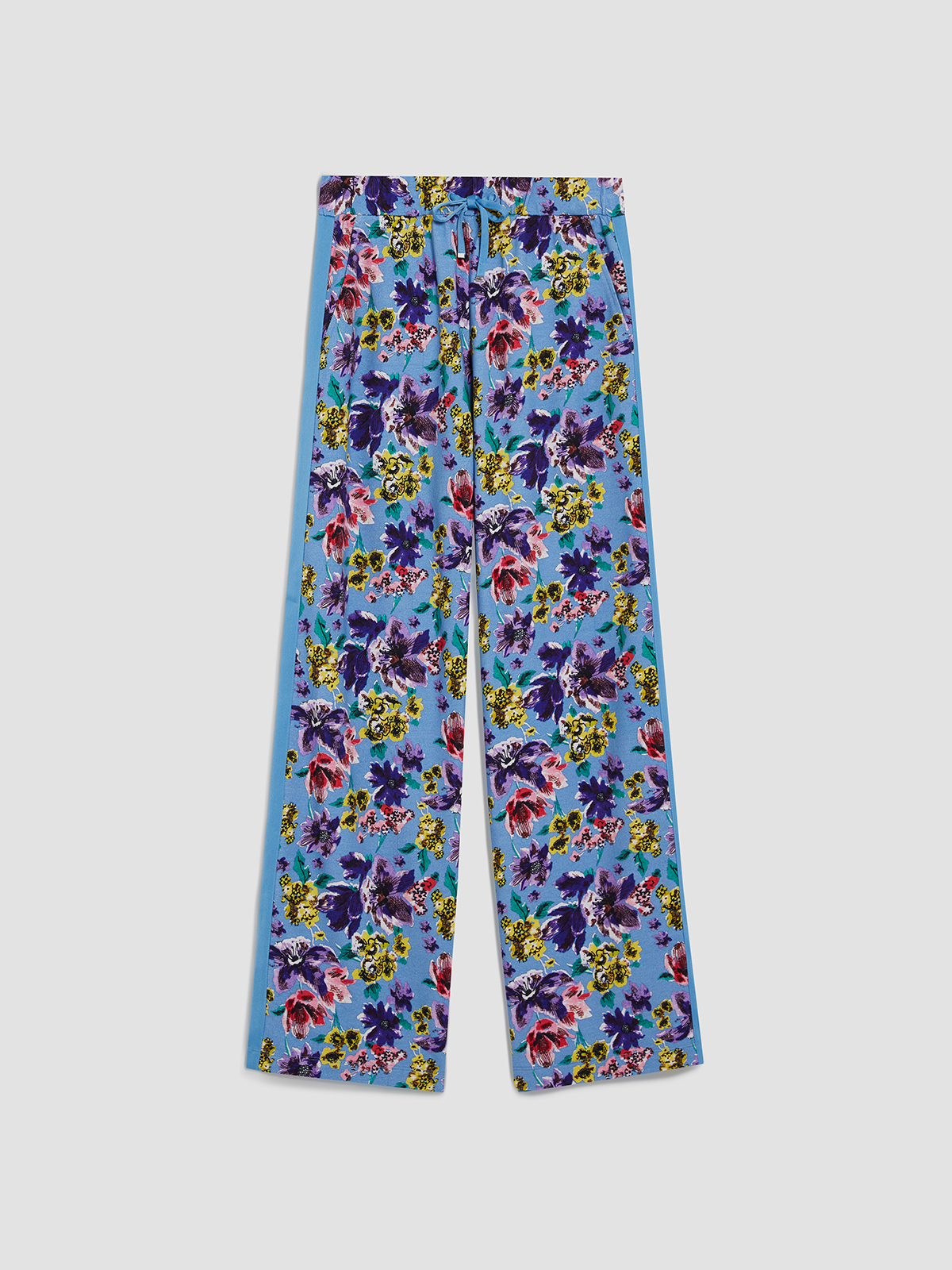 すとんと落ちるワイドなストレートシルエットでサテン生地のサイドラインが大人エレガントなアクセントを加えます。