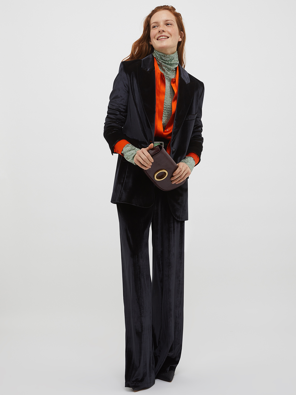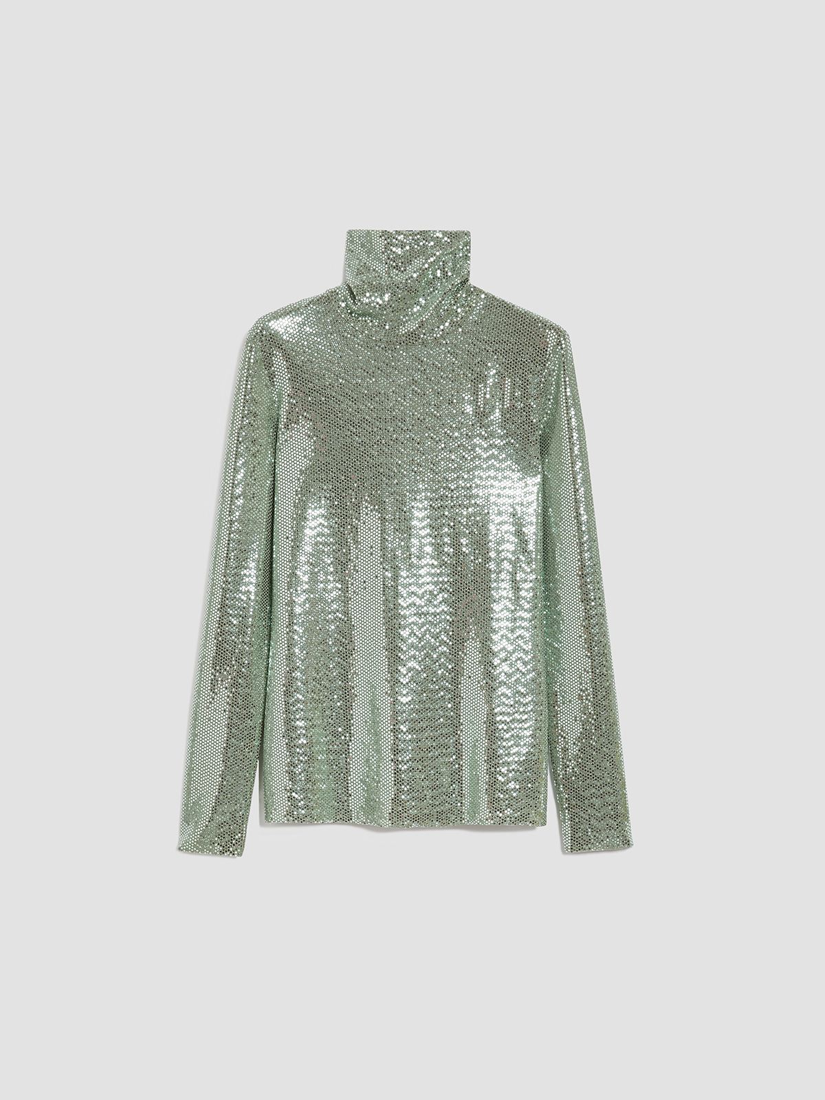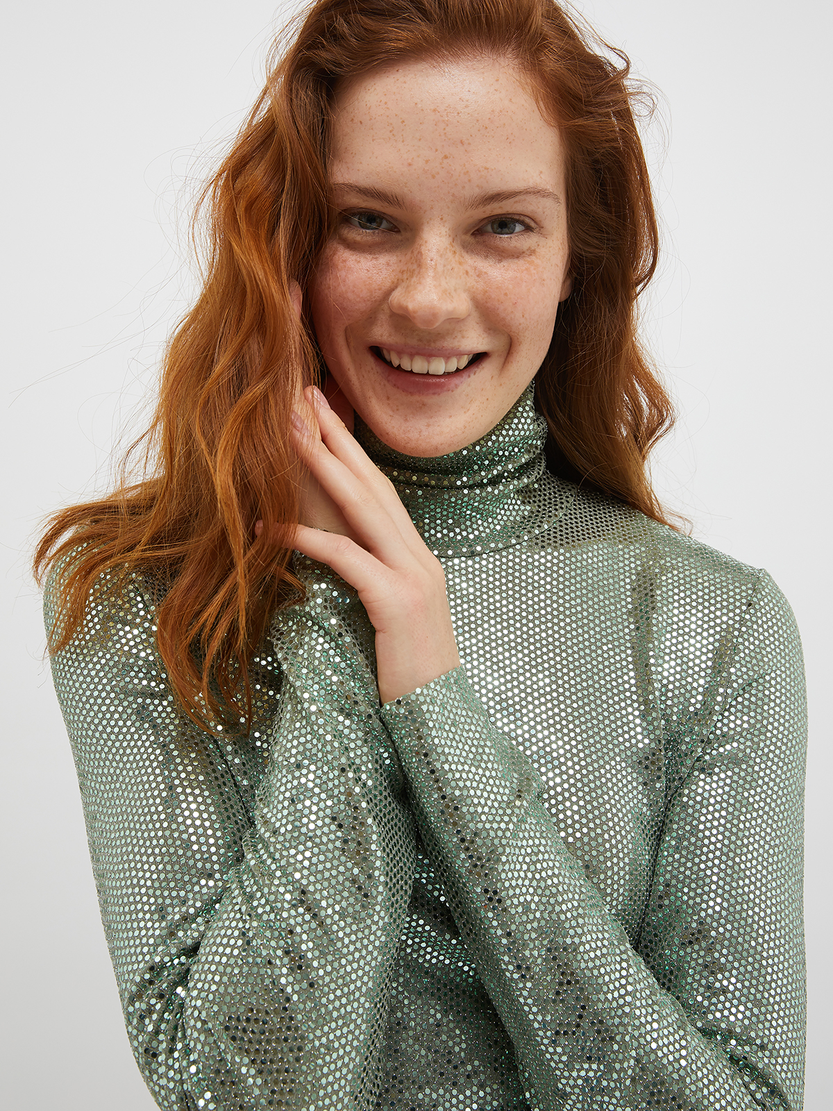 全体にスパンコールのような輝きを施したジャージー トップ。ストレッチの効いたさらりとした生地で、コンフォートな着心地が魅力です。ハイネックに程よく体にフィットするスリムライン。ジャケットやドレスのインナーとしてパーティーシーンはもちろん、デニムやスカートにプラスしてカジュアルダウンさせた着こなしもおすすめです。<ポケット>なし<スタイル>ハイネック