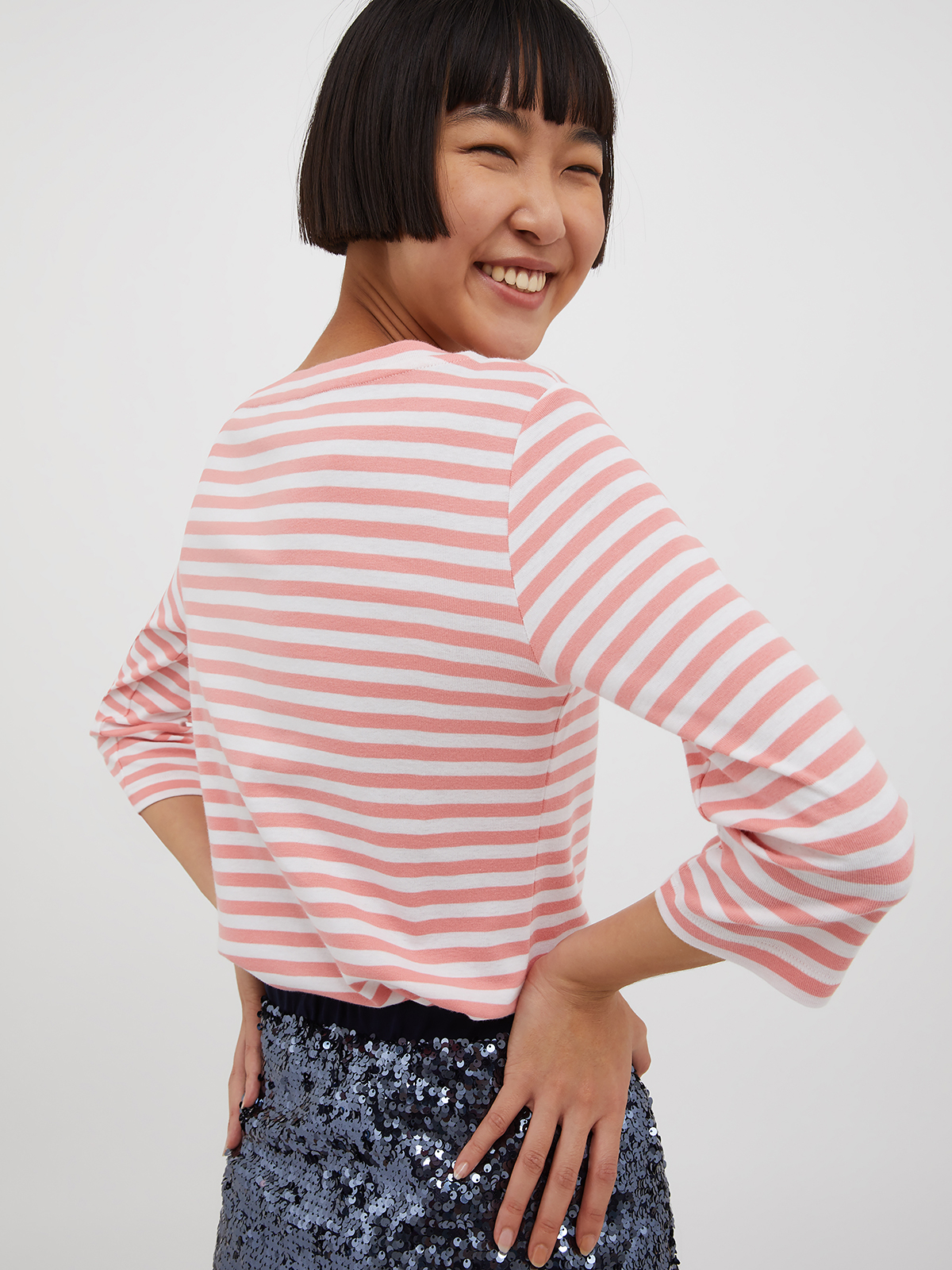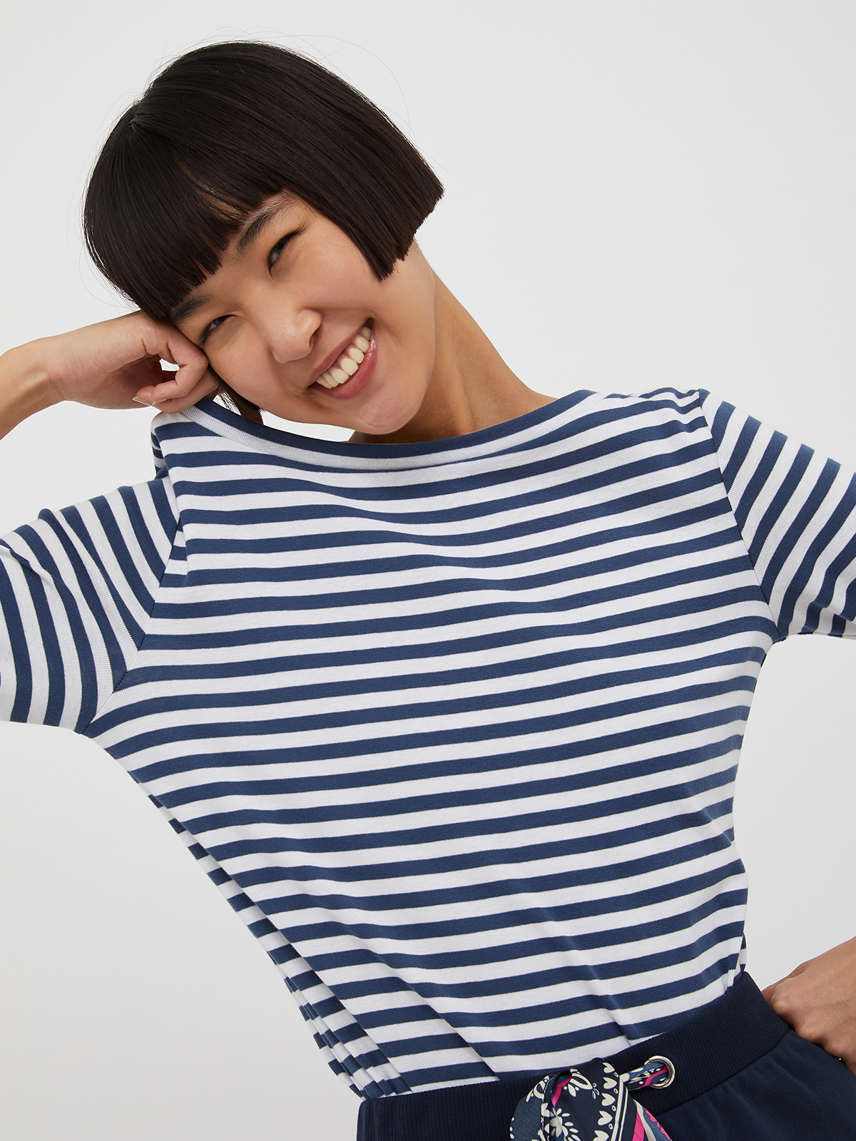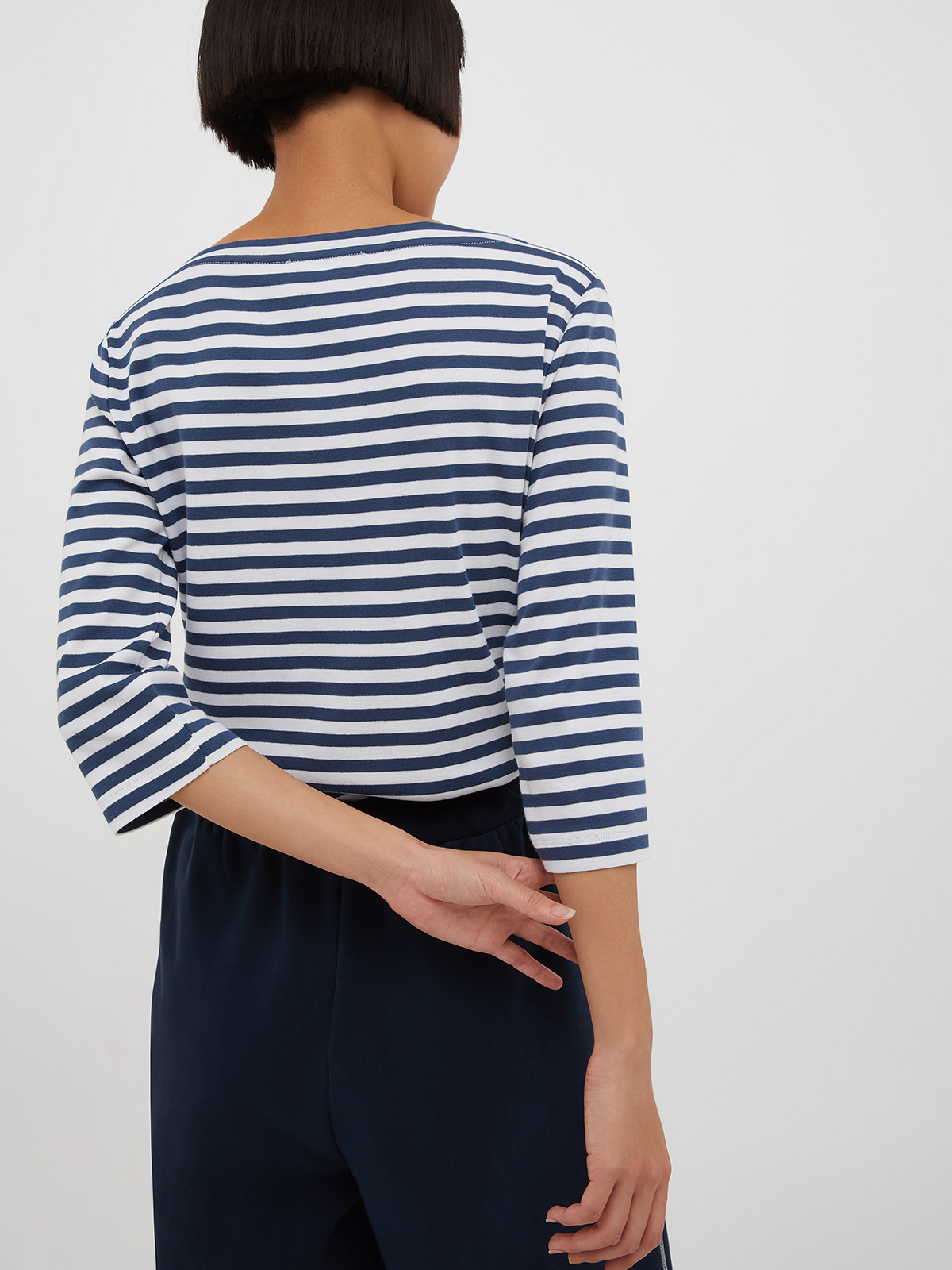 着まわしやすいボーダーのコットンジャージーTシャツ。上質なコットンを使用した生地は、肌触りが良くコンフォートな着心地です。シルエットは、七分袖のストレートフィットで、ボートネックが首元をきれいに魅せてくれます。マリンテイスト漂うボーダーTシャツはインナーとしても、1枚でもコーディネートの主役になり合わせやすいアイテムです。<ポケット>なし<スタイル>ボートネック