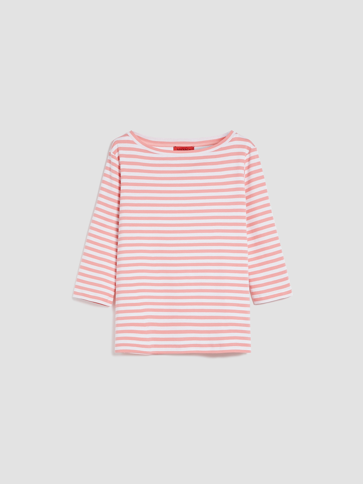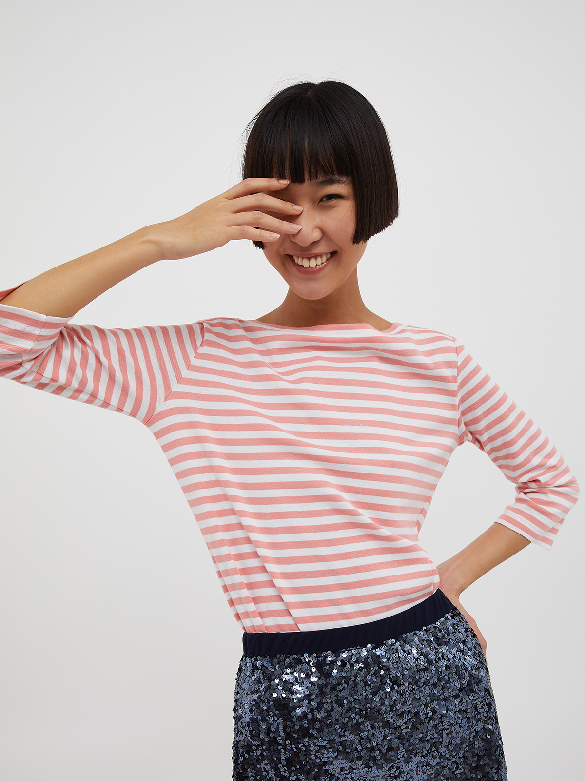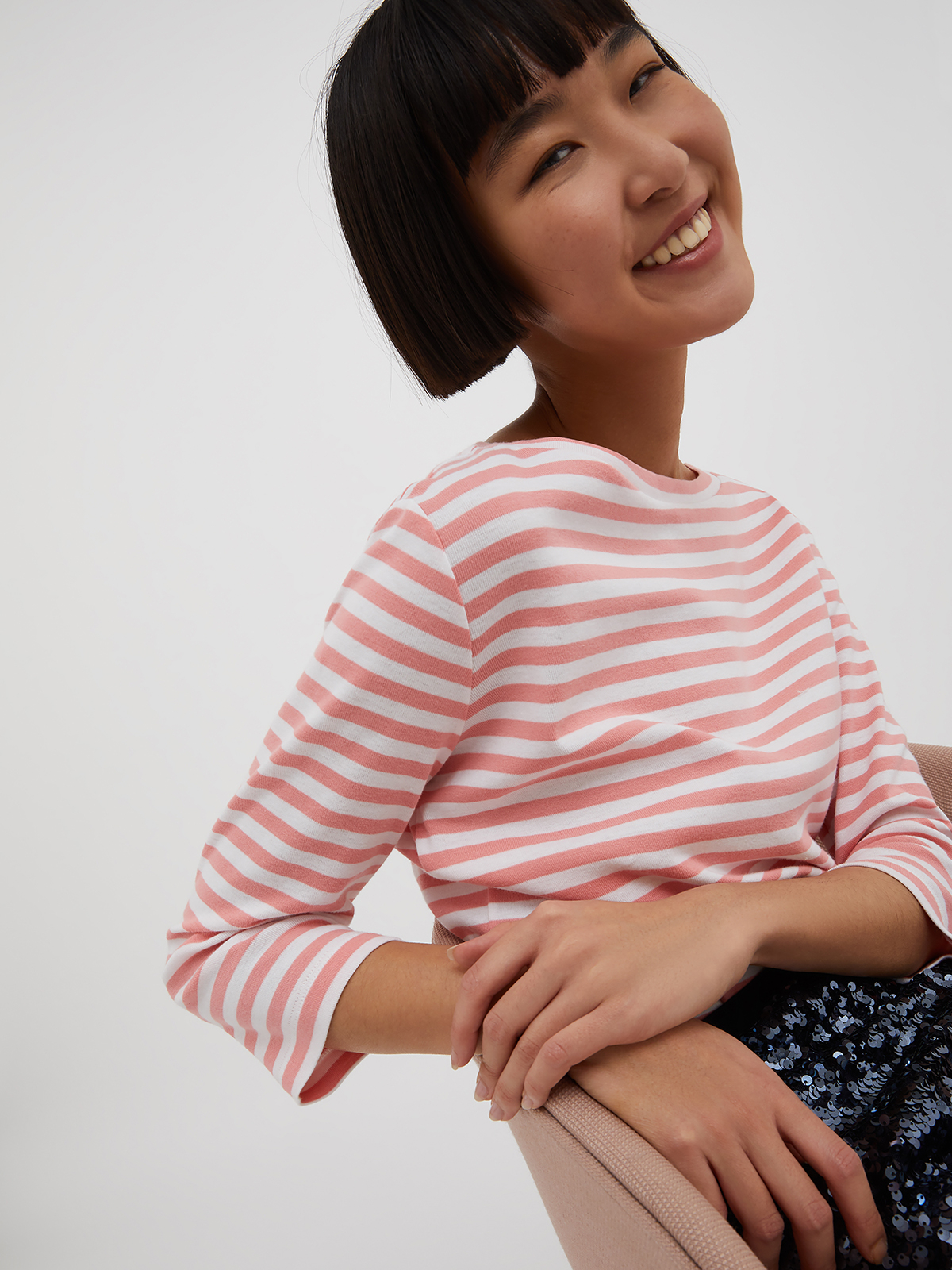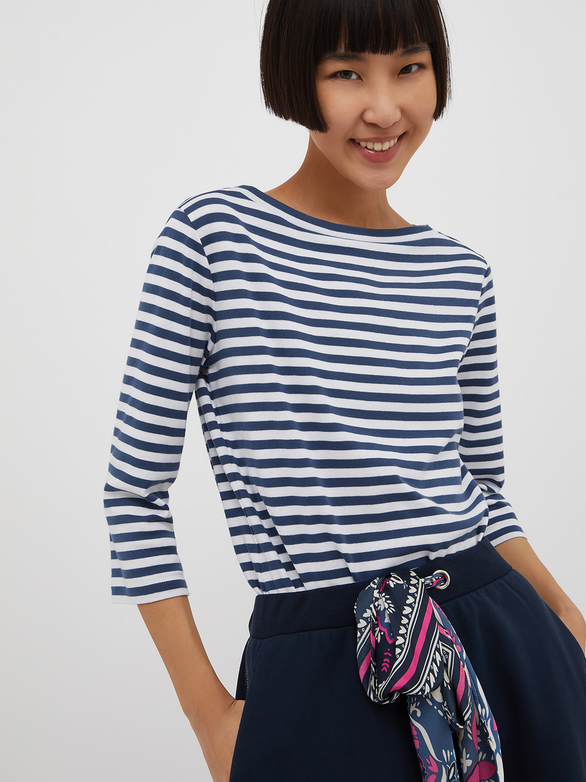 着まわしやすいボーダーのコットンジャージーTシャツ。上質なコットンを使用した生地は、肌触りが良くコンフォートな着心地です。シルエットは、七分袖のストレートフィットで、ボートネックが首元をきれいに魅せてくれます。マリンテイスト漂うボーダーTシャツはインナーとしても、1枚でもコーディネートの主役になり合わせやすいアイテムです。<ポケット>なし<スタイル>ボートネック