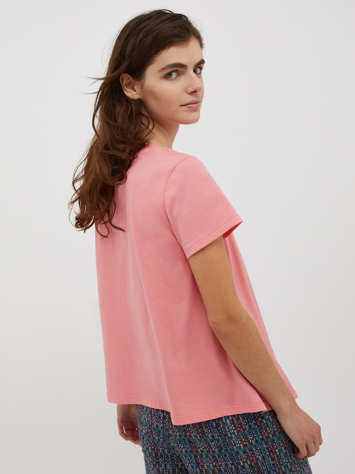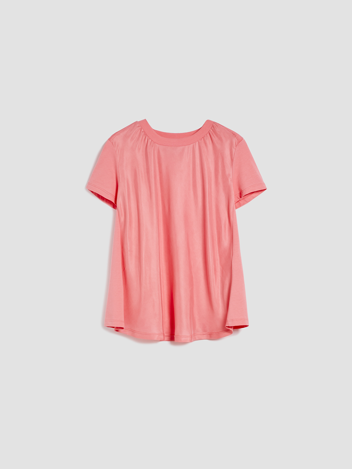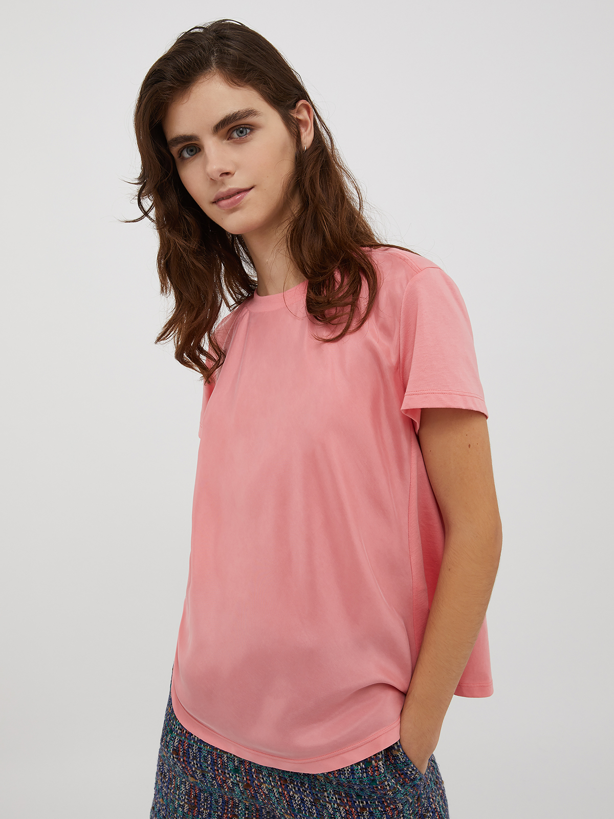 流れるようなフリュイド感が綺麗なTシャツ。光沢感のある生地と、コットンジャージーを使用したコンビネーションTシャツです。シルエットはラウンドネックに程よく広がるフレアシルエットで身体のラインを拾いません。単品でもジャケットやカーディガンのインナーとしても合わせやすく、幅広いコーディネートでお楽しみいただけます。<ポケット>なし<スタイル>半袖