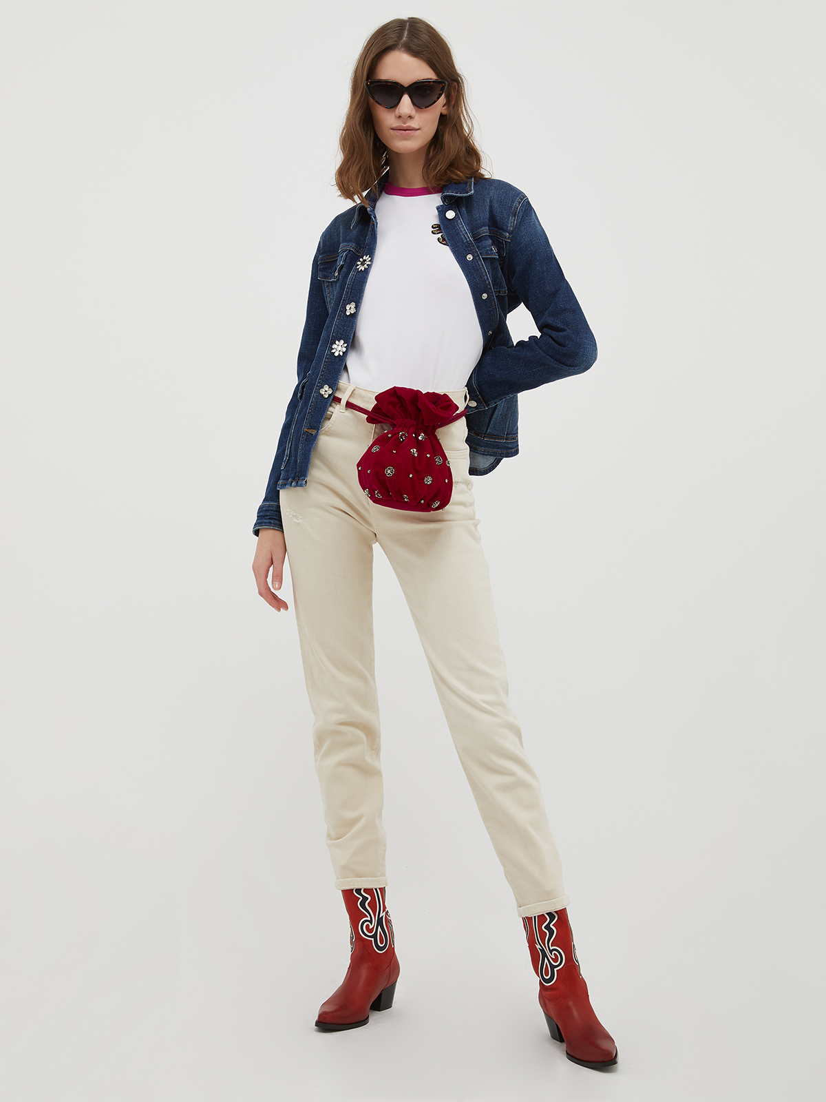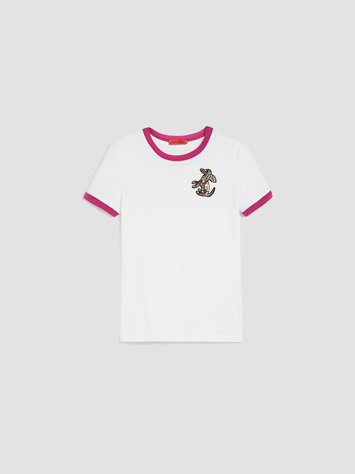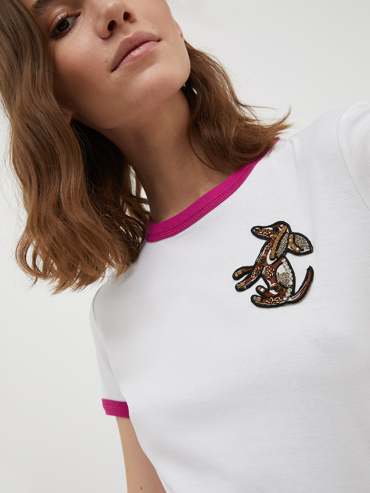 ビーズで刺繍された子犬のパッチがかわいらしいコットンTシャツ。肌触りの良いコットン100%の生地は清涼感があり、シーズンレスで楽しめるアイテムです。シルエットは、ラウンドネックのスリムフィット。コントラストカラーでトリミングされ、少しレトロな仕上がりになっています。1枚でコーディネートの主役になるTシャツは、パンツにもスカートにも合わせやすいアイテムです。<ポケット>なし<スタイル>ラウンドネック
