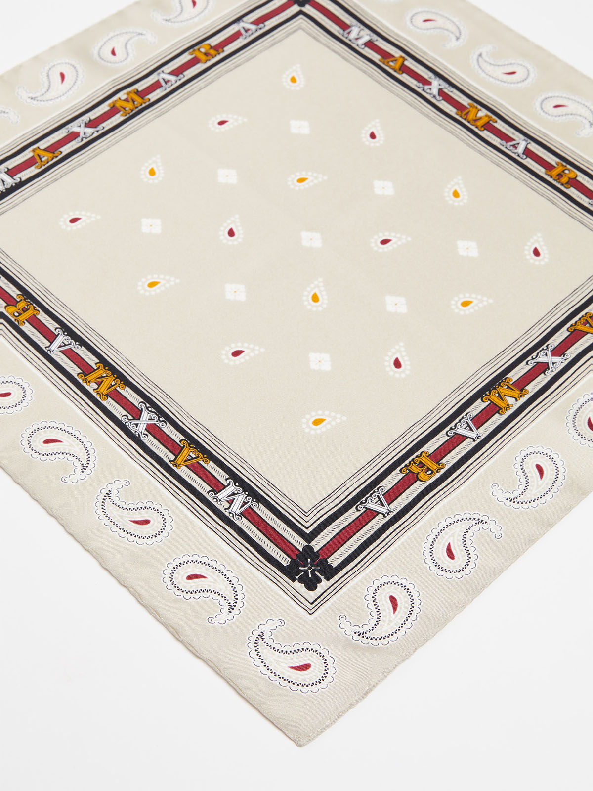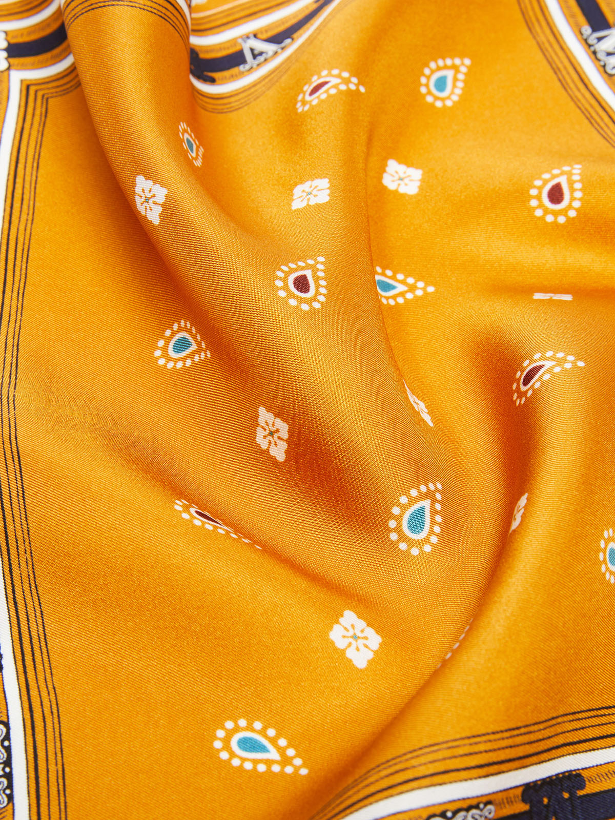 クラシカルなレタリングロゴがアクセントのペイズリー柄スカーフ。光沢と滑らかなドレープ性をもつピュアシルクならではのハイエンドな仕立てが魅力的な一枚です。ややコンパクトなサイズでポケットチーフやバッグのワンポイントとして活躍。カジュアルなスタイルからエレガントな装いまで幅広く活躍してくれるアイテムです。