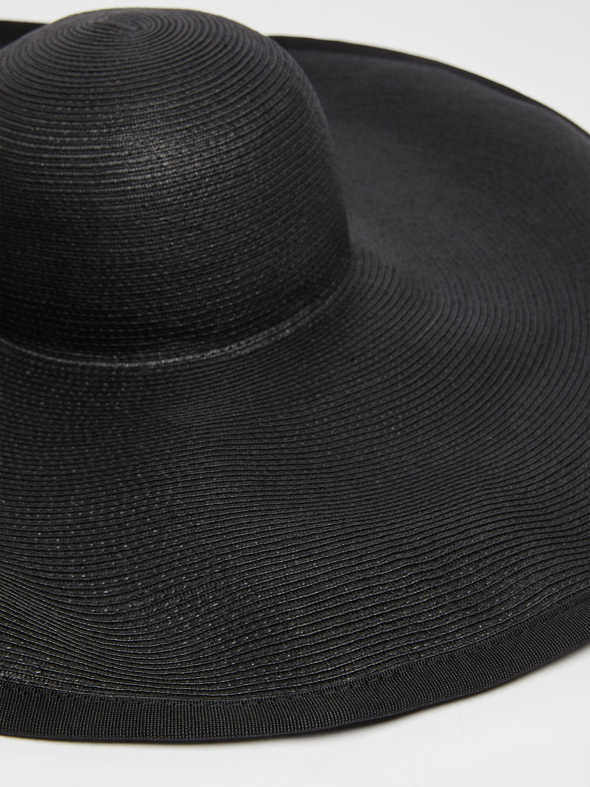 ペーパーテキスタイルのサンハット。 ストローハットに比べて色がしっかりと染まるペーパー素材を使用し、シックなブラックカラーが特徴的です。 陽射しを除けてくれるつばの広いデザインながらも、軽やかな着用感に仕上がっています。