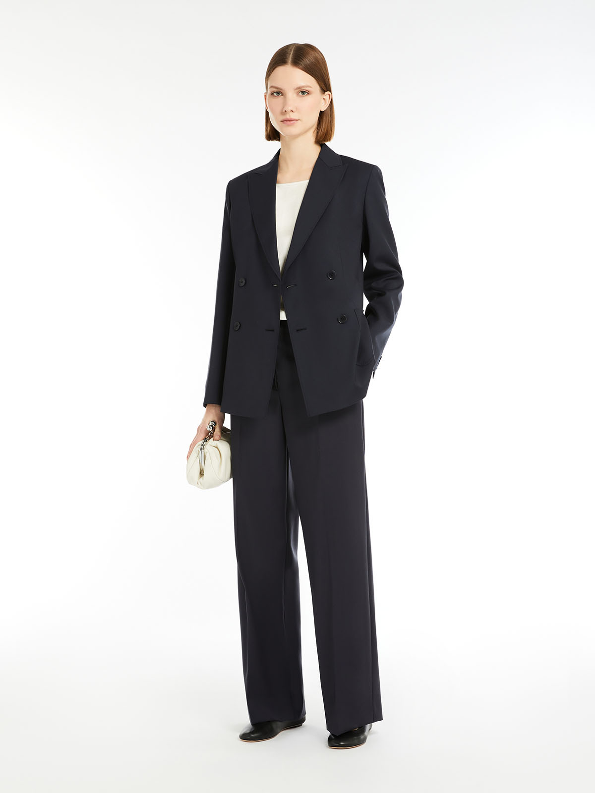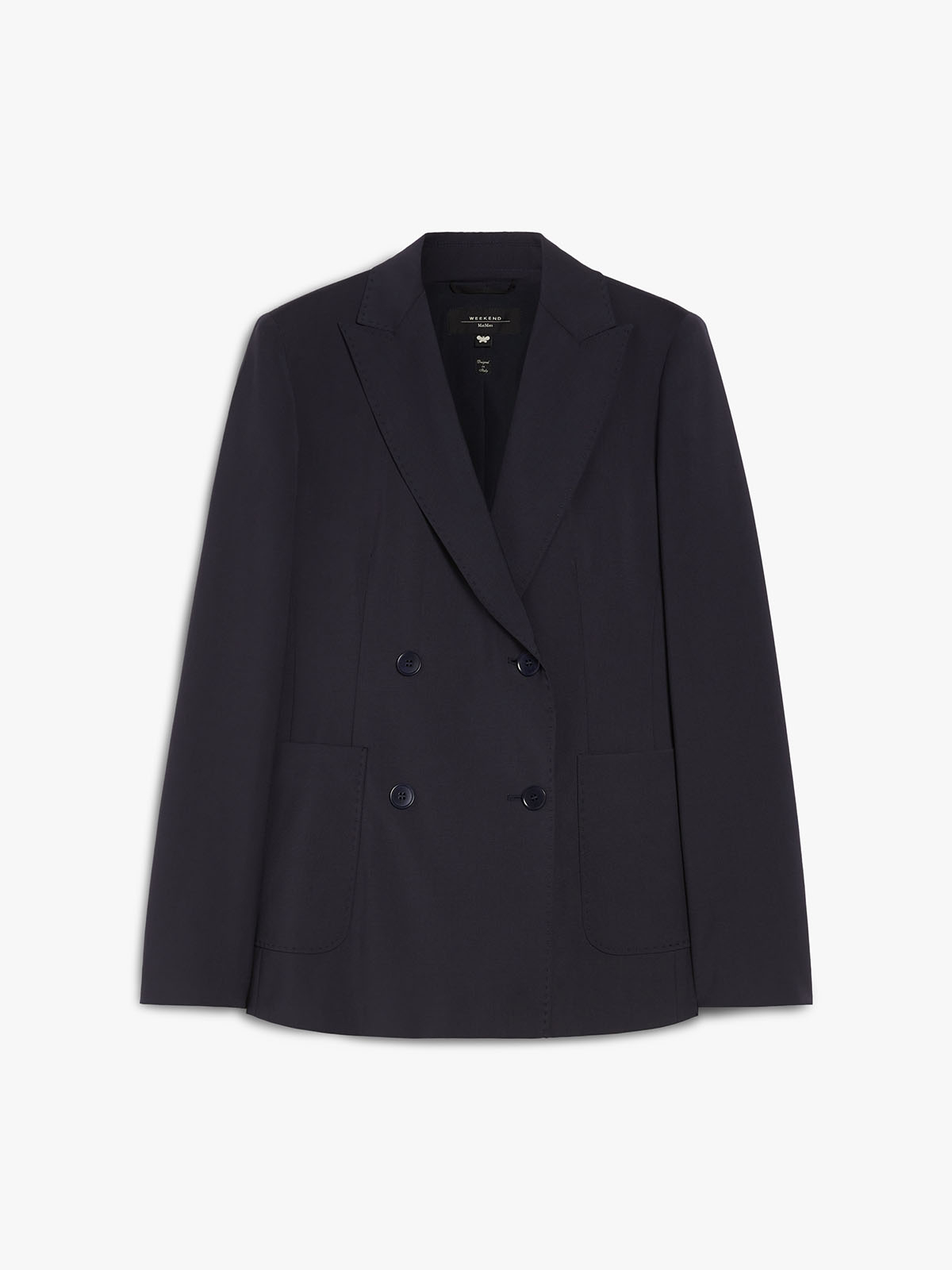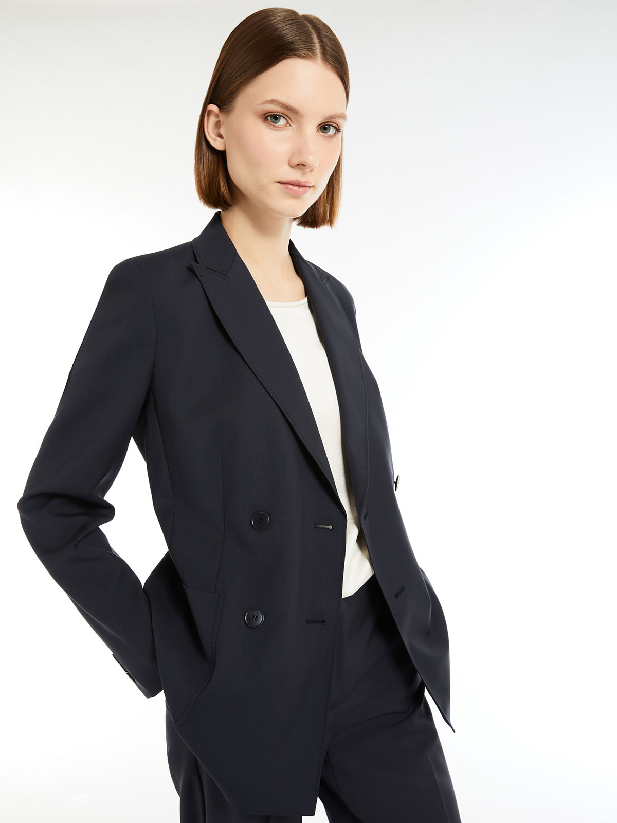 シャープなシルエットに仕上げたダブルブレストブレザー。