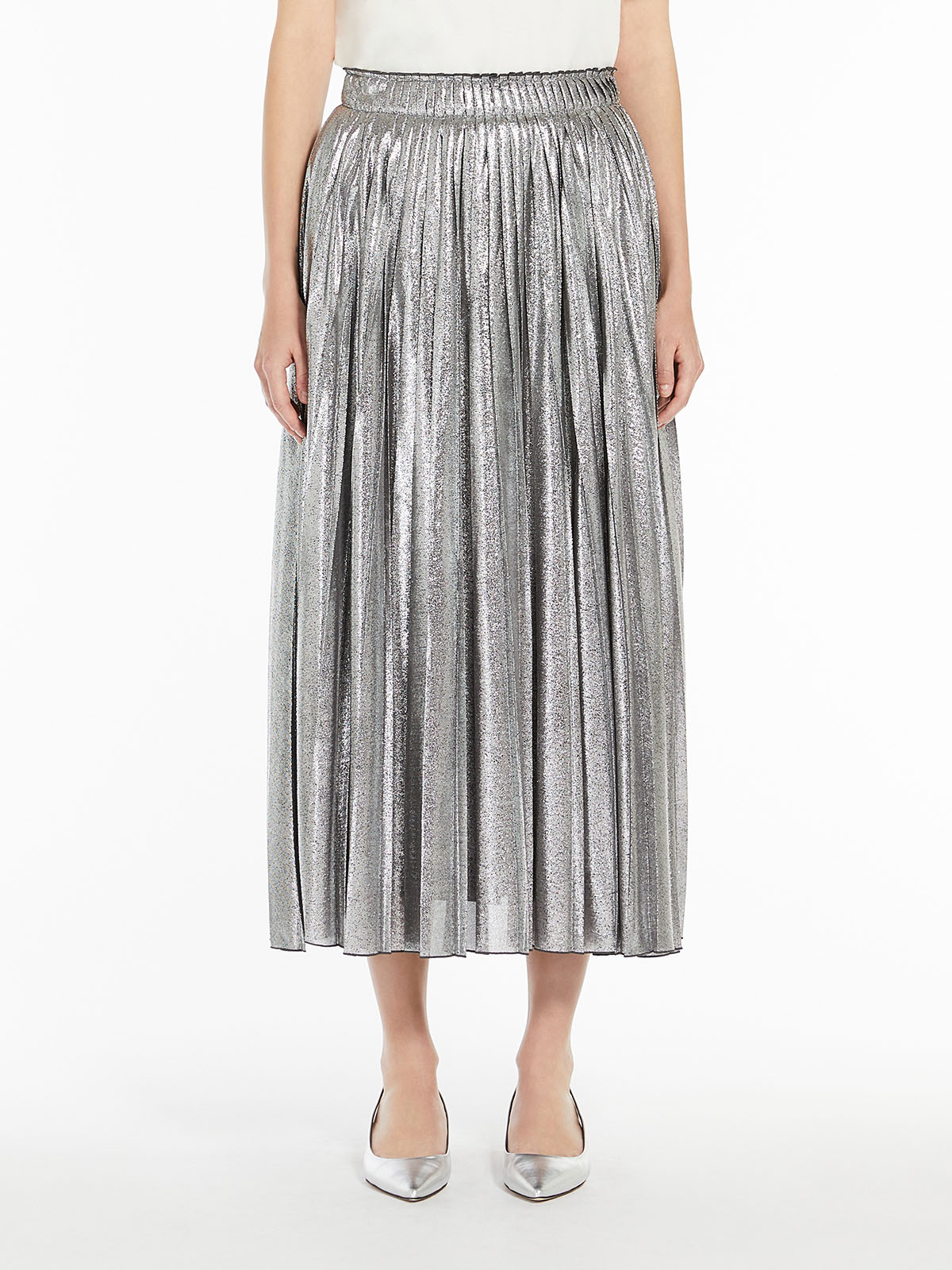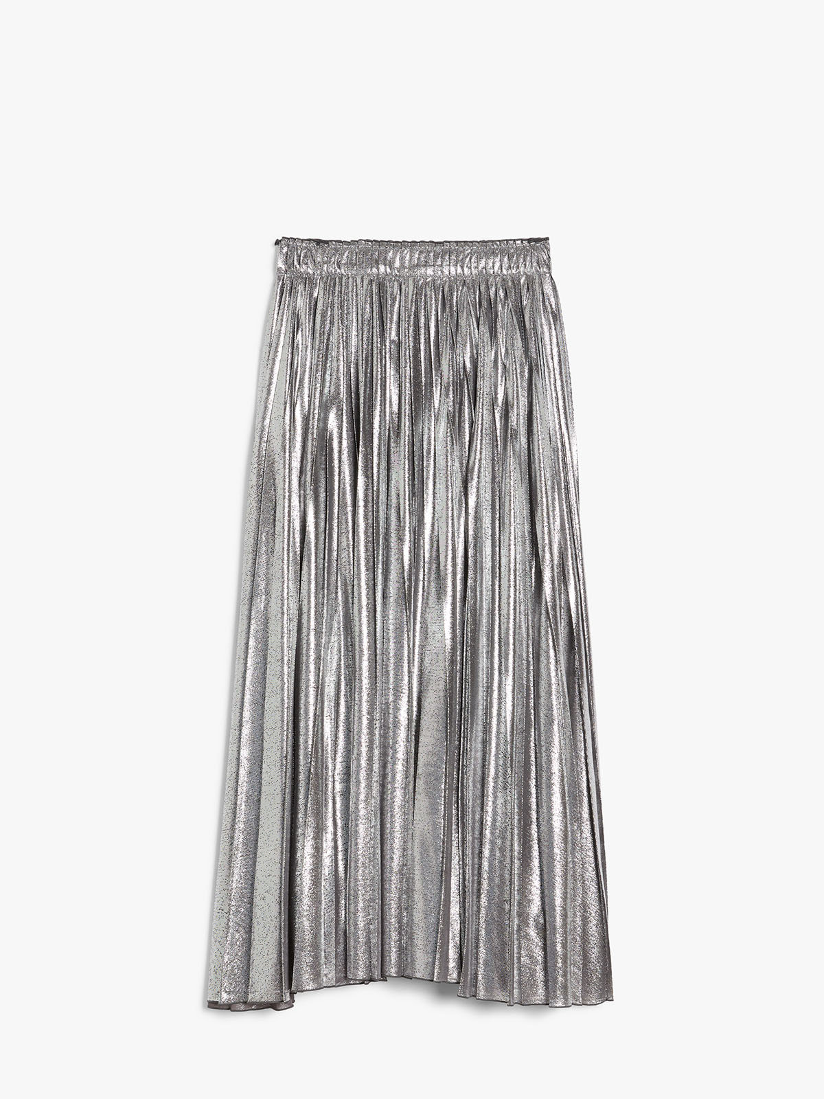 シルバーカラーが華やかでスタイリッシュな印象のロングスカート。
