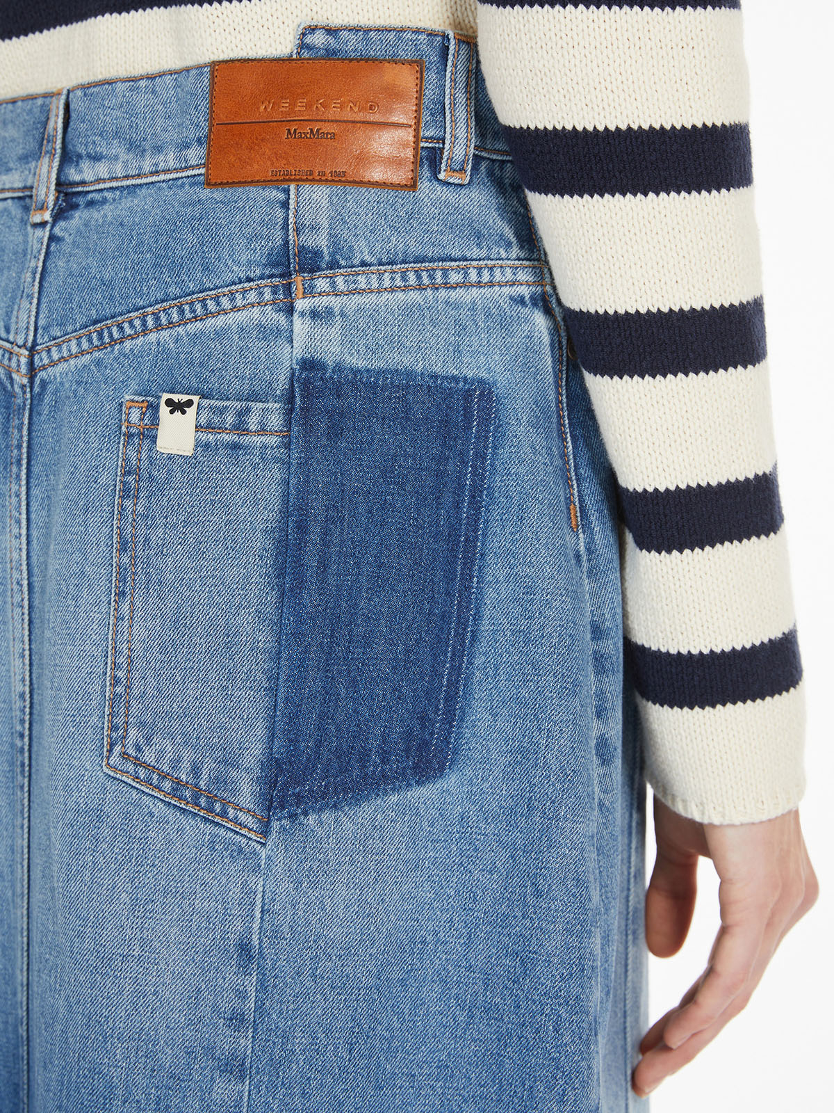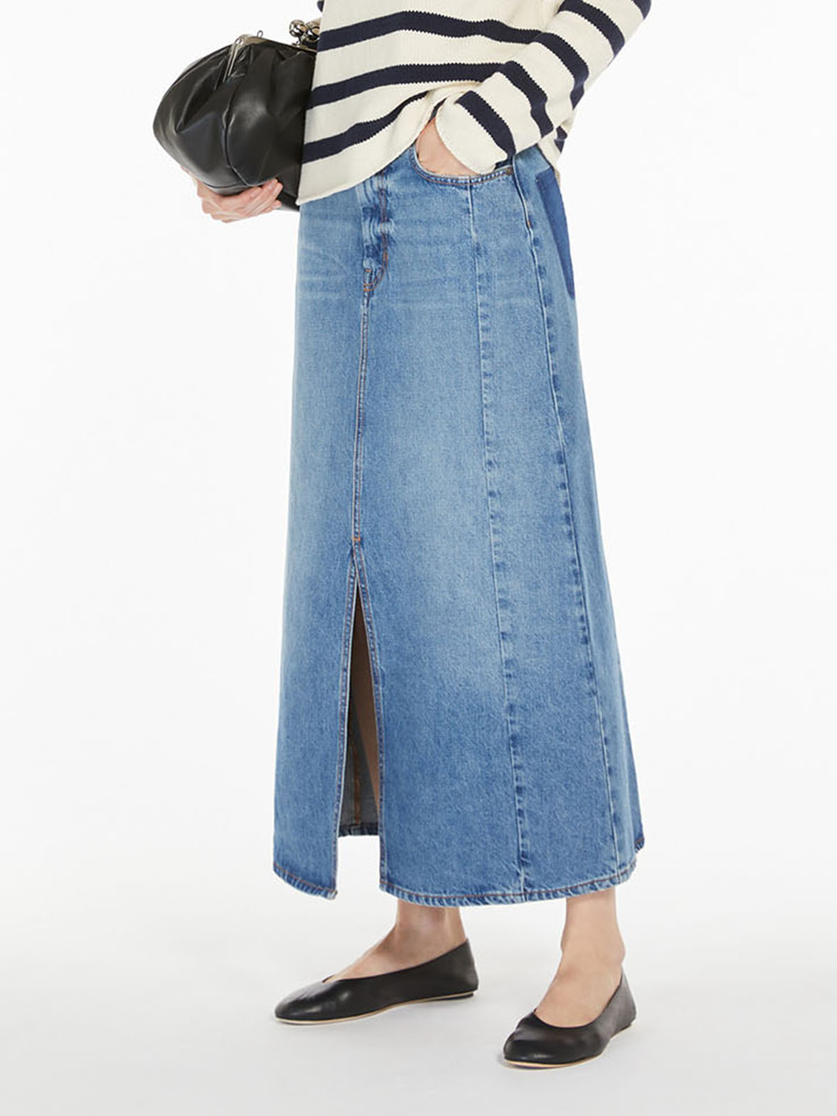ベーシックなシルエットに仕上げたロングデニムスカート。ピュアコットンのインディゴデニムはビンテージ風の色落ちと風合いが特徴です。シルエットは、ストレートラインにフロントにスリットを入れたロングレングス。バックにバタフライのロゴプリントがさりげないアクセントに。ニットからブラウスまで幅広いトップスを合わせていただけます。<ポケット>5ポケット<スタイル>ファスナー仕様