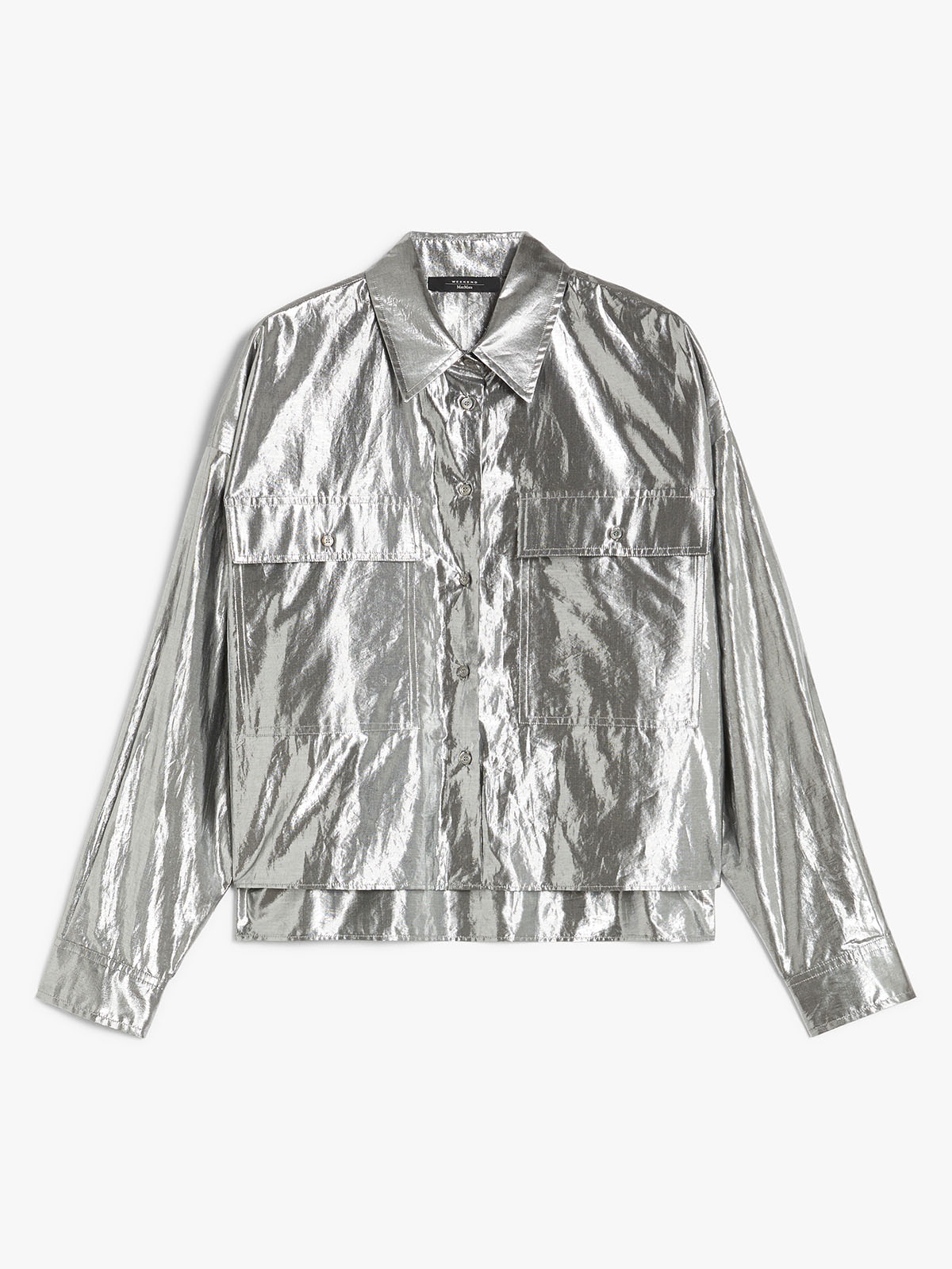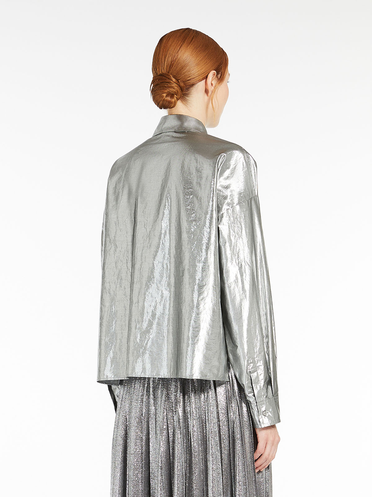 シルバーカラーが目を引くメタリックコットンシャツ。