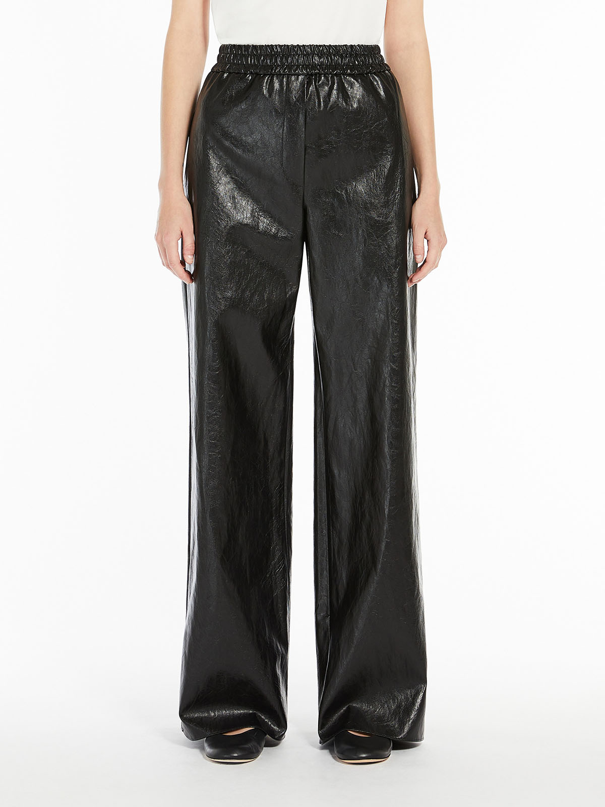 ビンテージ風のコーティング生地を使用したパラッツォパンツ。レザー調に仕上げ、しなやかで柔らかな着用感が特徴的です。シルエットは、調整可能なドローストリングを付きのウエストバンドに、ゆったりとしたワイドレッグのストレートライン。いつものニットやブラウスとのスタイリングにアクセントをプラスしてくれるアイテムです。<ポケット>バックに玉縁ポケット<スタイル>ゴムバンド仕様
