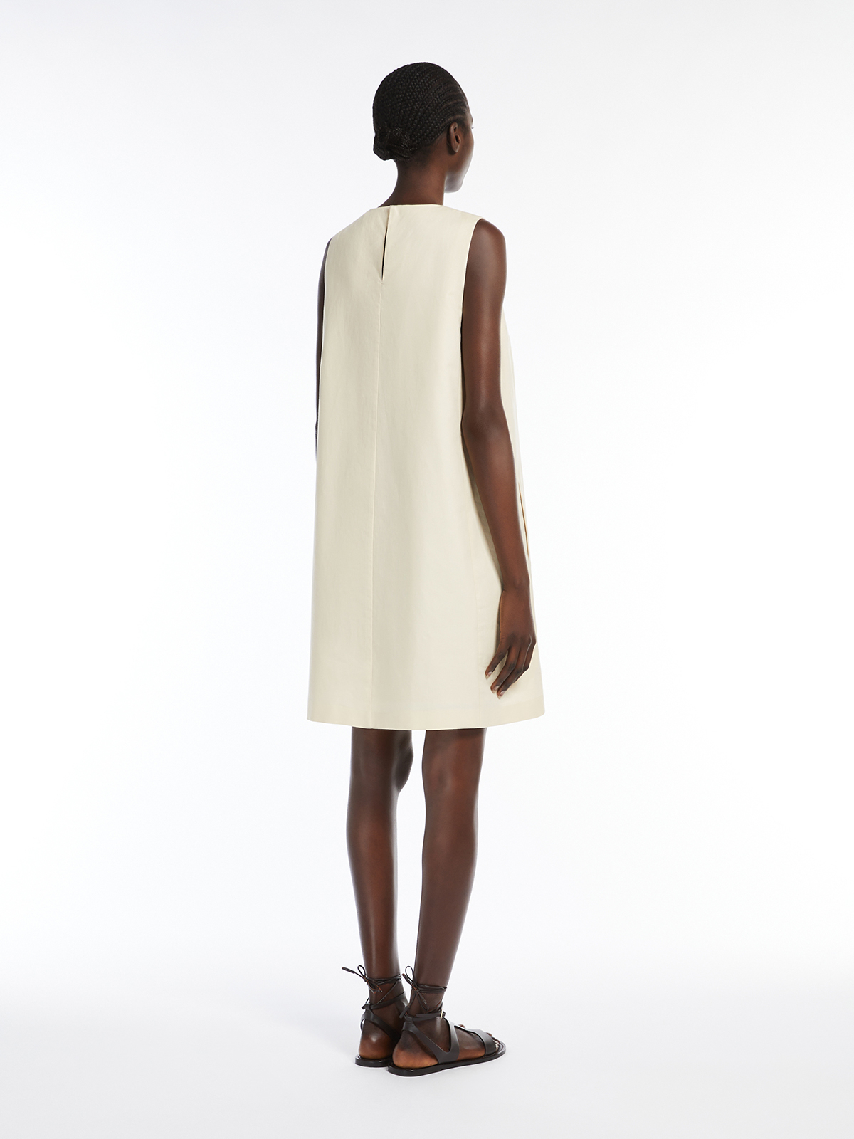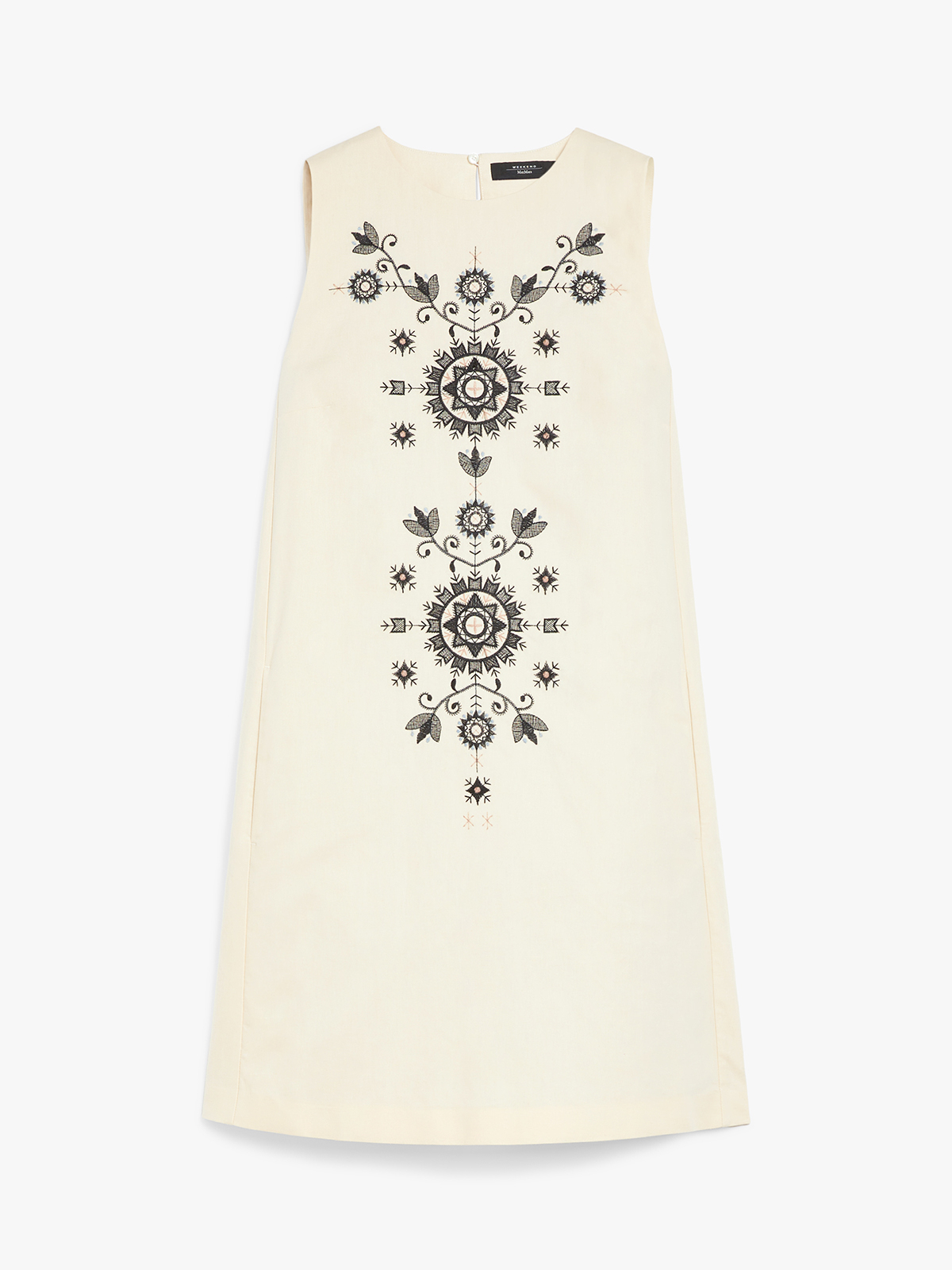 フロントのコントラストの効いた装飾的な刺繍が目を引くスリーブレスドレス。
