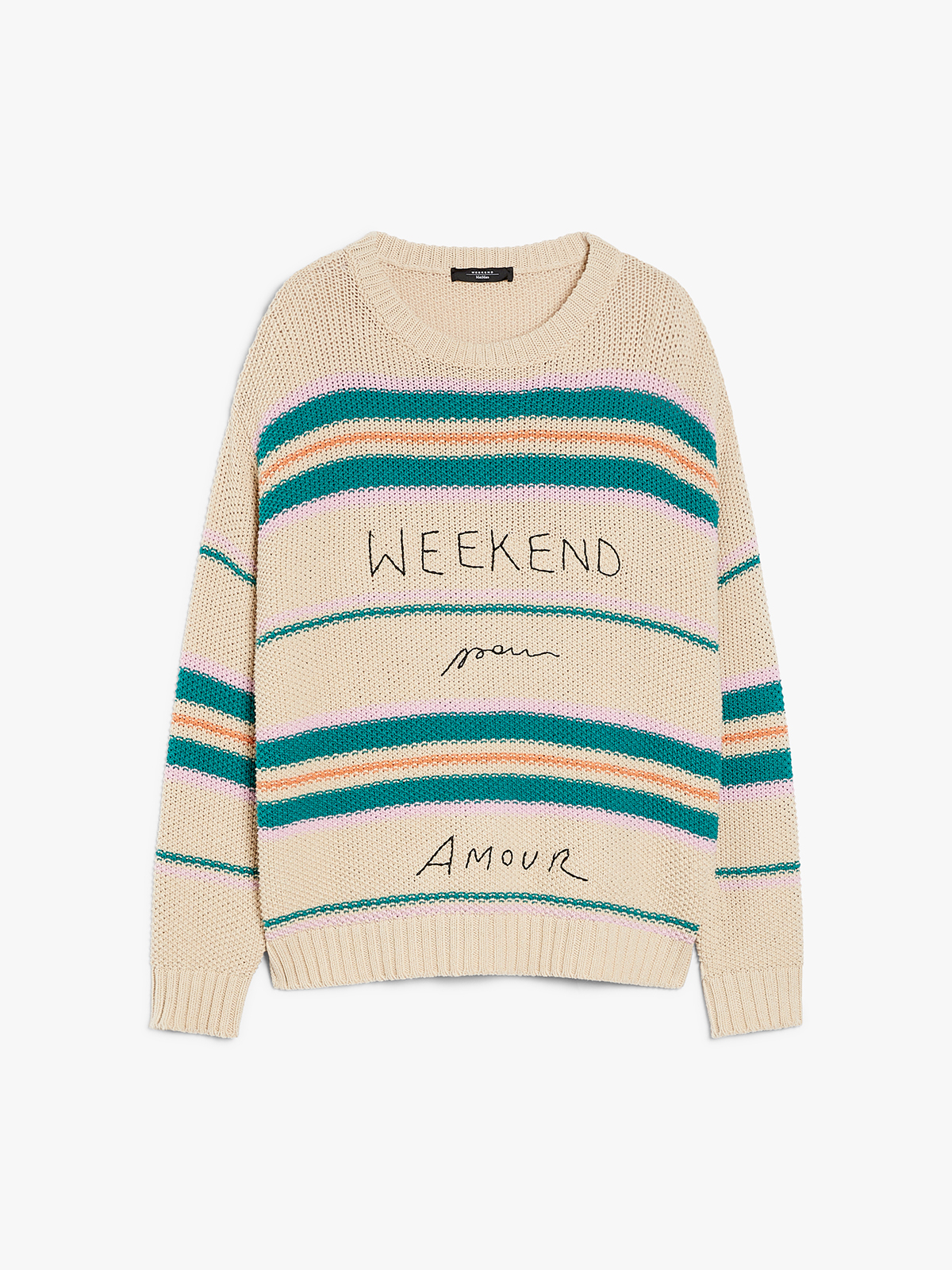 ストライプモチーフとフロントのロゴ刺繍が目を惹くコットンヤーンニット。
