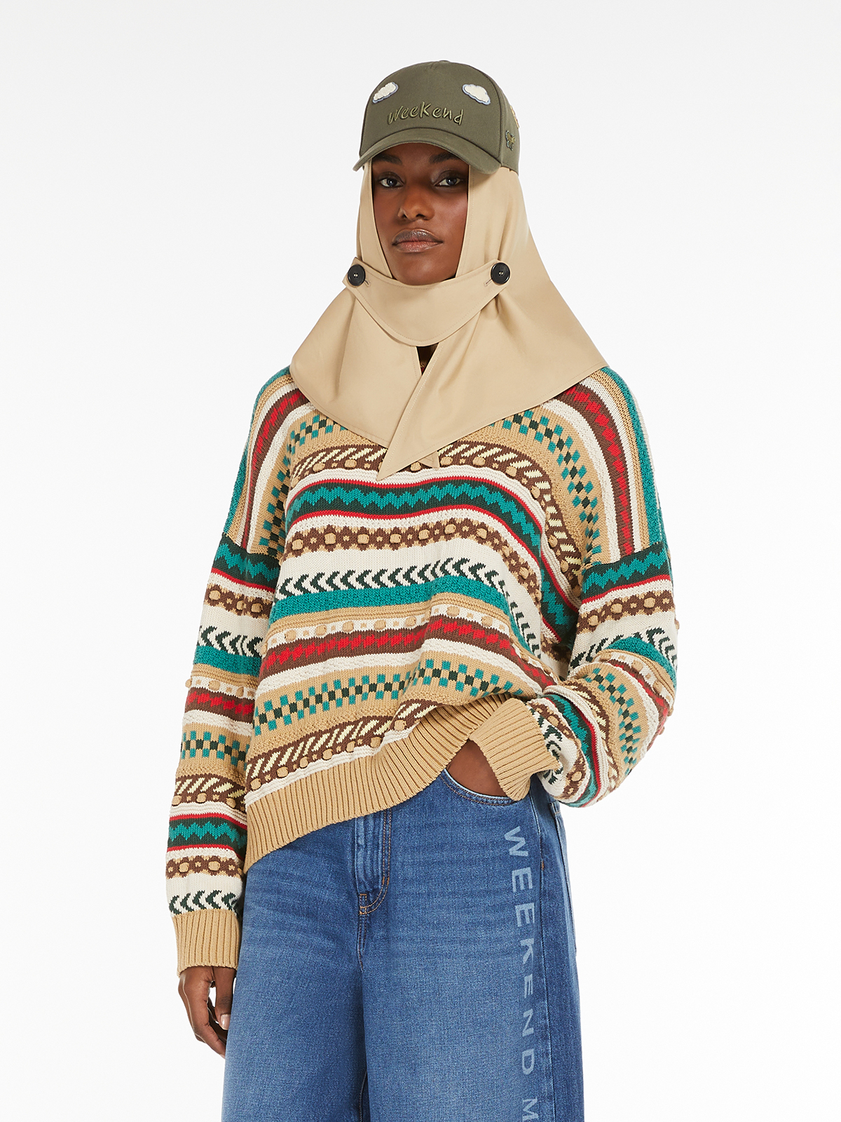 明るいマルチカラーのジャカードニット。
