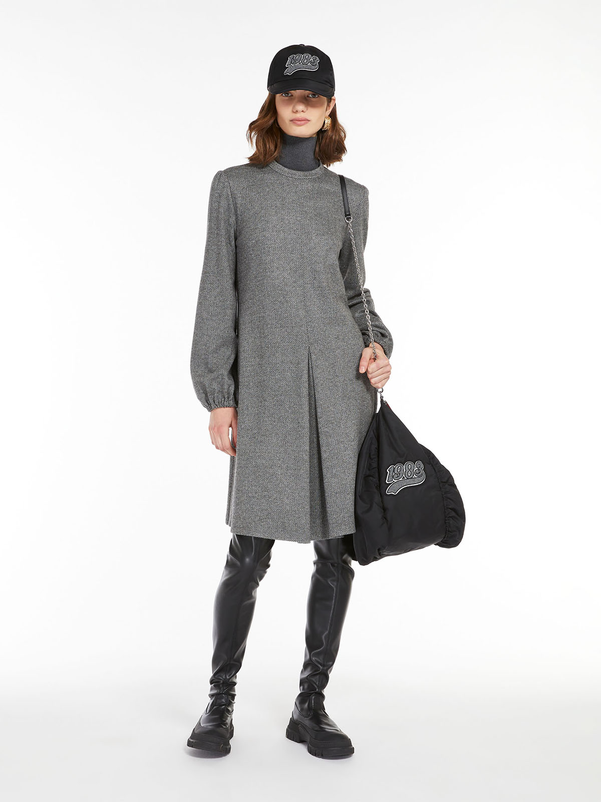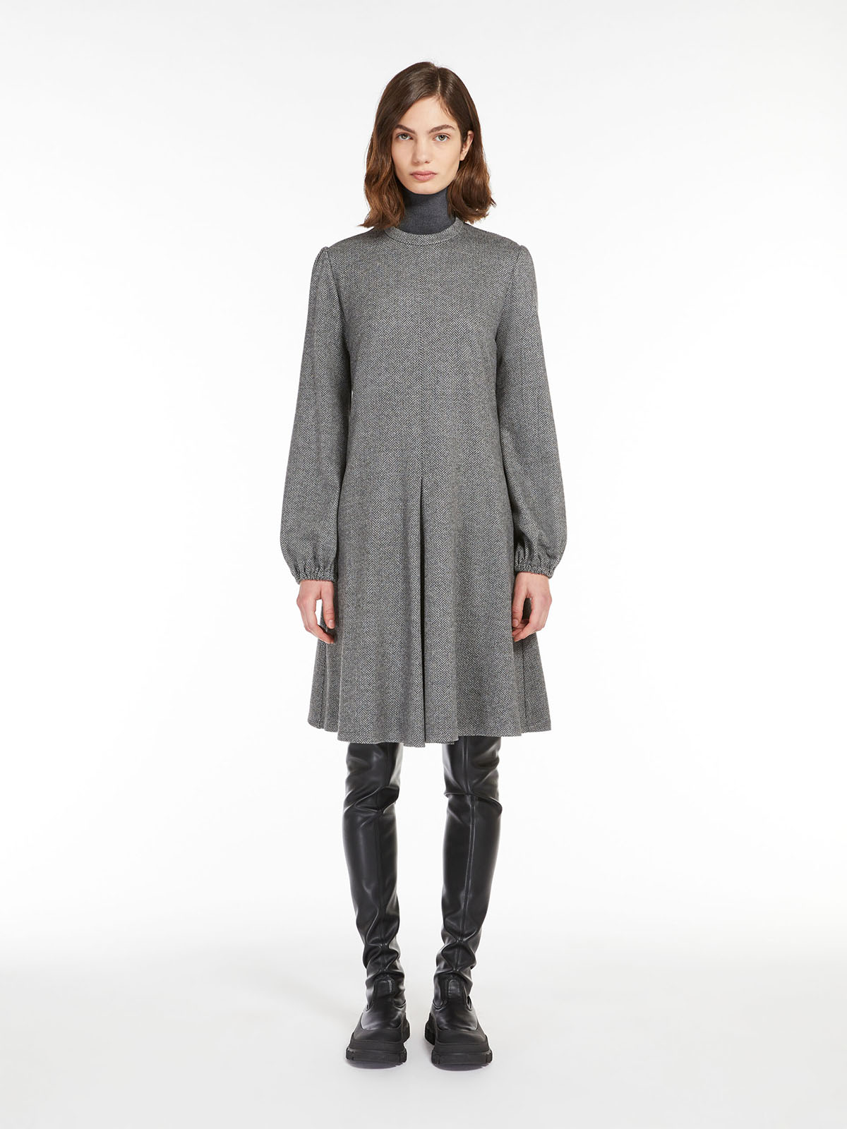 ウエストからほのかにAラインに広がるフェミニンなシルエットに、クラシカルな印象のクルーネック。