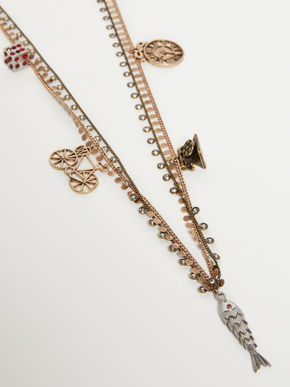 様々なレトロ風なチャームを散りばめたロングネックレス。ラインストーンやメタルパーツをあしらった2本のメタルチェーンとチャームを組み合わせ、遊び心のある仕上がりです。ドレスやシャツ、ニットなど様々なコーディネートのアクセントにお楽しみください。