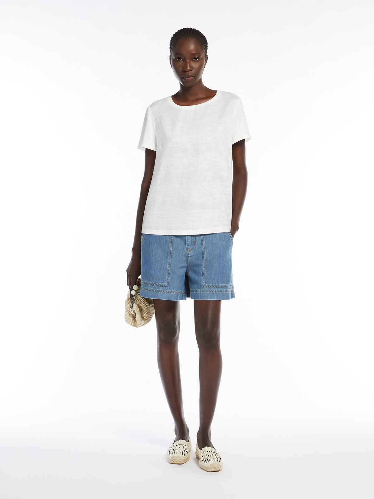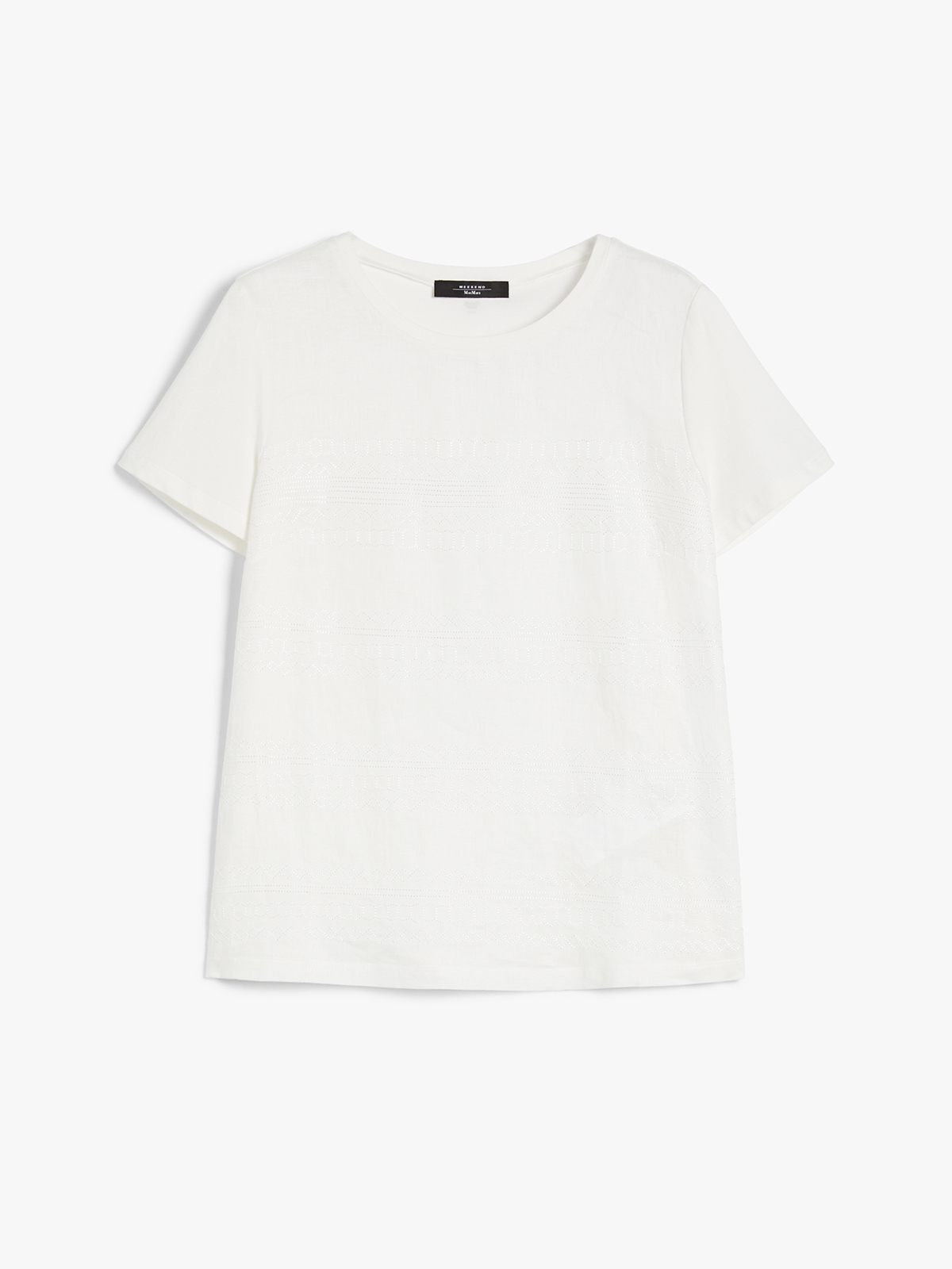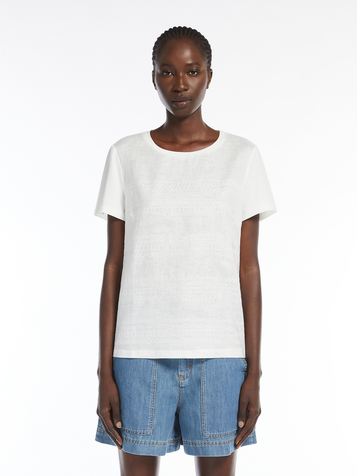 フロントに同系色の刺繍をあしらったコットンリネンTシャツ。