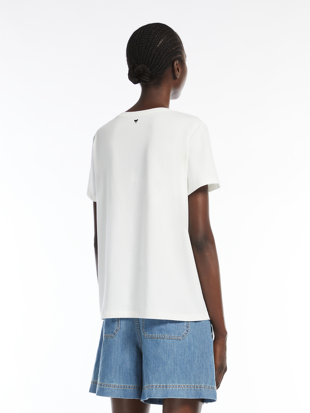 ラウンドネックの半袖に、ボディラインを拾わないゆったりとしたシルエット。