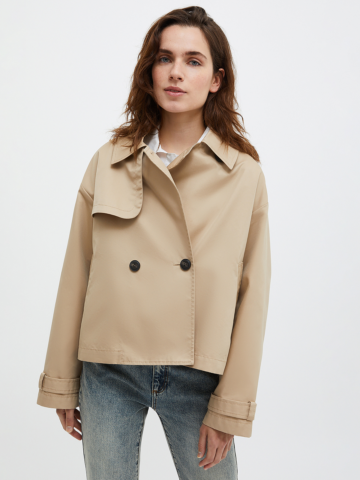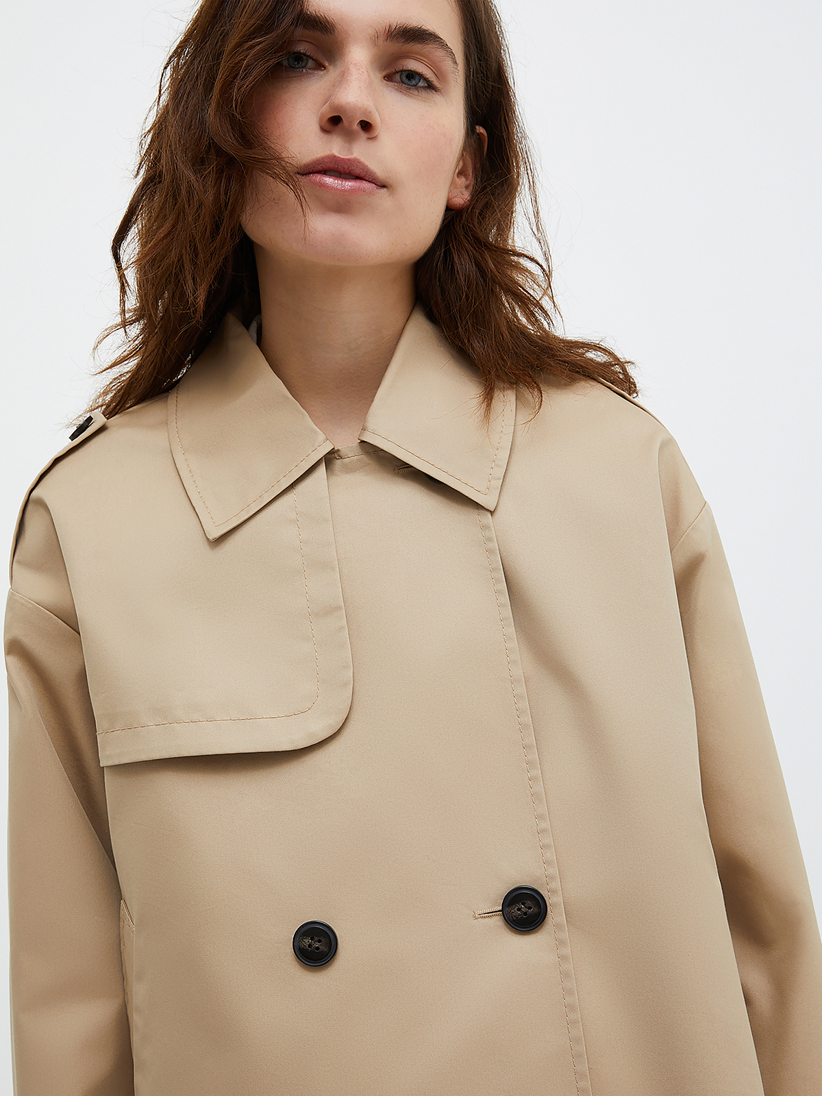 すっきりとしたクロップドバージョンに仕上げられたトレンチコート。