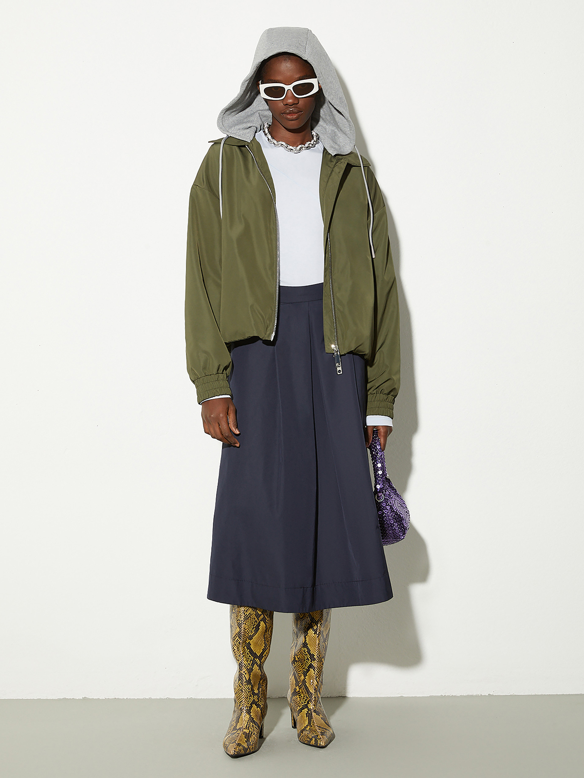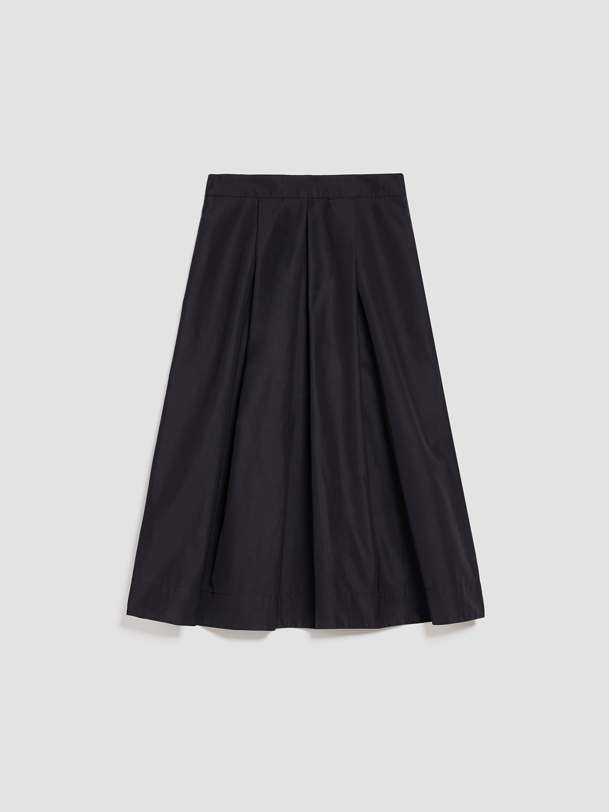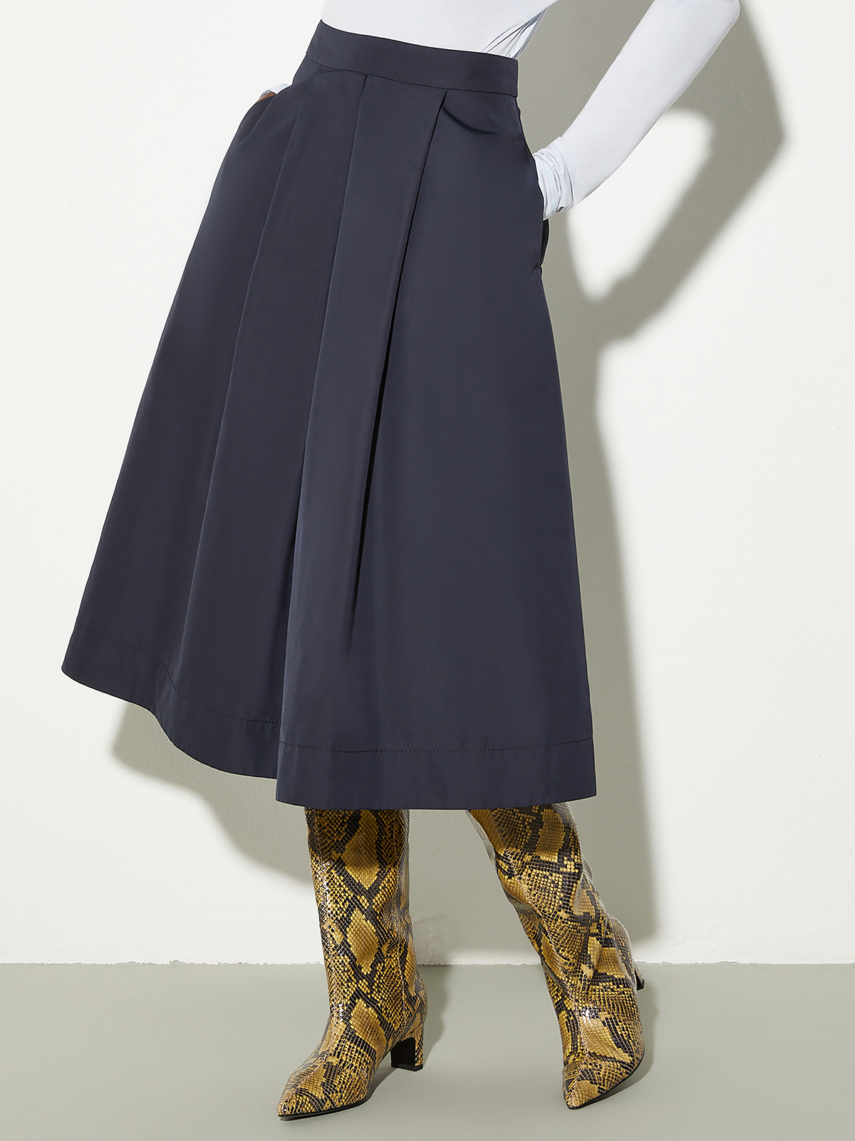 ボックスプリーツをあしらい裾に向けて広がりを持たせたフレアラインのミディレングス。