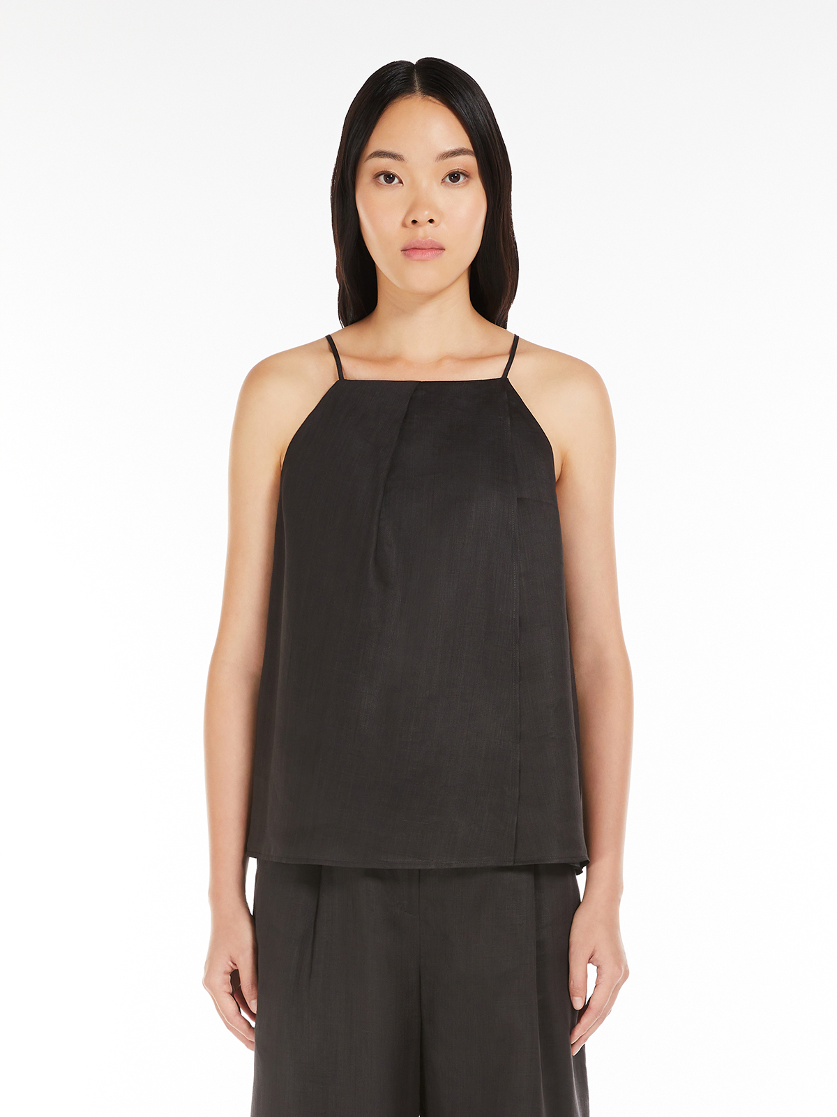 夏らしい涼やかな素材のノースリーブトップス。 薄手で軽量なラミーガーゼを使用し、盛夏でもコンフォートにお召しいただけます。 ホルターネックにややフレアなシルエットが特徴的。前身頃にはアシンメトリーなパネルが重なりさり気ないアクセントに。 スカートにもパンツにも合わせやすい着丈で、ジャケットのインナーにも最適です。 <ポケット>なし <スタイル>バックボタン留め、裏地あり