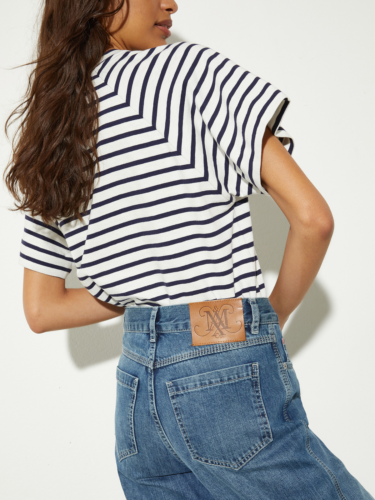 ミディアムウォッシュ加工を施したストレートレッグジーンズ。