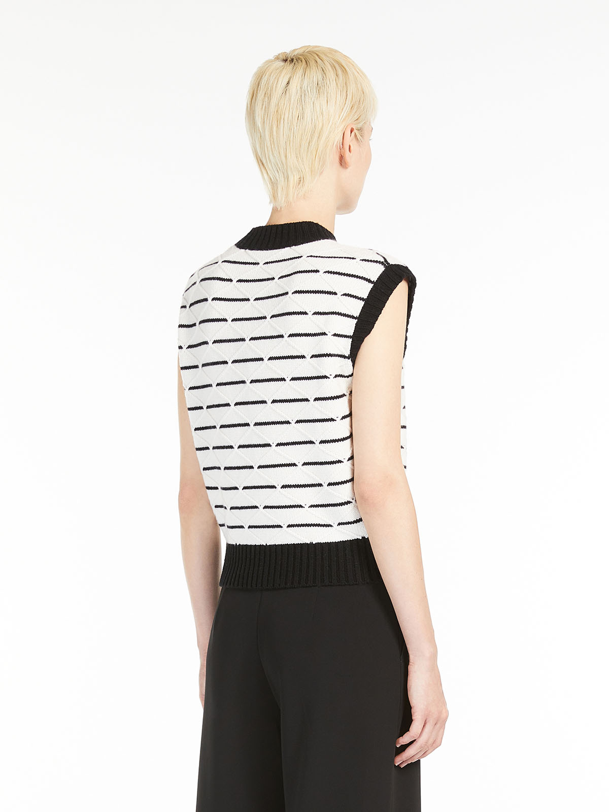 ストライプ柄と立体感のあるダイヤモンド柄をあしらったニットベスト。