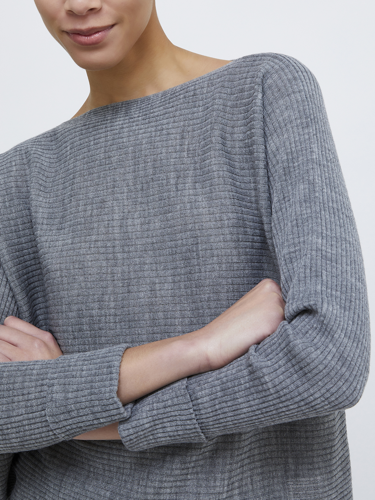 リブを横方向に配置し流れるようなキモノ風のシルエットを生み出します。