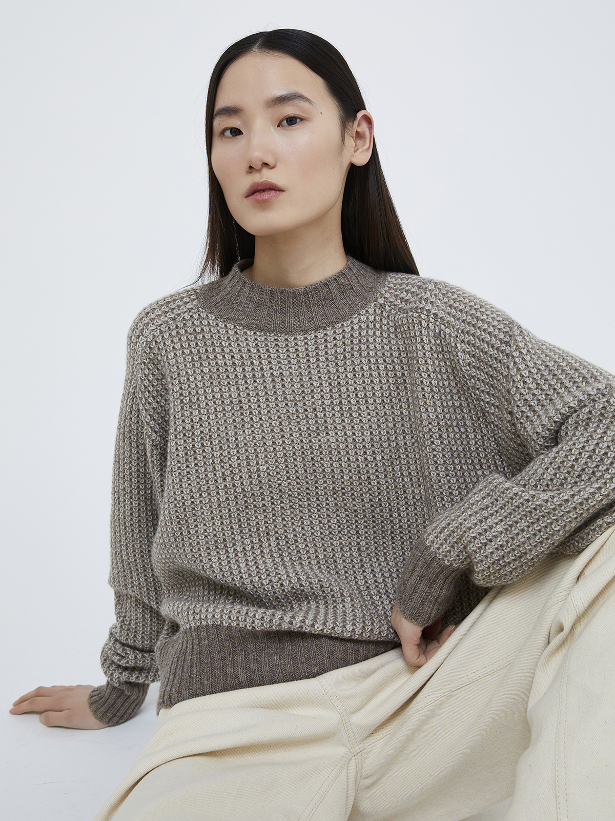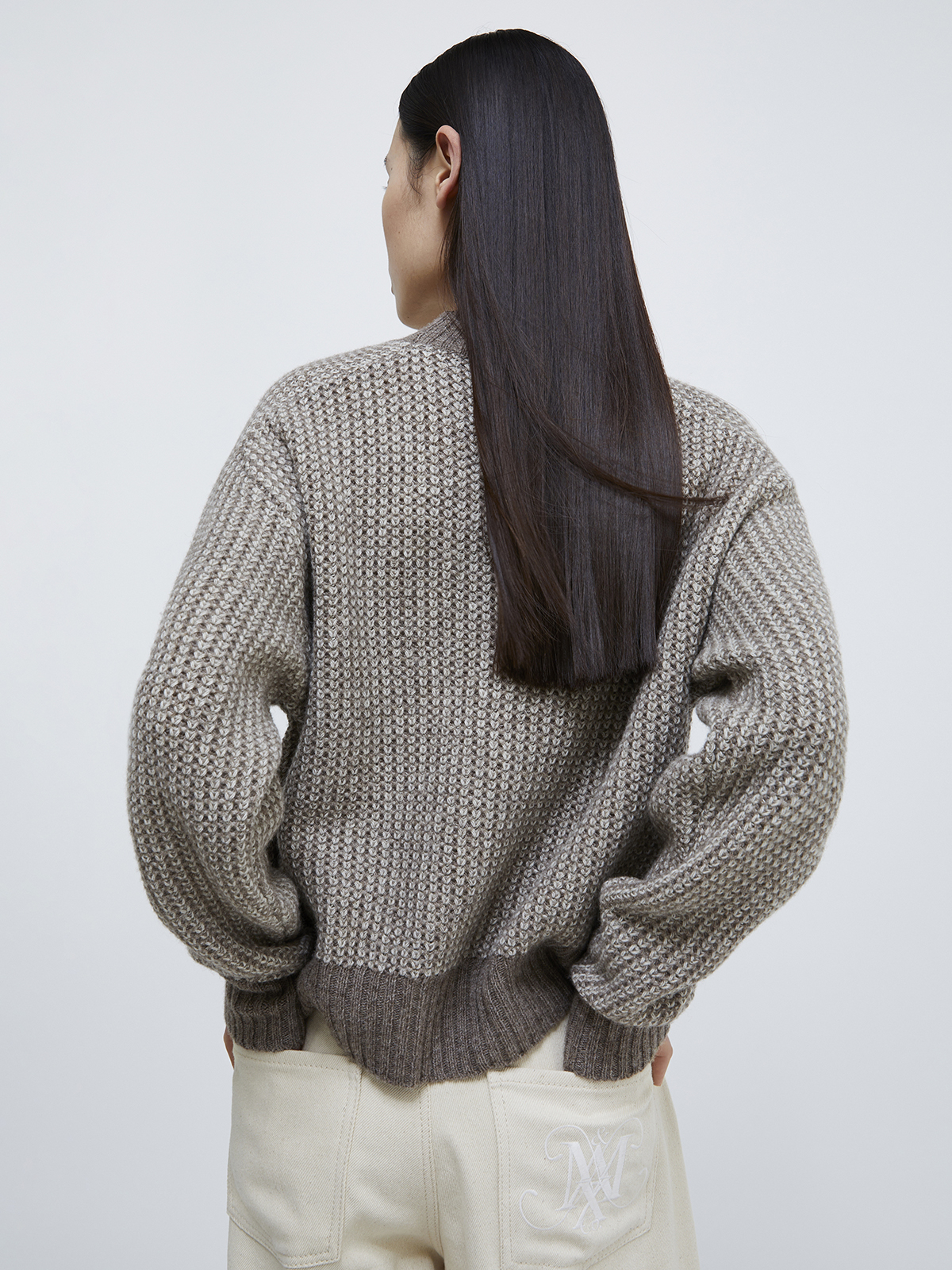 ワッフル編みのディテールが目を引くラウンドネックニット。